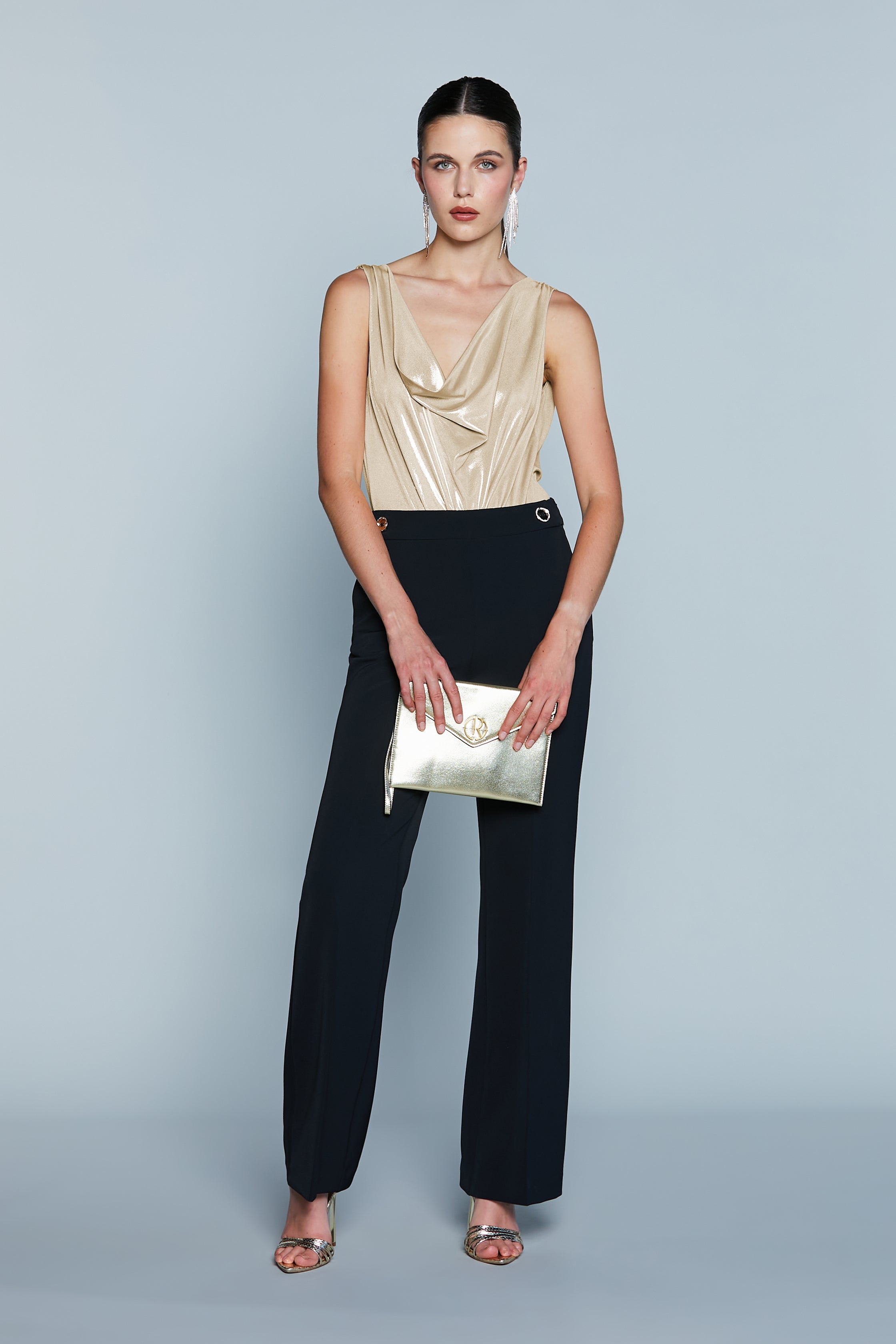 Il body VALZER senza maniche in tessuto spalmato con lurex è un capo elegante e versatile, perfetto per aggiungere un tocco di brillantezza al tuo look. La finitura spalmata dona una lucentezza raffinata e un effetto leggermente metallizzato che cattura la luce, rendendo il body ideale sia per occasioni serali che per eventi speciali. Con una silhouette aderente che valorizza la figura, questo body senza maniche si abbina facilmente a pantaloni eleganti, gonne lunghe o jeans per creare outfit sofisticati o casual-chic.