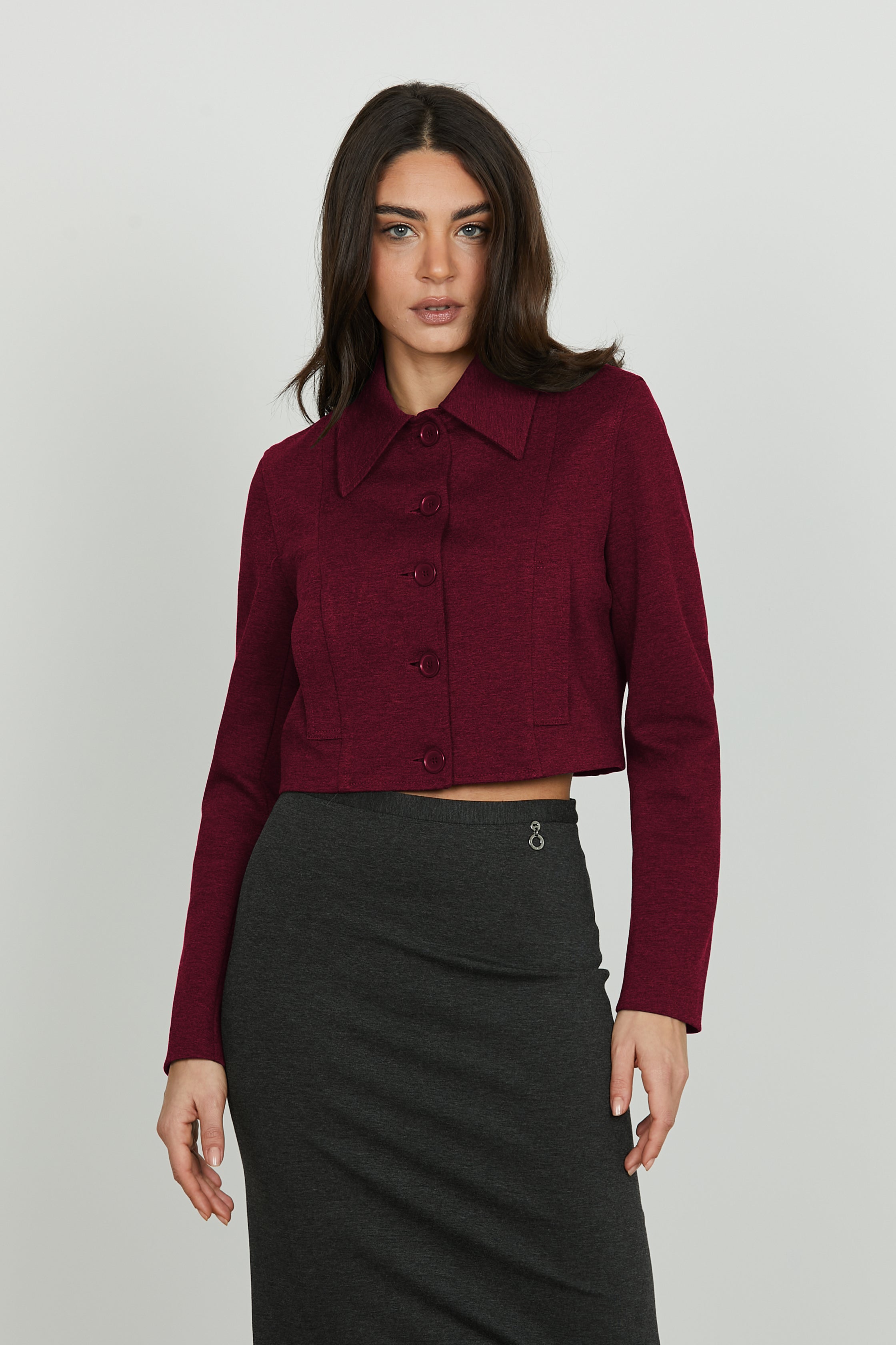 Grintosa ma raffinata, la giacca COMET è il capo corto che dona carattere a ogni look. Il design essenziale è valorizzato da bottoni e tasche frontali, per un mix perfetto tra stile e funzionalità. Il taglio corto esalta il punto vita, rendendola ideale sia su pantaloni a vita alta che su gonne o abiti.