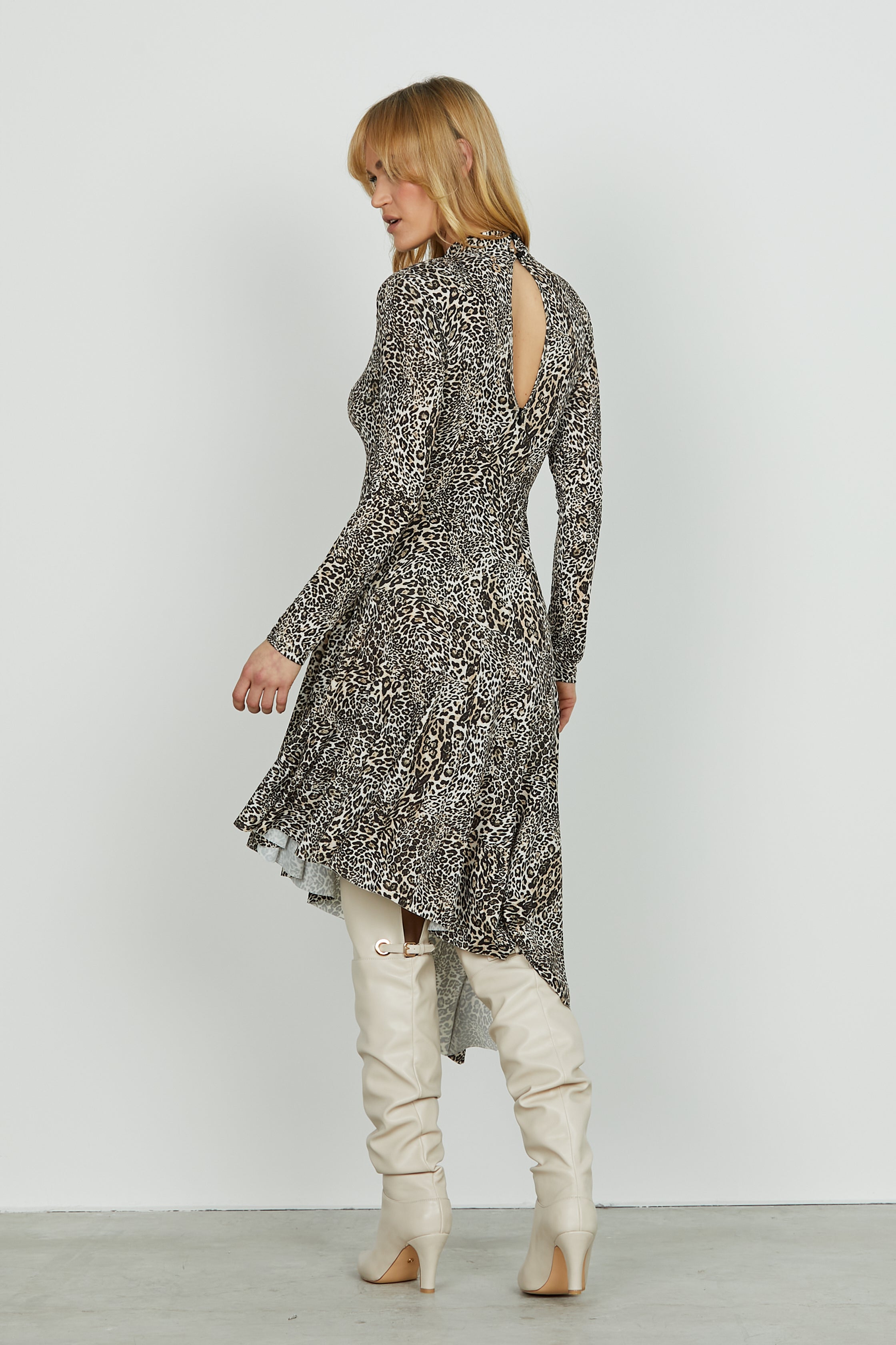 Stile audace e femminilità inconfondibile per l’ABITO LOVENY, un midi dalla fantasia animalier che cattura gli sguardi. Il colletto elegante e l’apertura a goccia sul seno aggiungono un tocco di sensualità raffinata, mentre il fondo asimmetrico dona movimento e carattere al capo. Perfetto per chi vuole farsi notare con classe.
