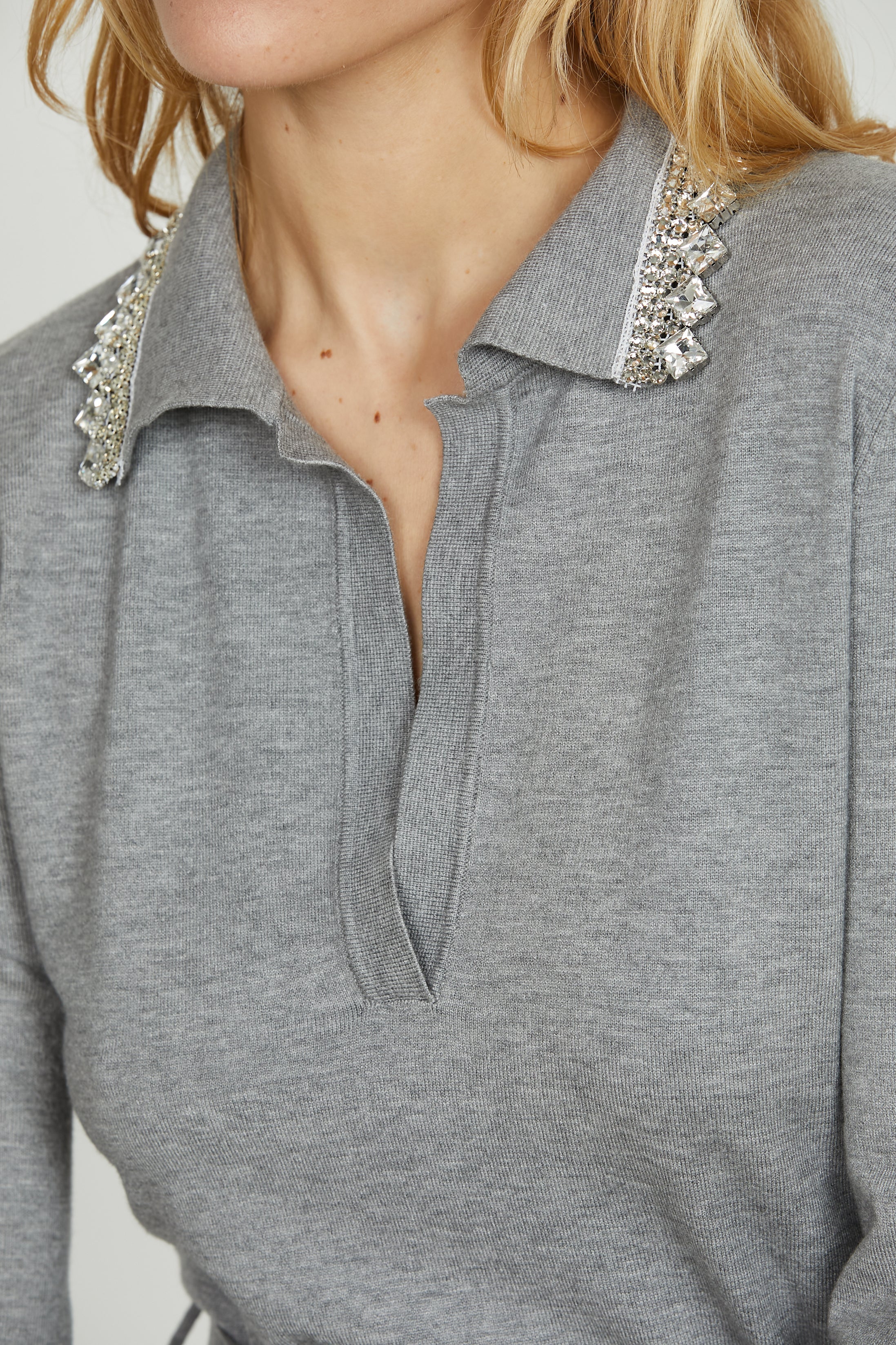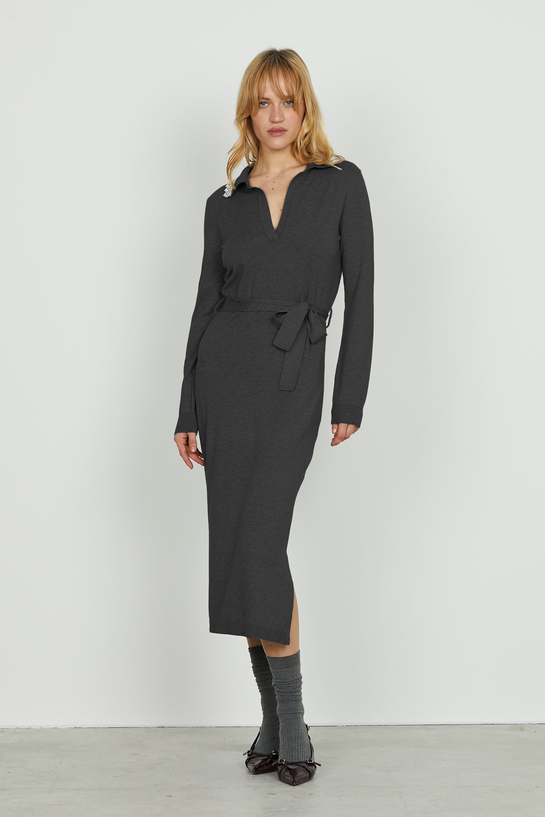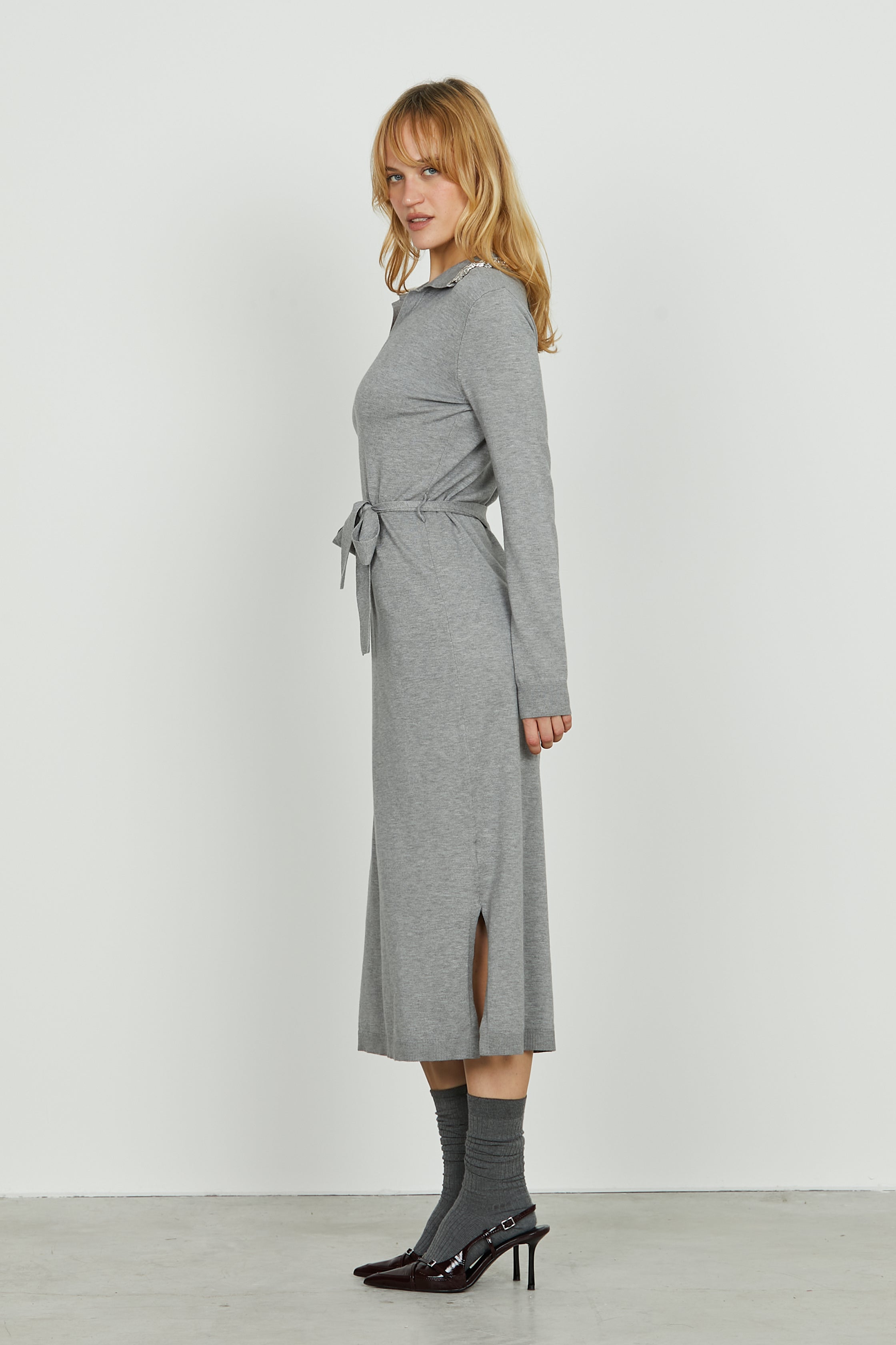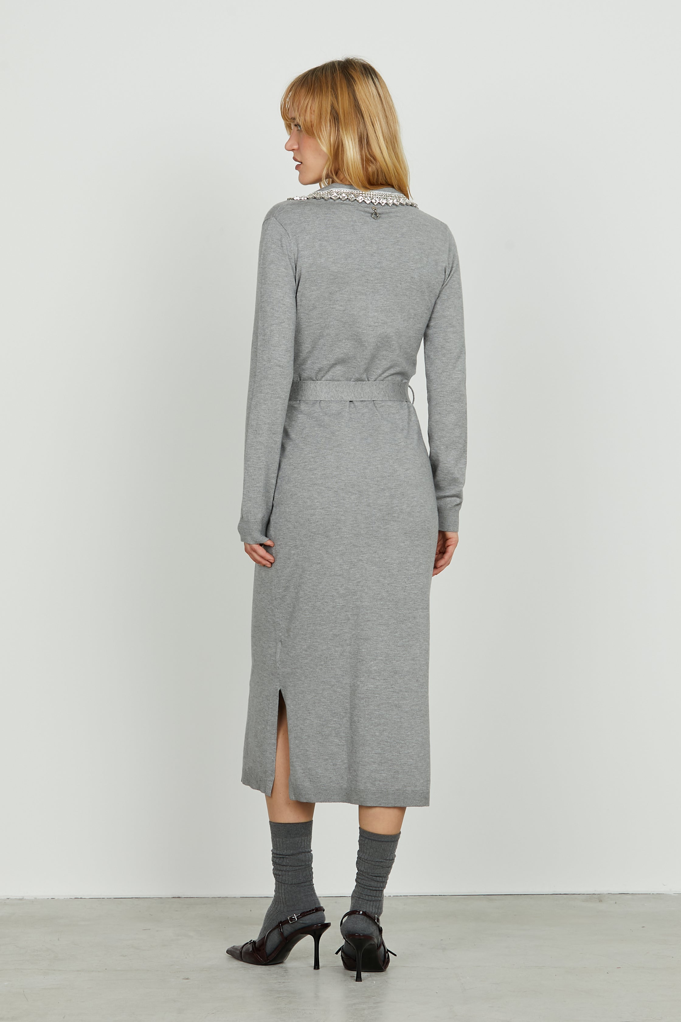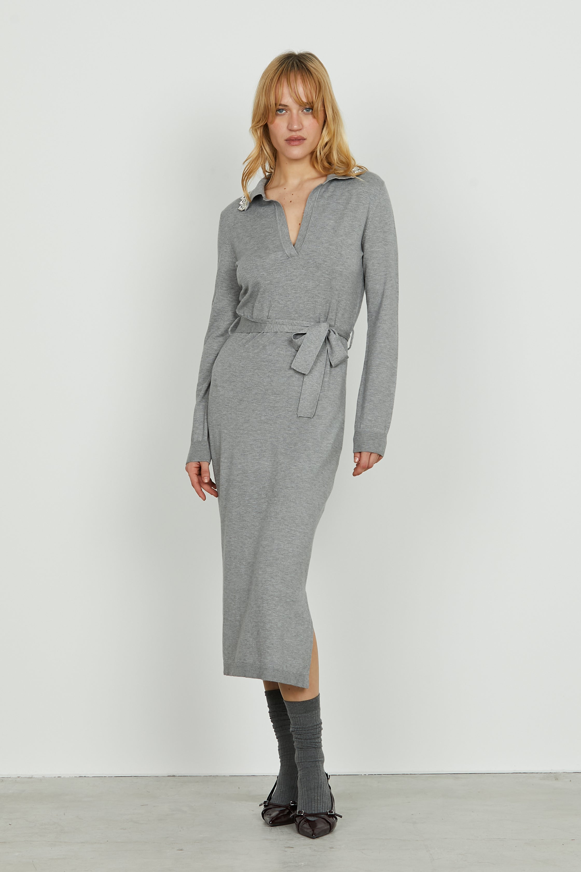 Elegante e femminile, l’abito corto MAUI è in maglia e si adatta ad ogni occasione. Ha un design raffinato, con maniche lunghe e uno scollo a V valorizzato da un colletto strutturato che dona un tocco sofisticato. L'applicazione di strass illumina il capo con dettagli brillanti, mentre la cintura coordinata in vita sottolinea la silhouette con stile. Ideale da abbinare a tacchi alti o anfibi per un look chic e di tendenza.