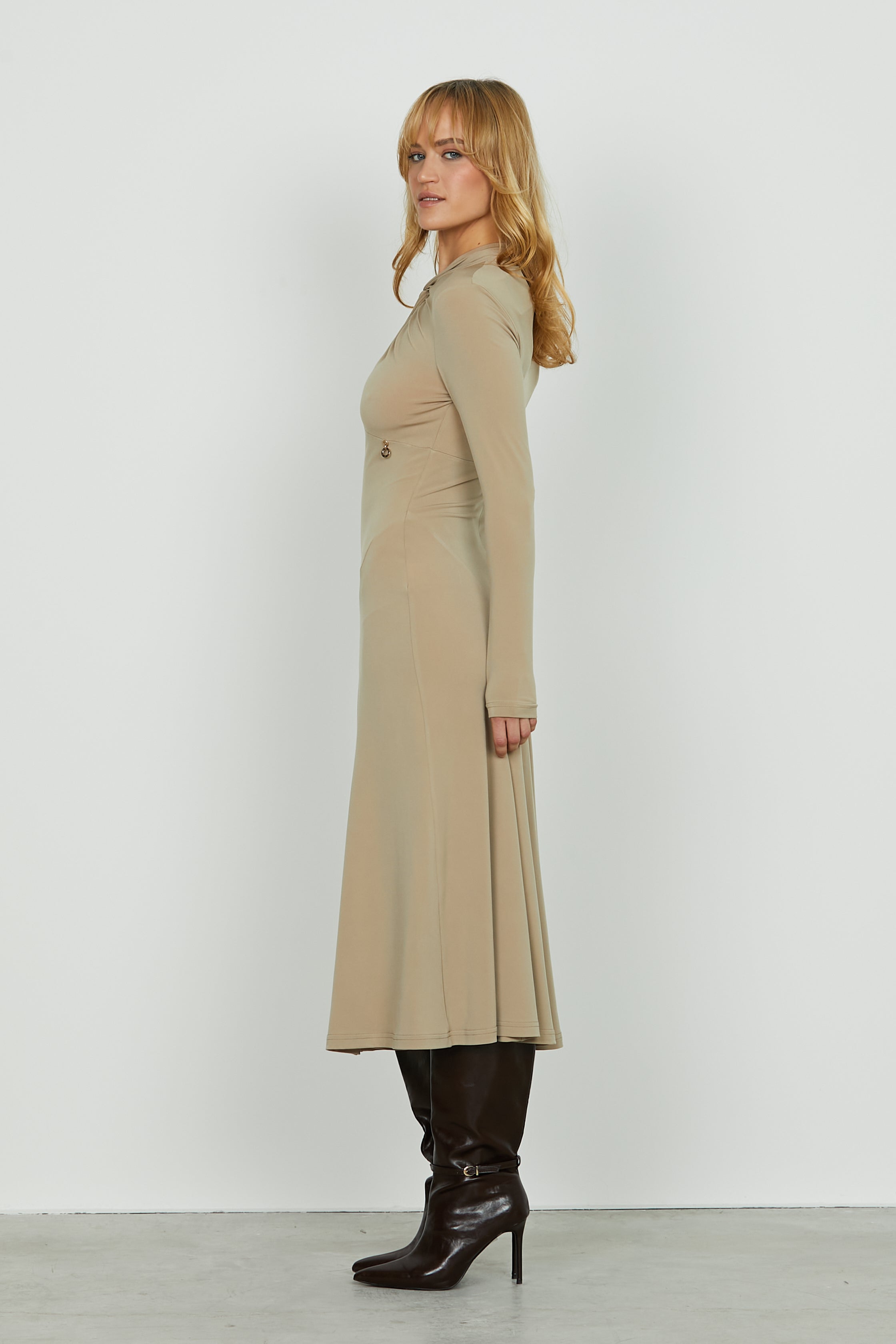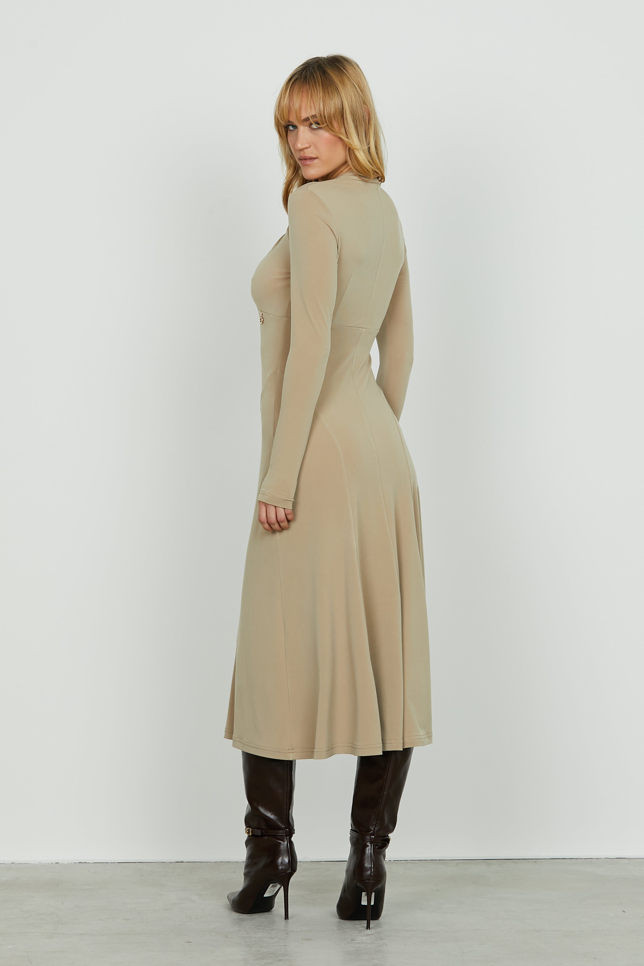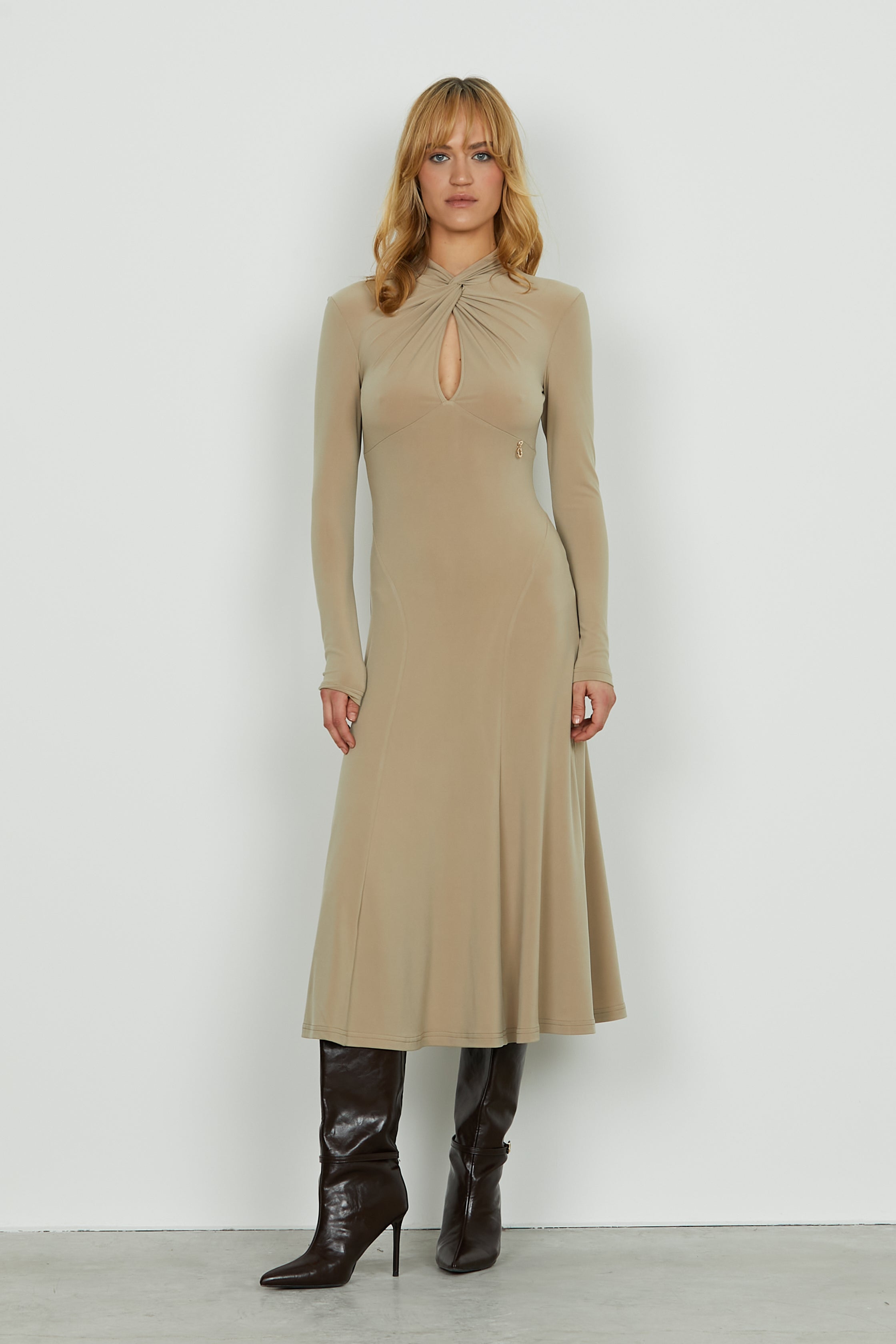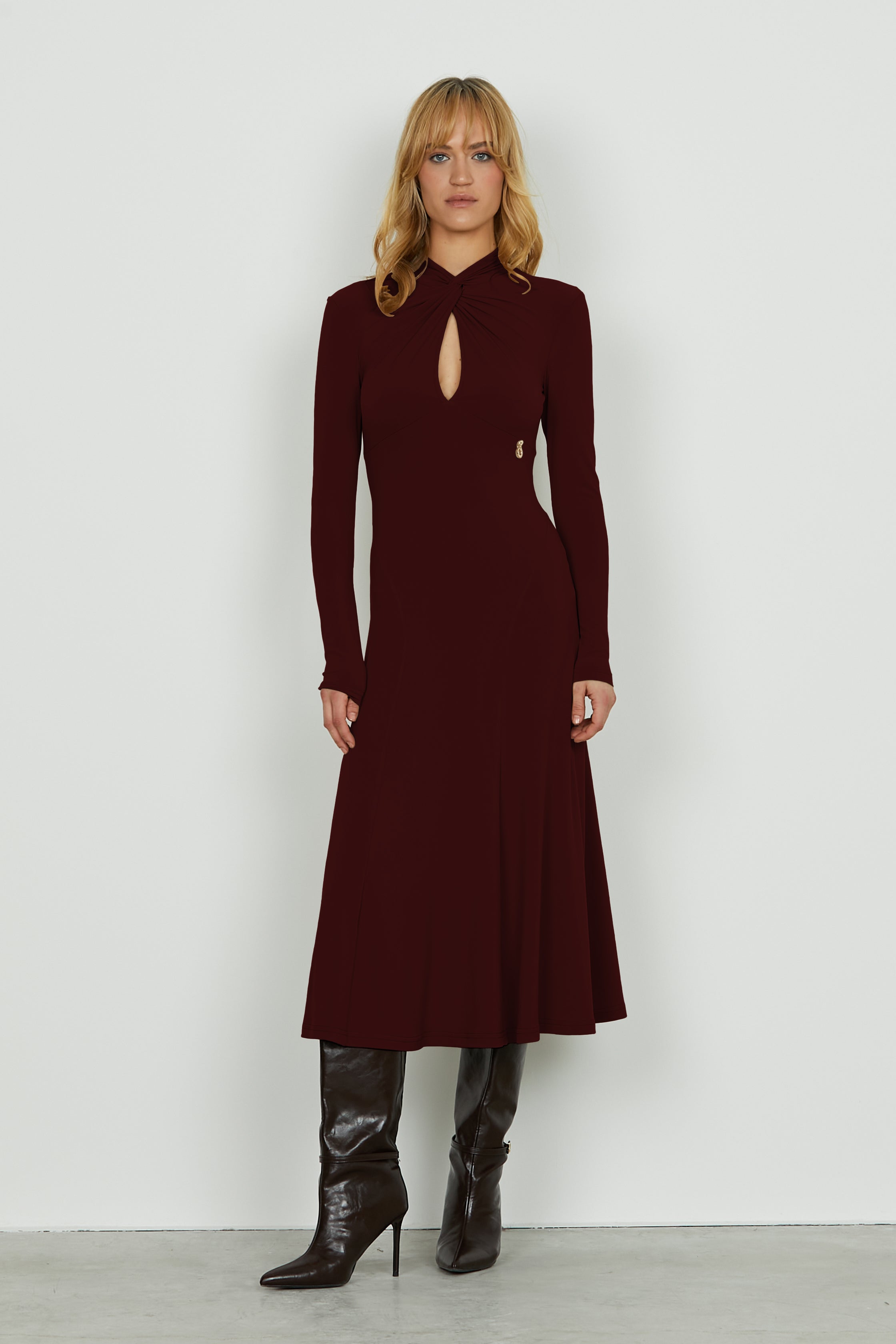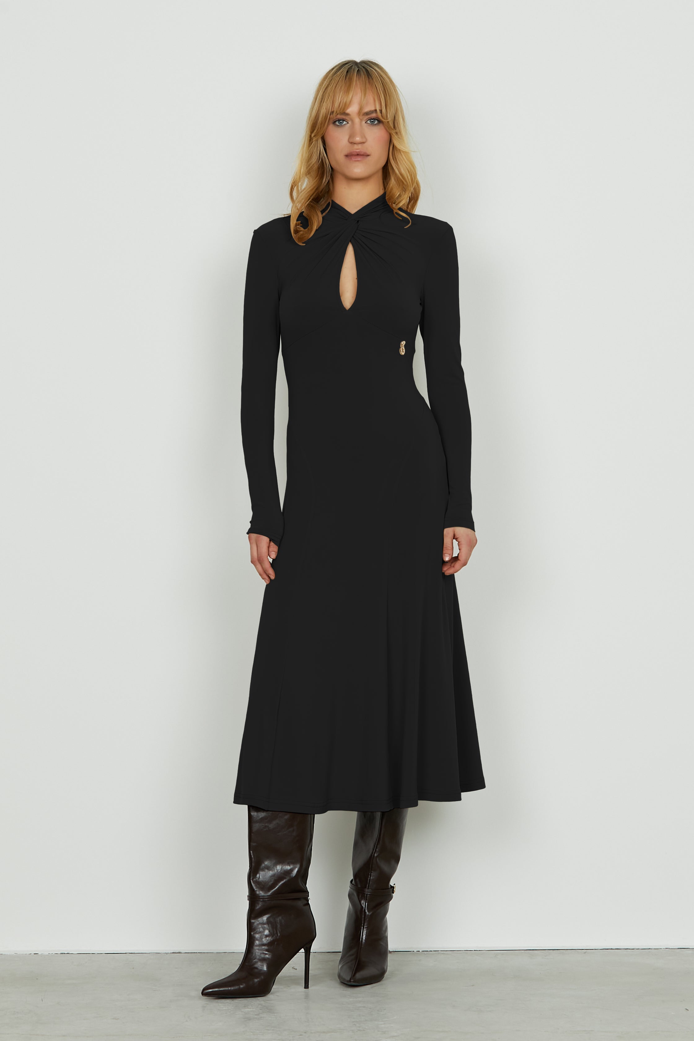 L’Abito PARVUS midi è pensato per esaltare la silhouette con eleganza e semplicità. La lunghezza midi lo rende perfetto per ogni occasione, dal giorno alla sera. Il dettaglio annodato sul seno valorizza il décolleté con raffinatezza, mentre lo scollo a goccia aggiunge un tocco sensuale e moderno. Le maniche lunghe completano il look con equilibrio e classe.