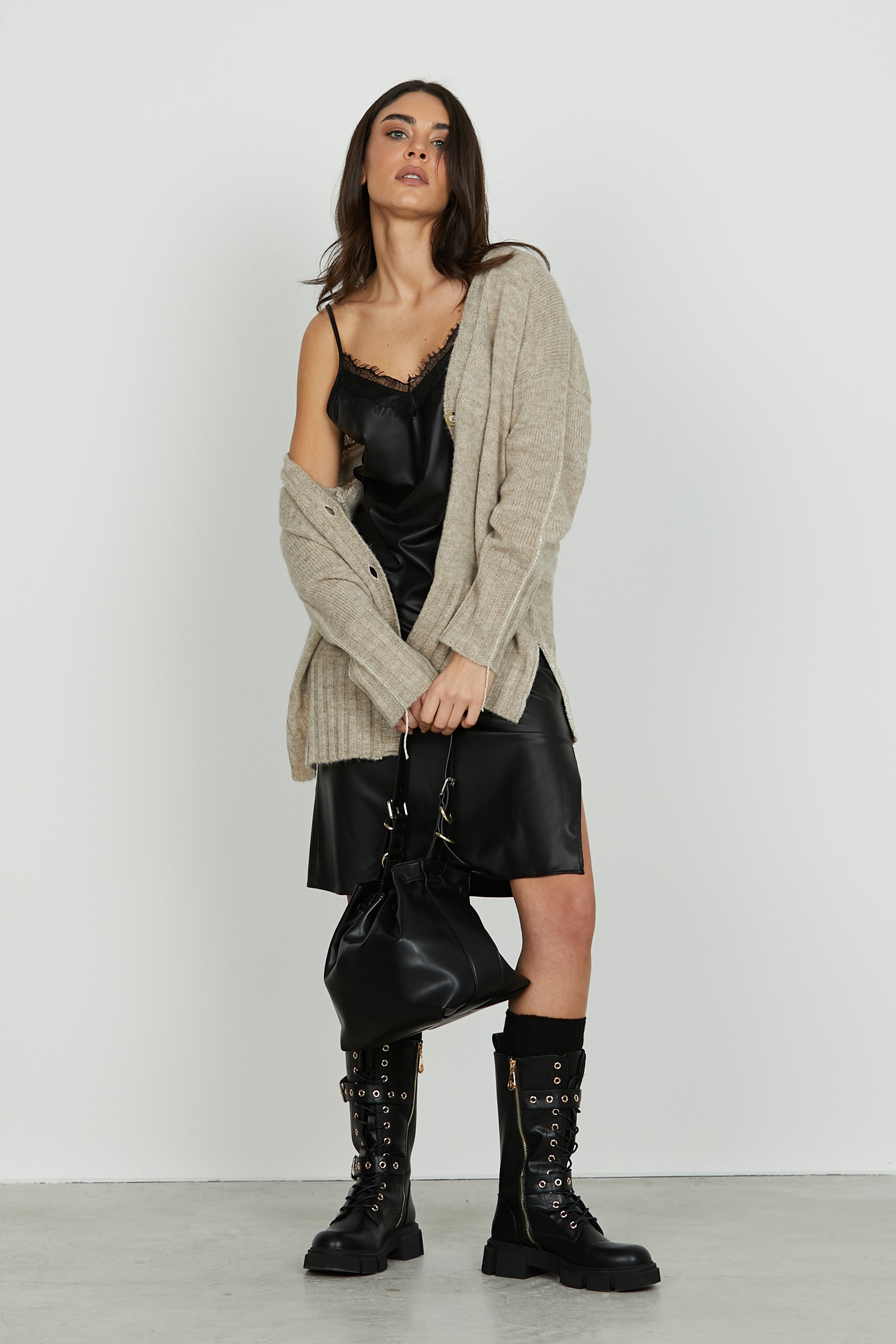 Grintoso e seducente, l’abito PUTAVI è la scelta perfetta per chi ama osare con stile. Realizzato in ecopelle, è caratterizzato da una linea corta e aderente che valorizza la silhouette. Le sottili bretelline e i raffinati inserti in pizzo aggiungono un tocco di femminilità e contrasto, creando un look deciso ma elegante. Perfetto per le serate speciali o per dare carattere al tuo outfit da cocktail.