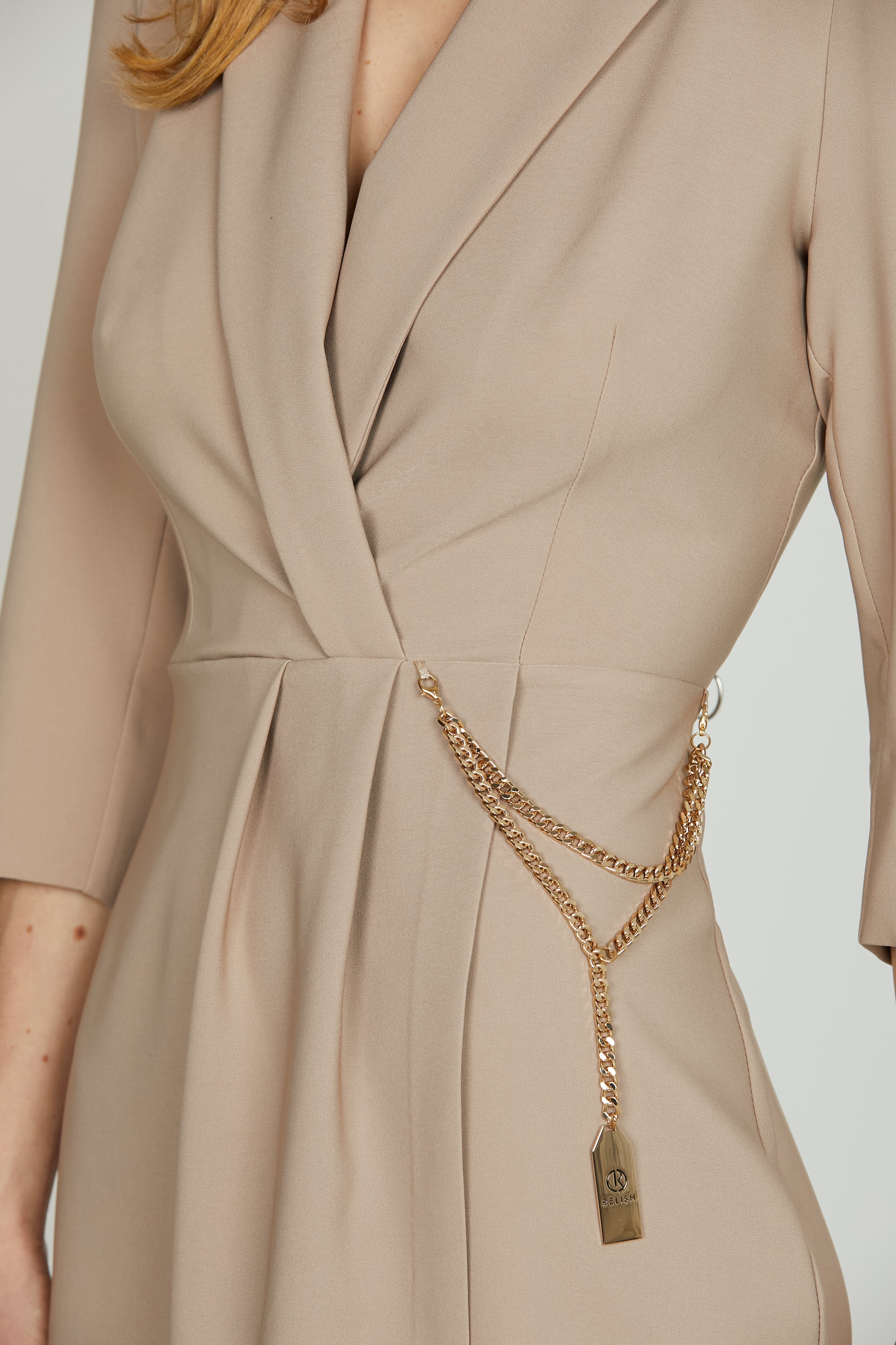 Grintoso e raffinato, l’abito SISSYL corto è il capo ideale per chi ama distinguersi con stile. Caratterizzato da maniche 3/4, un elegante revers sullo scollo e una gonna con pannello e pieghe. Il dettaglio distintivo? La catena con logo applicata in vita, per un tocco glam e ricercato. Perfetto per un look day-to-night, da completare con tacchi o stivali per un effetto sorprendente.