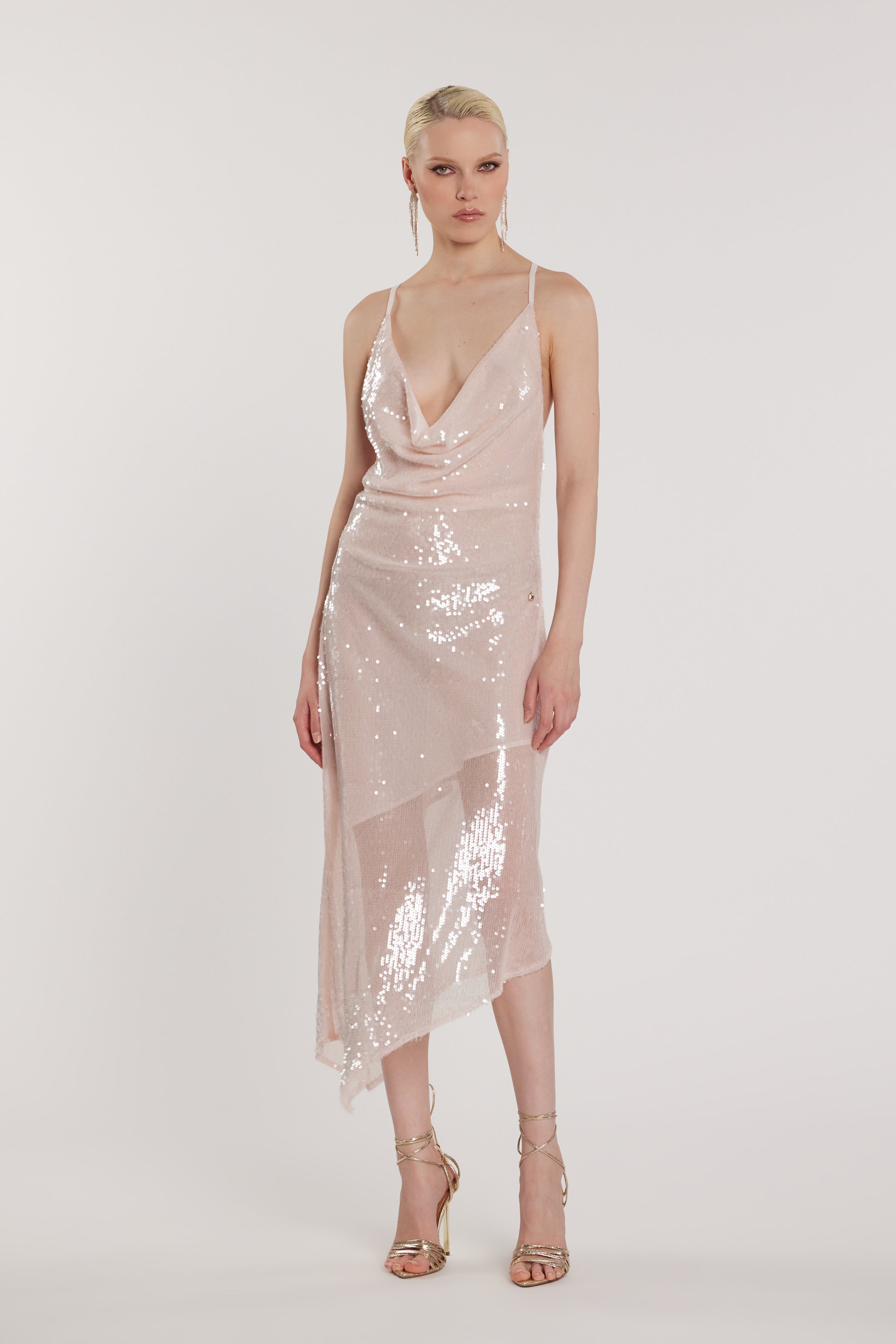Abito Beloved midi con collo morbido e top incrociato sul retro, interamente ricoperto di paillettes scintillanti, un modello glamour che cattura la luce ad ogni movimento. Perfetto per serate eleganti o eventi di gala, questo abito trasforma ogni look in un’esplosione di femminilità, luce e charme couture, ideale per chi ama brillare con stile sofisticato.