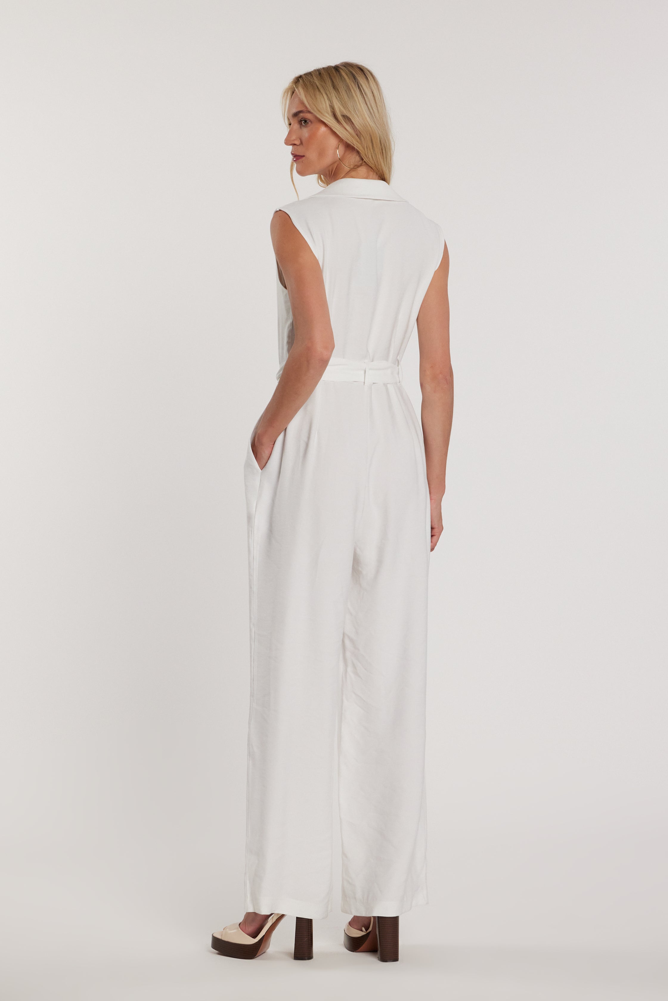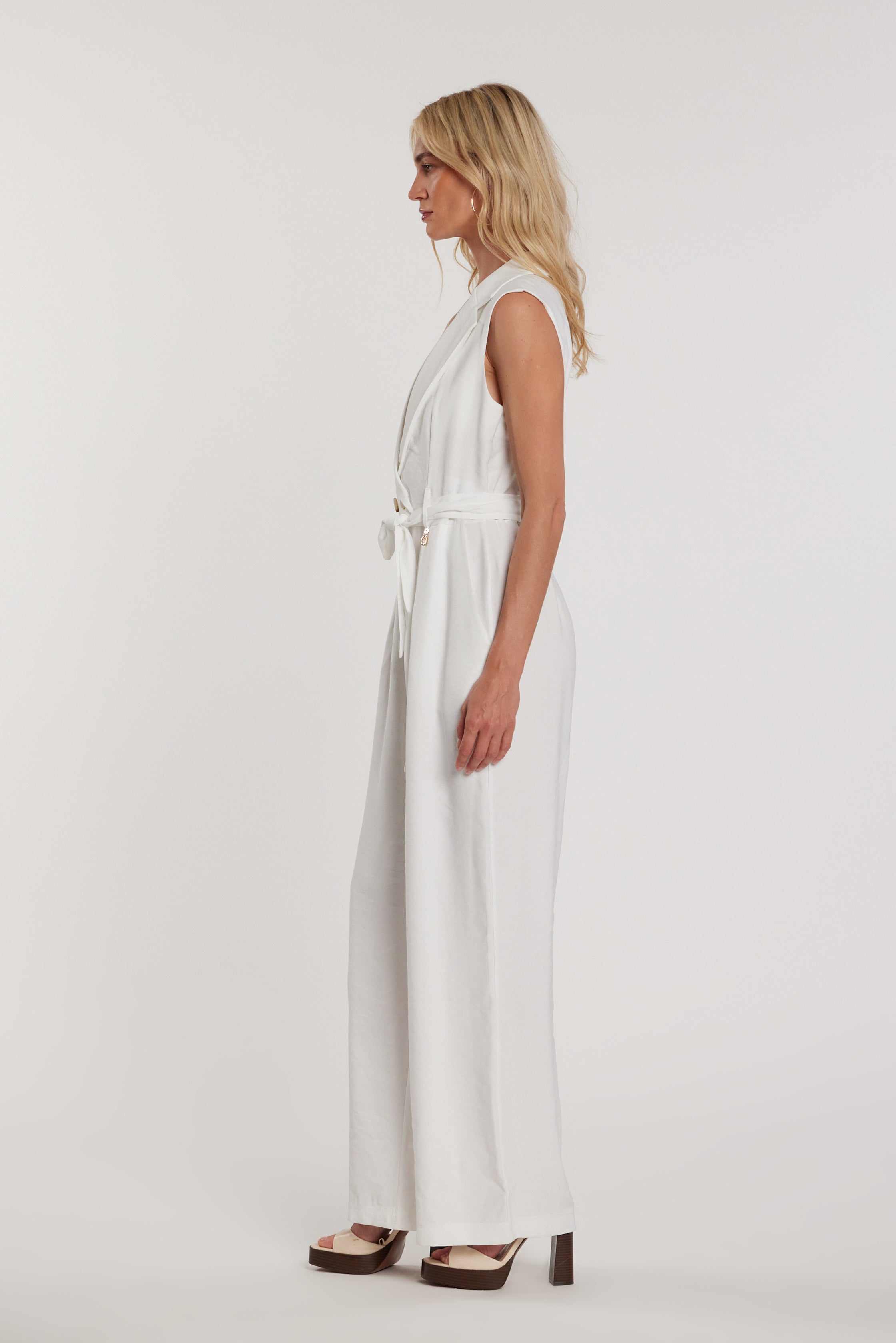 Tuta Morante lunga senza maniche palazzo effetto giacca a doppio petto con cintura e tasche, un modello scenografico che unisce eleganza e femminilità. Il palazzo fluido slancia la figura, mentre il doppio petto aggiunge carattere e stile sartoriale, ideale per look da sera raffinati.