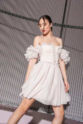 Abito PRINCED corto mezza manica con rouches scollo barca corp.con pieghe più gonna plumetis