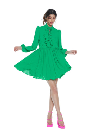Abito YASUKO corto manica lunga con arricci colletto con fusciacca più scollo v con rouches