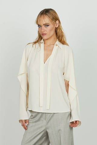 Blusa SANTORINI manica lunga scollo a v incrocio più cravattino più frange spalle