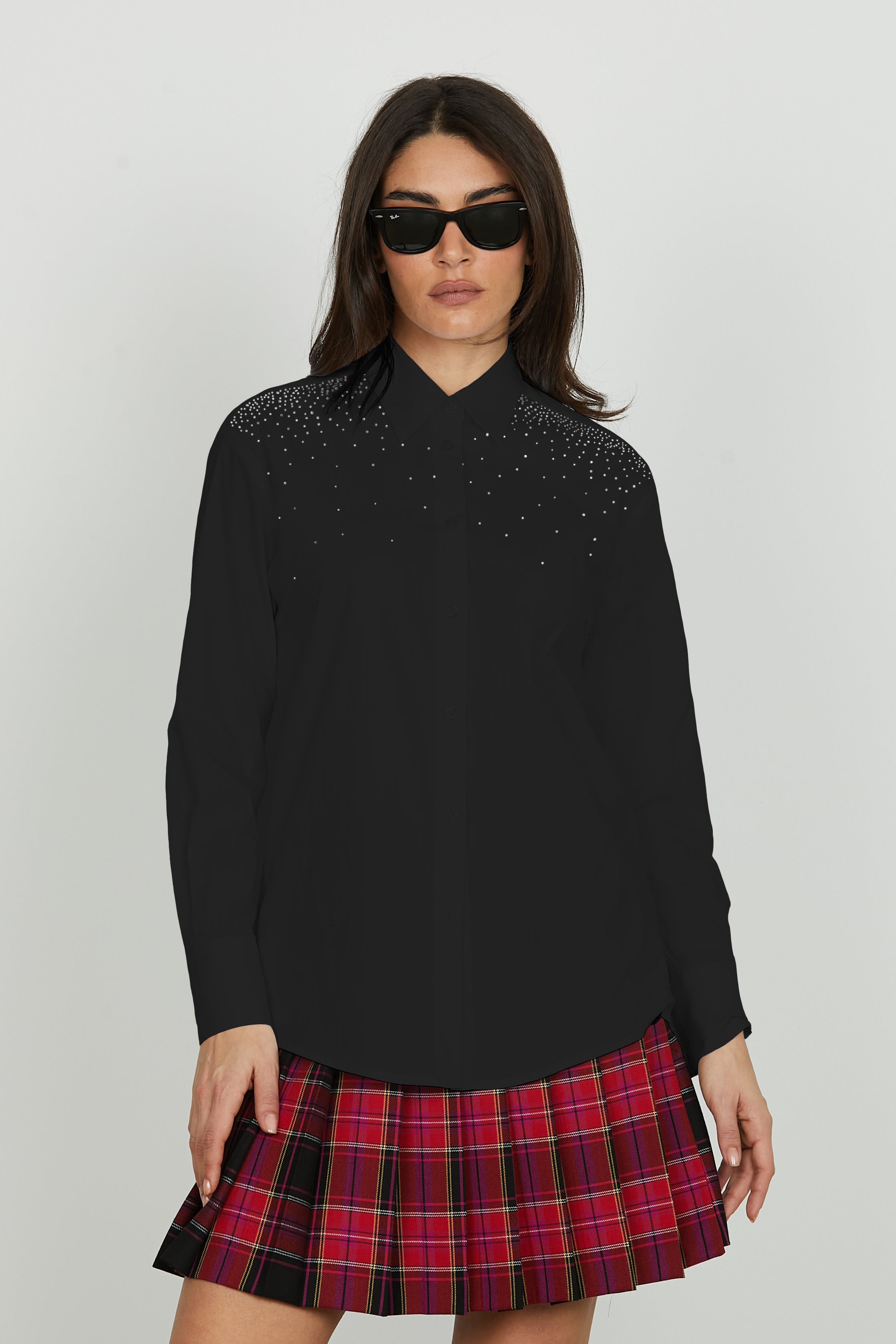 Linee pulite e taglio essenziale incontrano la luce degli strass, che impreziosiscono la camicia ASTERIAS_B con discreta eleganza. Un capo versatile, perfetto per elevare i look quotidiani con un dettaglio raffinato e contemporaneo.