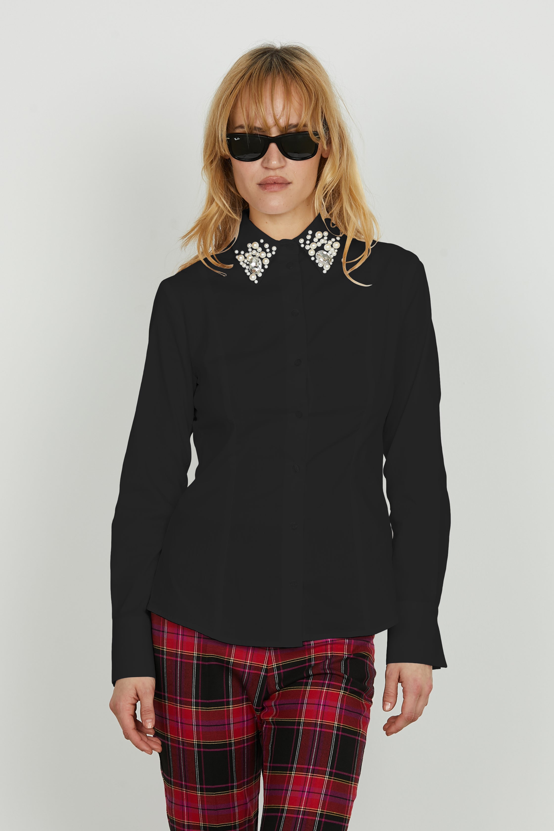 La camicia YOH unisce linee essenziali a dettagli preziosi: il collo gioiello, decorato con perle, pietre e strass, dona luce e carattere a un capo pensato per brillare con eleganza. Perfetta da sola o sotto un blazer per look sofisticati e d'effetto.