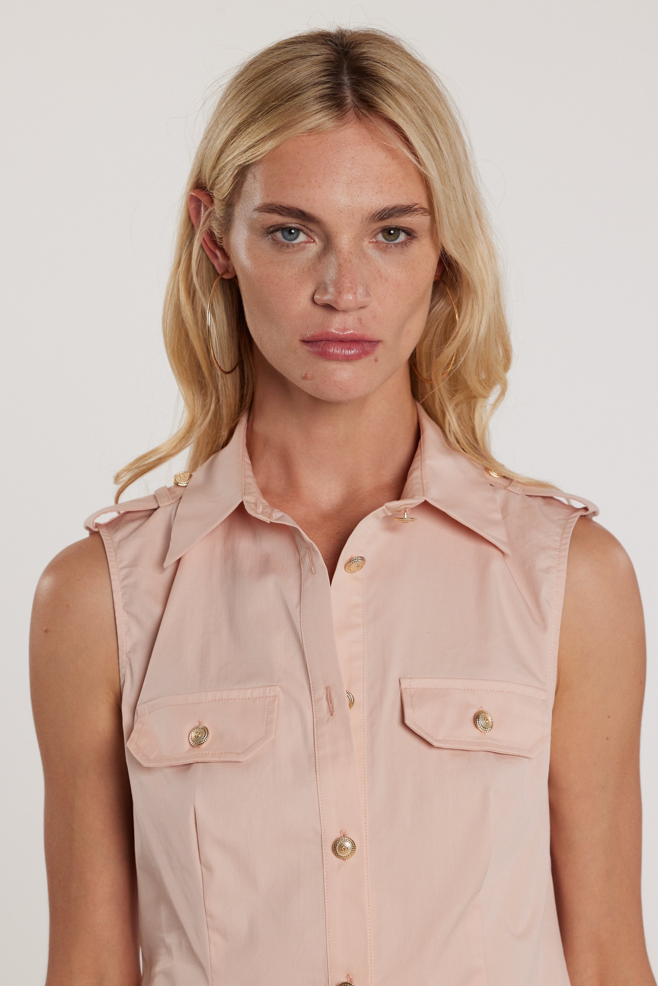 Camicia Gora senza maniche con snap, alette e patte, un capo versatile e femminile. Gli snap e le alette aggiungono dettagli couture discreti, mentre la linea valorizza la silhouette con charme raffinato.