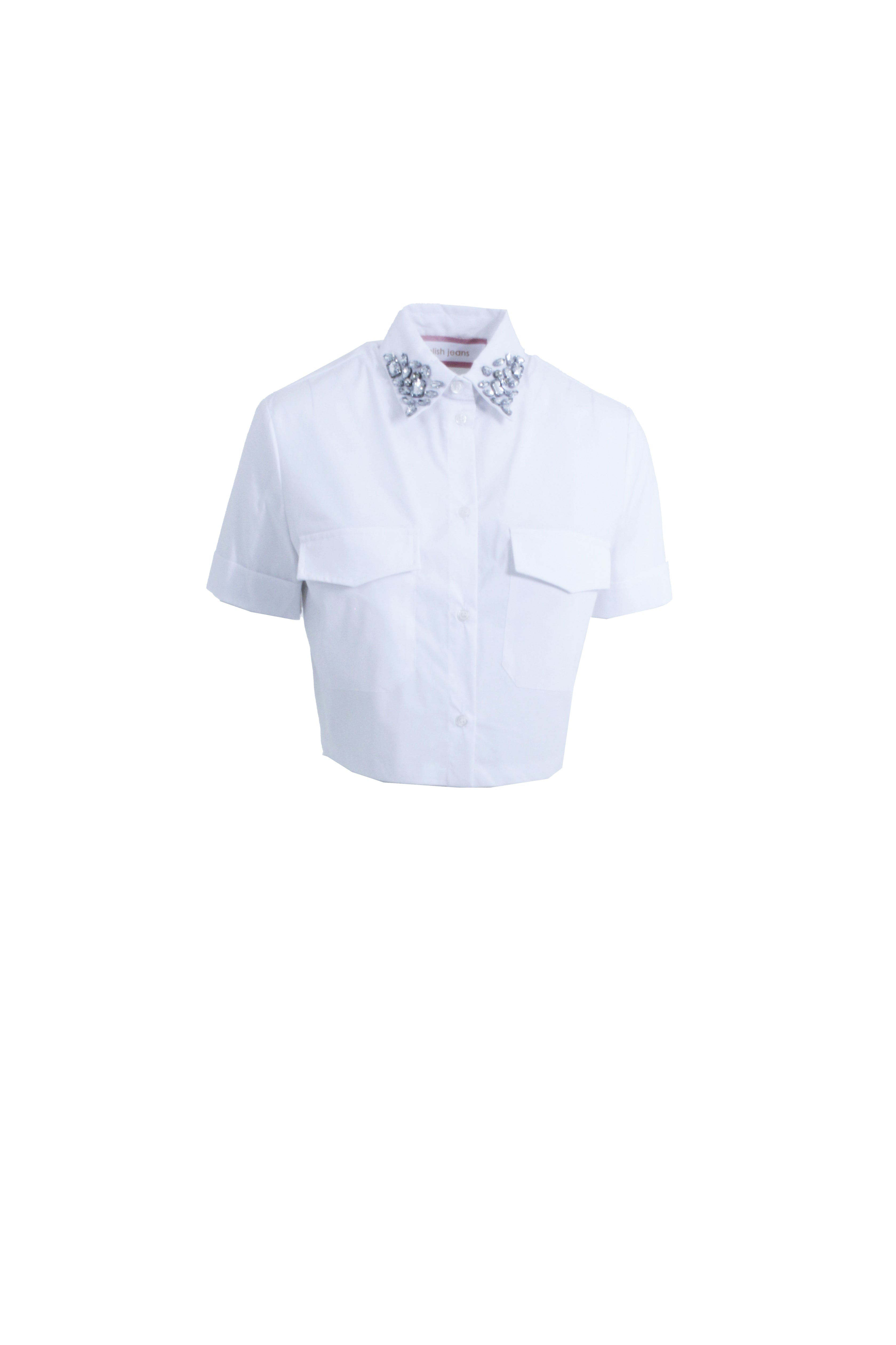 Camicia Kellys corta maniche lunghe con risvolto, tasche, patte e applicazioni pietre, un capo luminoso e femminile. Le pietre catturano la luce con charme couture, mentre il taglio valorizza la silhouette con eleganza discreta.