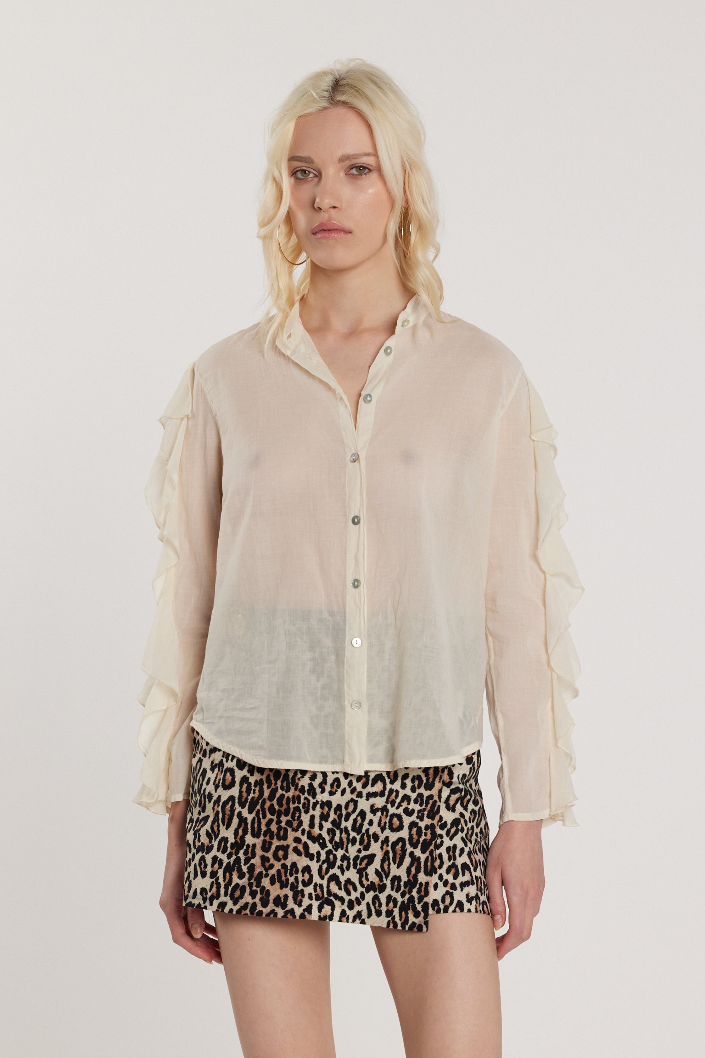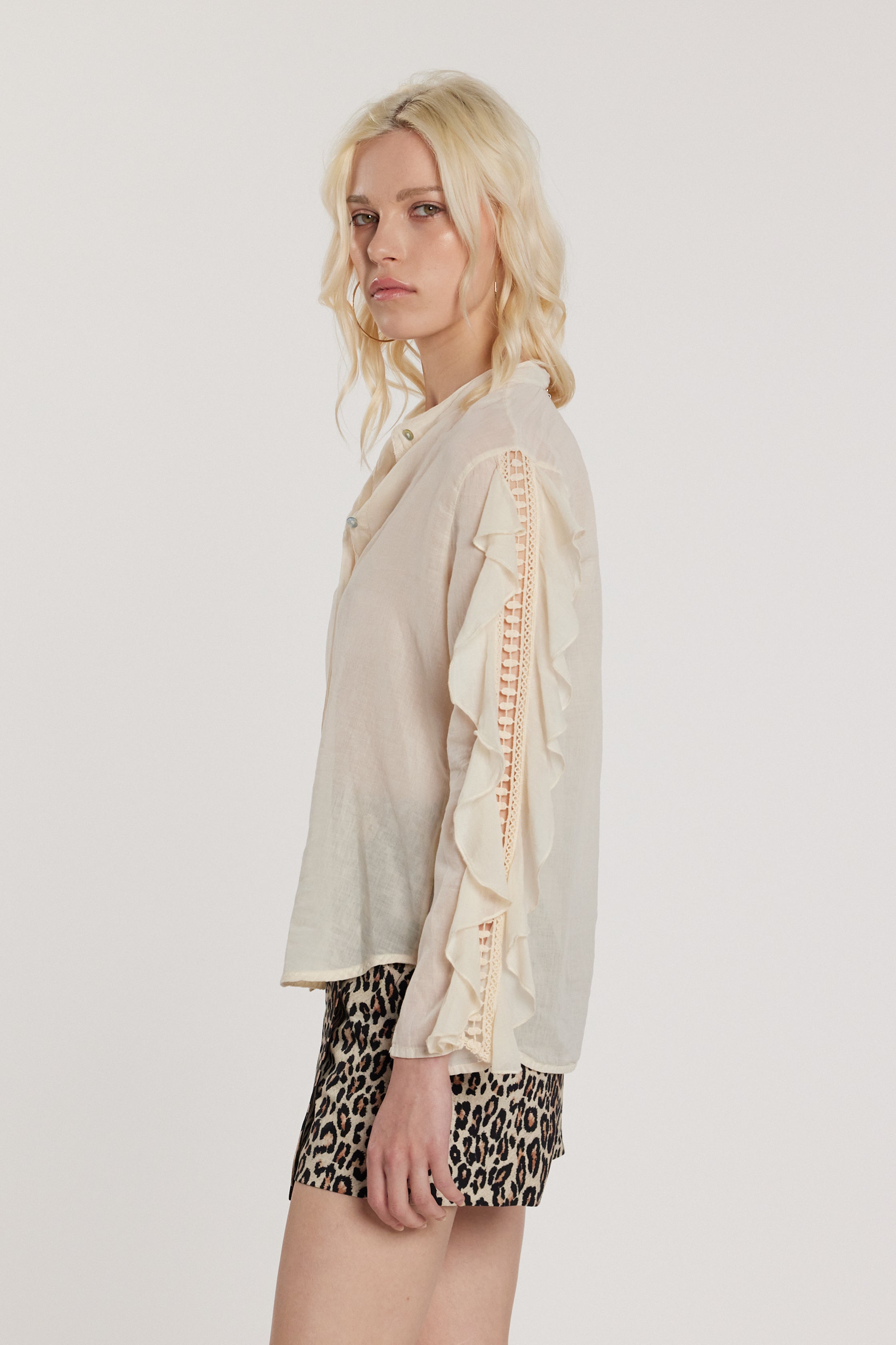Camicia Montand maniche lunghe con gale e inserti in pizzo, collo coreana, un modello elegante e romantico. Gli inserti e il dettaglio gale aggiungono luminosità e charme couture, mentre la linea avvolge la silhouette con femminilità discreta.