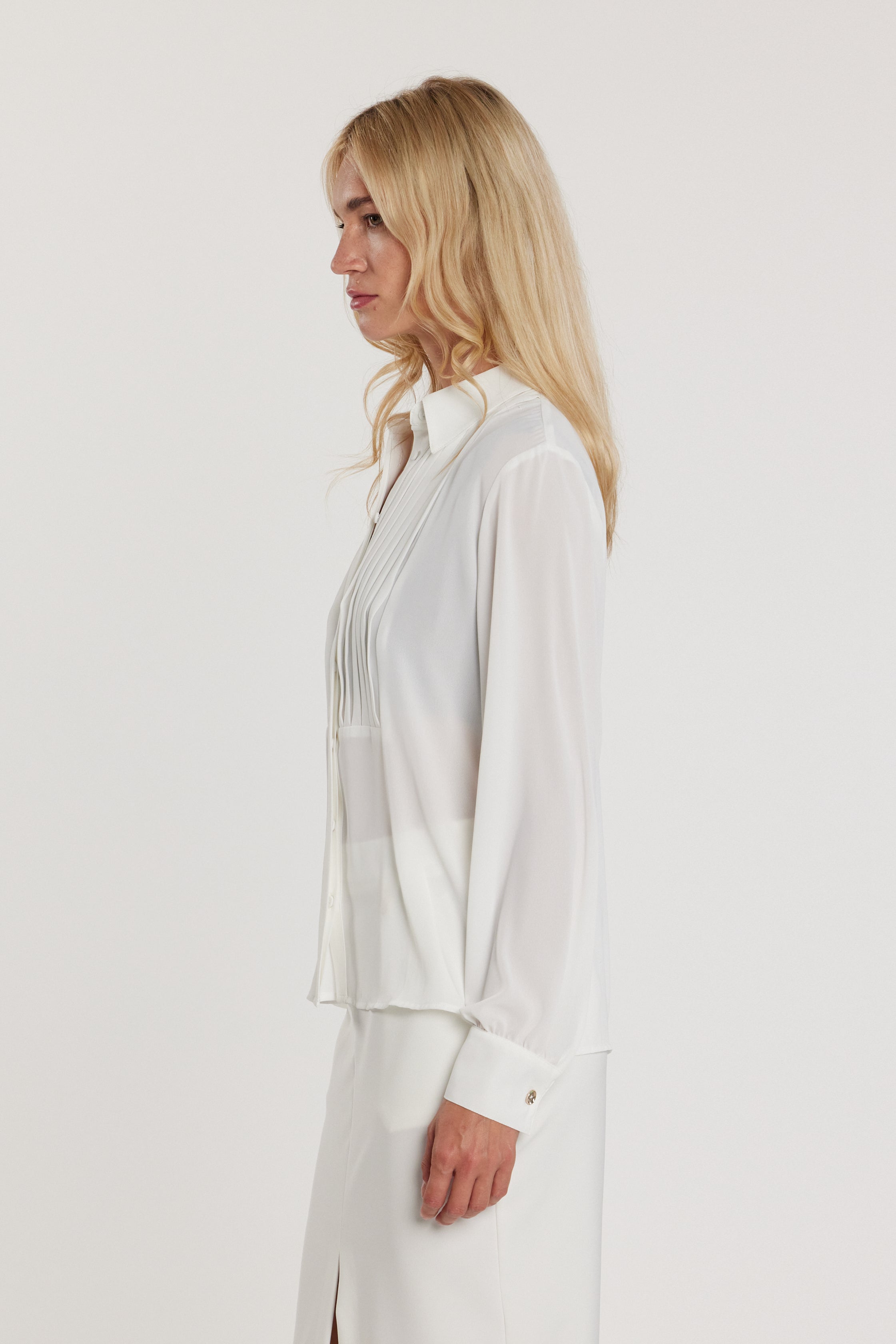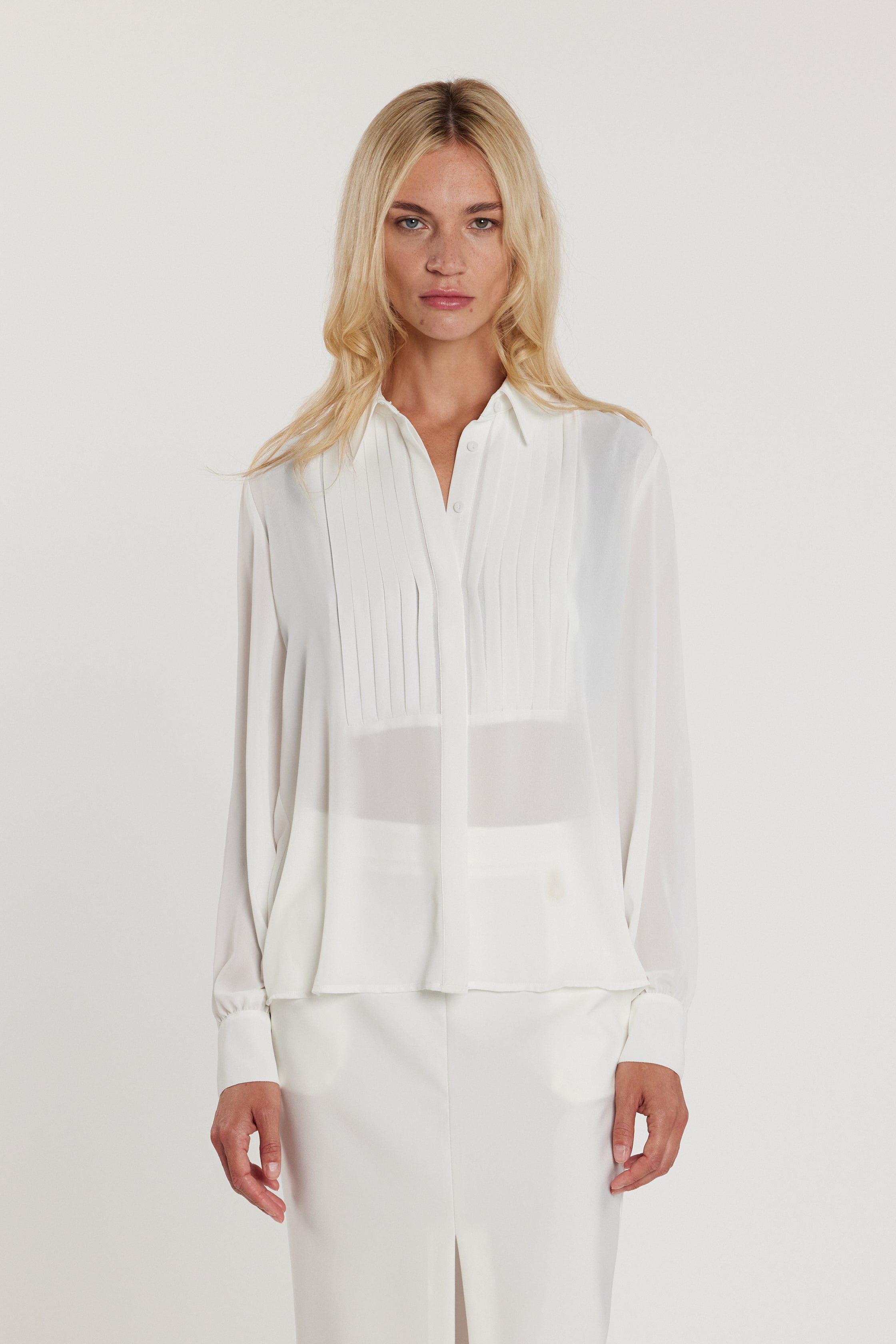 Camicia Moreau maniche lunghe plissé sul seno, un capo romantico e sofisticato. Il plissé valorizza la silhouette con movimento delicato, perfetto per outfit eleganti da giorno o serali.