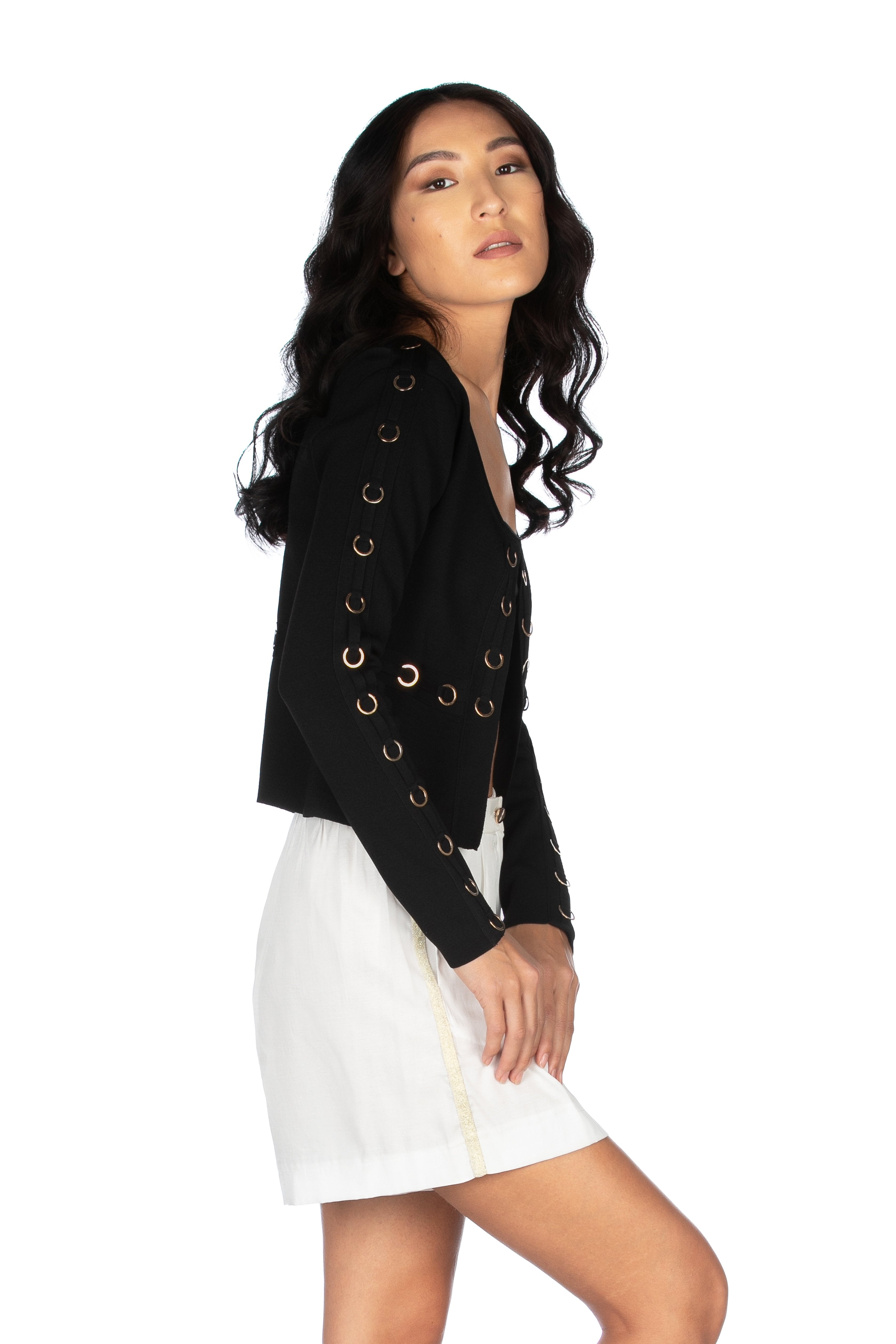 Gli anelli oro con inserti in tessuto rendono questo cardigan un pezzo unico del tuo guardaroba. Perfetto da abbinare sia ai look casual che eleganti ma soprattutto insieme al Body JAPAN della della stessa rifinitura.