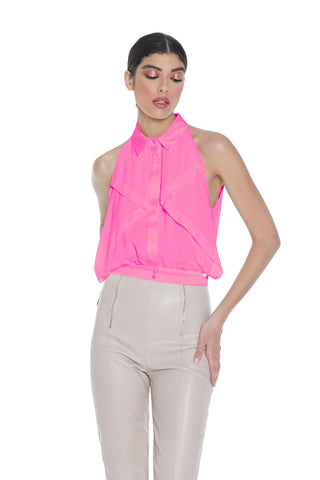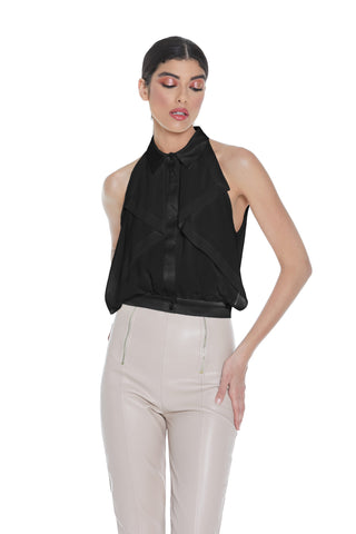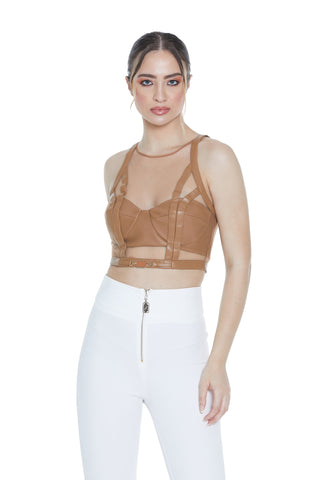 Crop-top DALIM con reggiseno ecopelle più fibbia davanti più tulle più zip retro