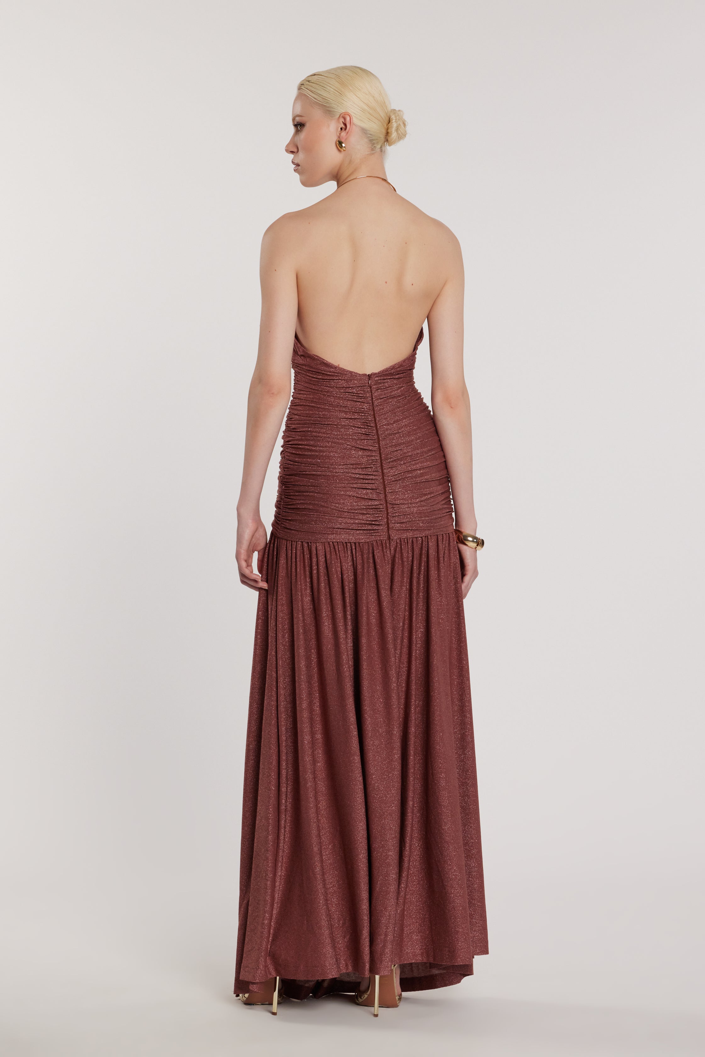 Abito Garko lungo con scollatura profonda, spacco e arricciature con collana lurex coordinata, un capo scenografico che unisce femminilità e glamour couture. Perfetto per serate esclusive, gala o eventi di alto profilo, valorizza la silhouette con eleganza e luce raffinata.