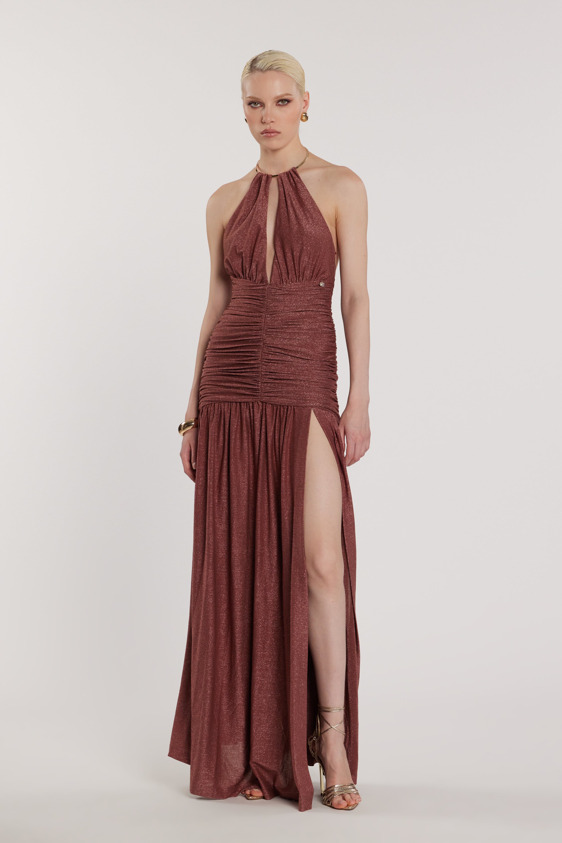 Abito GARKO lungo scollo a V profondo più spacco più arricciatura più accessorio collana lurex