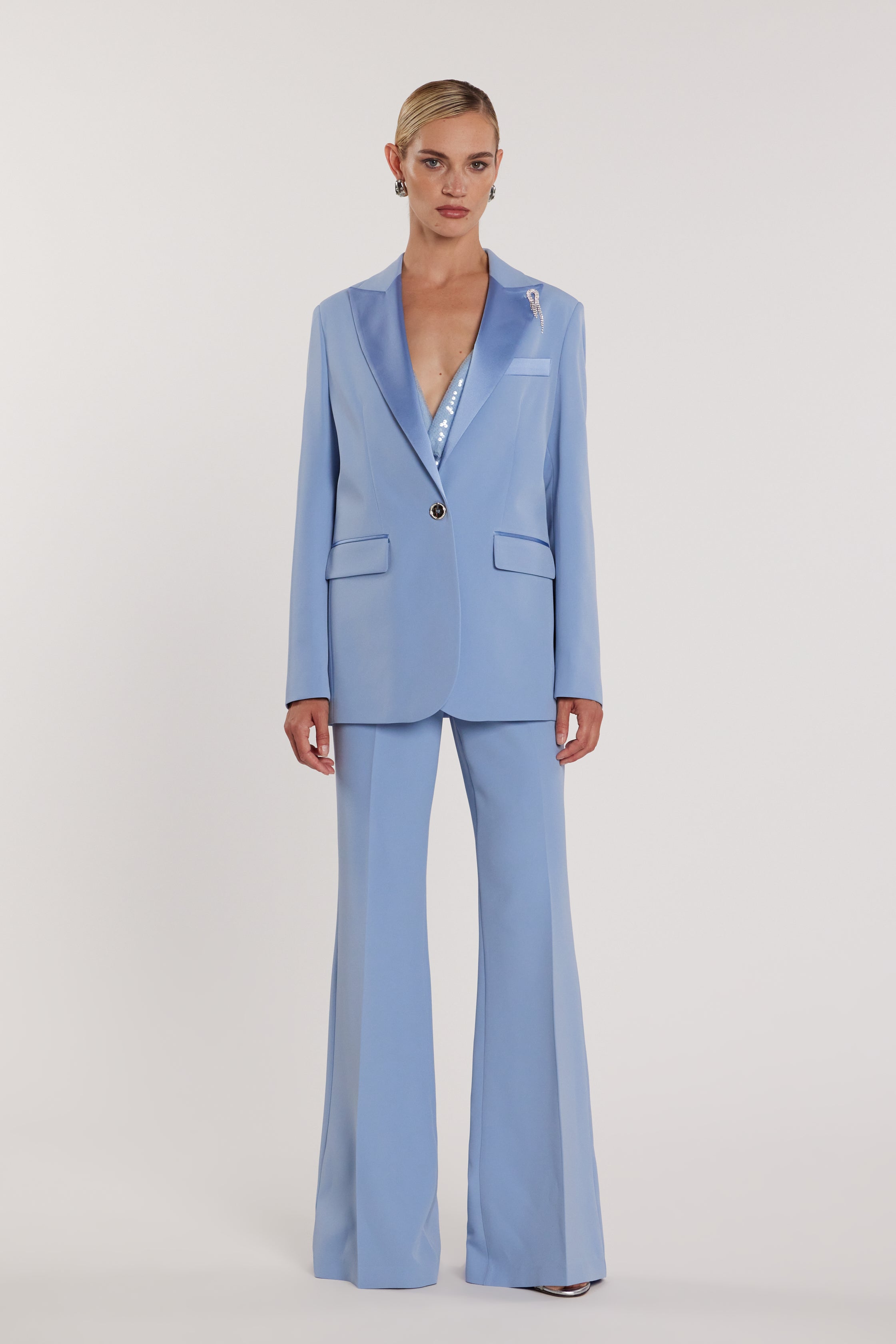 Pantalone Barrinton vita alta a zampa con inserti in raso luminoso, un capo che unisce struttura e fluidità con grazia. La gamba a zampa allunga la figura, mentre gli inserti in raso aggiungono un dettaglio couture sofisticato. Ideale per serate glamour o eventi esclusivi, conferisce eleganza e movimento armonioso, valorizzando ogni passo con un tocco di femminilità raffinata.