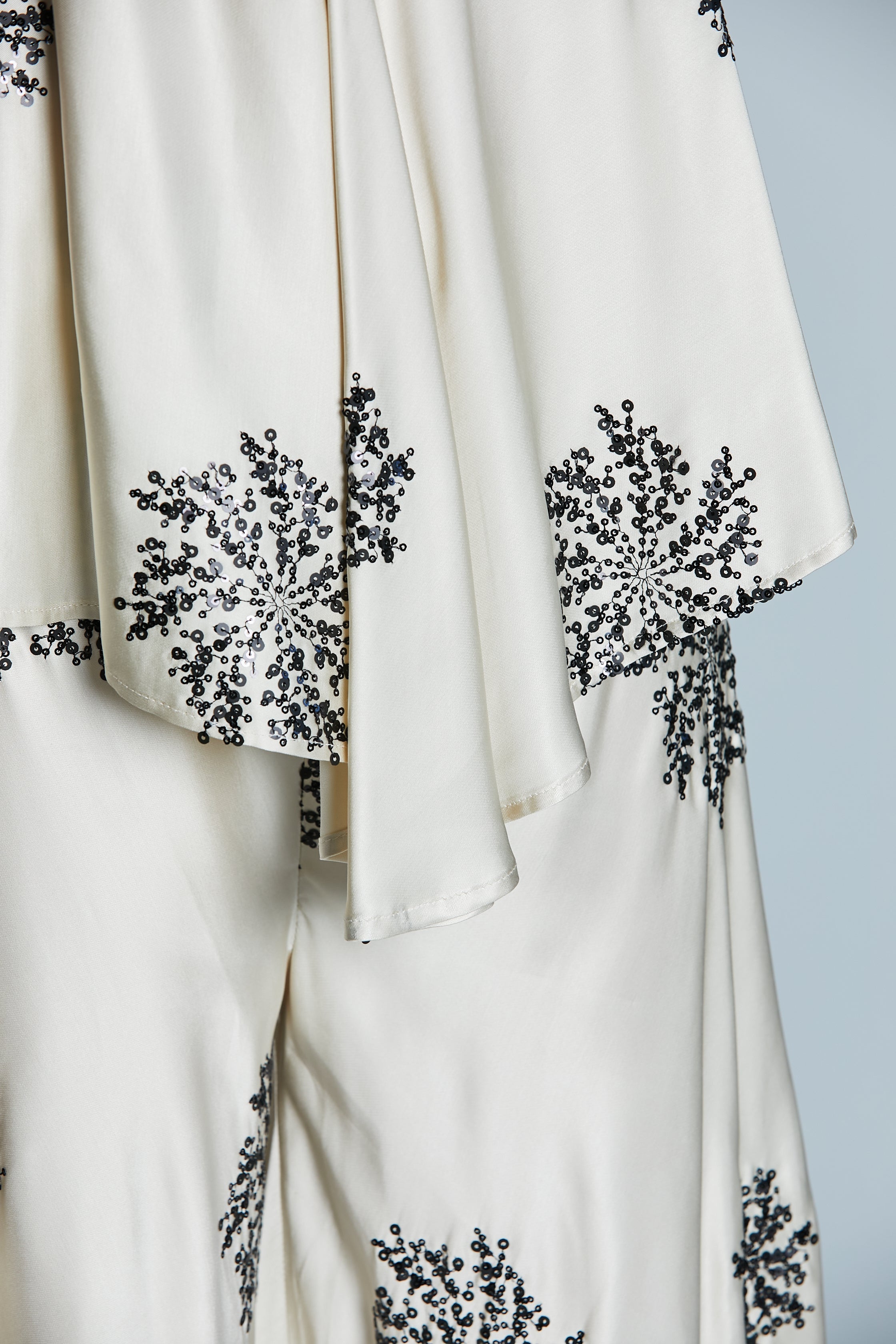 La combo Fortaleza unisce glamour e raffinatezza, composta da un top elegante e pantaloni a vita alta palazzo in raso. Il tutto è arricchito da ricami floreali impreziositi da paillettes scintillanti, è perfetta per eventi speciali o serate eleganti, regalando un look sofisticato e luminoso.