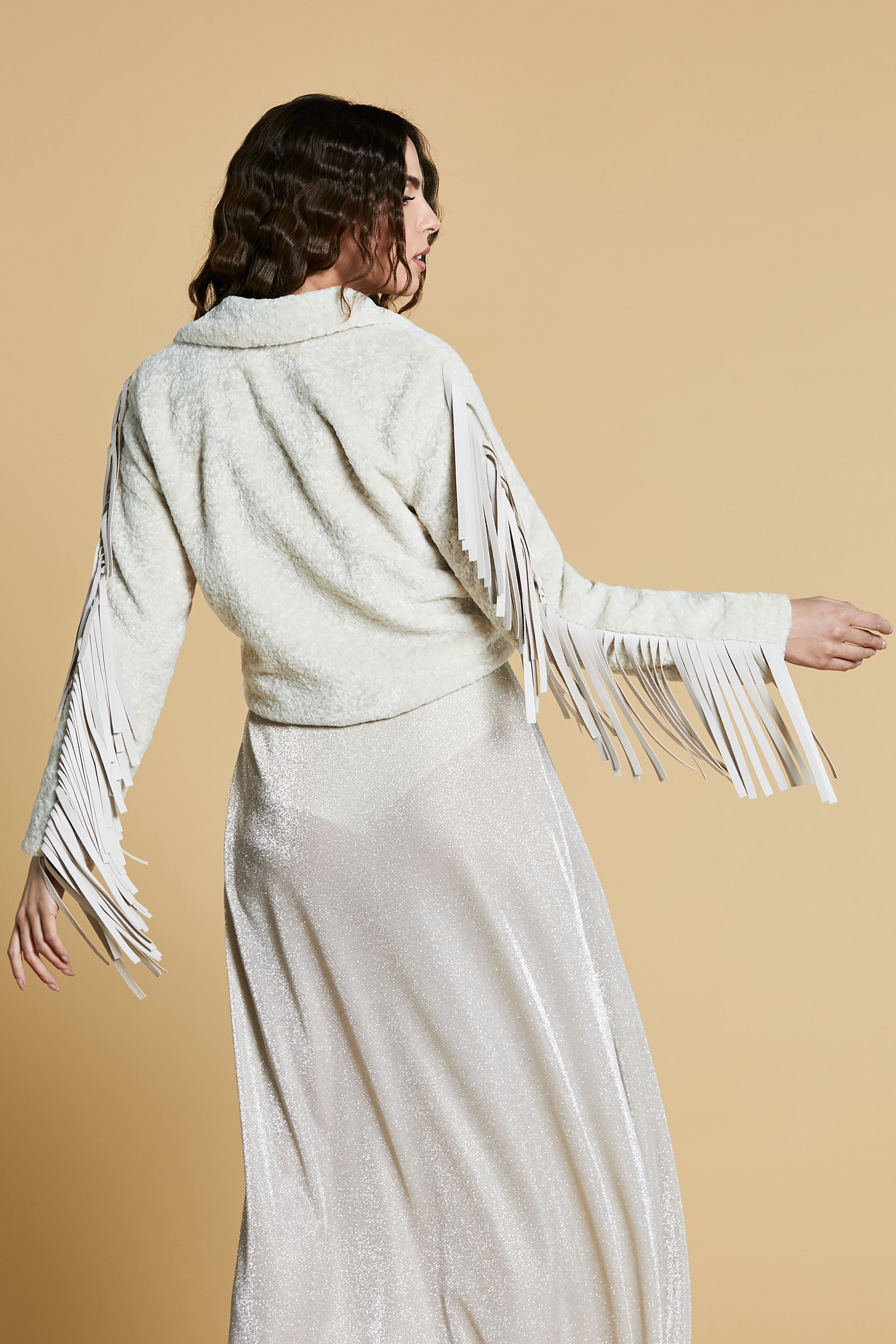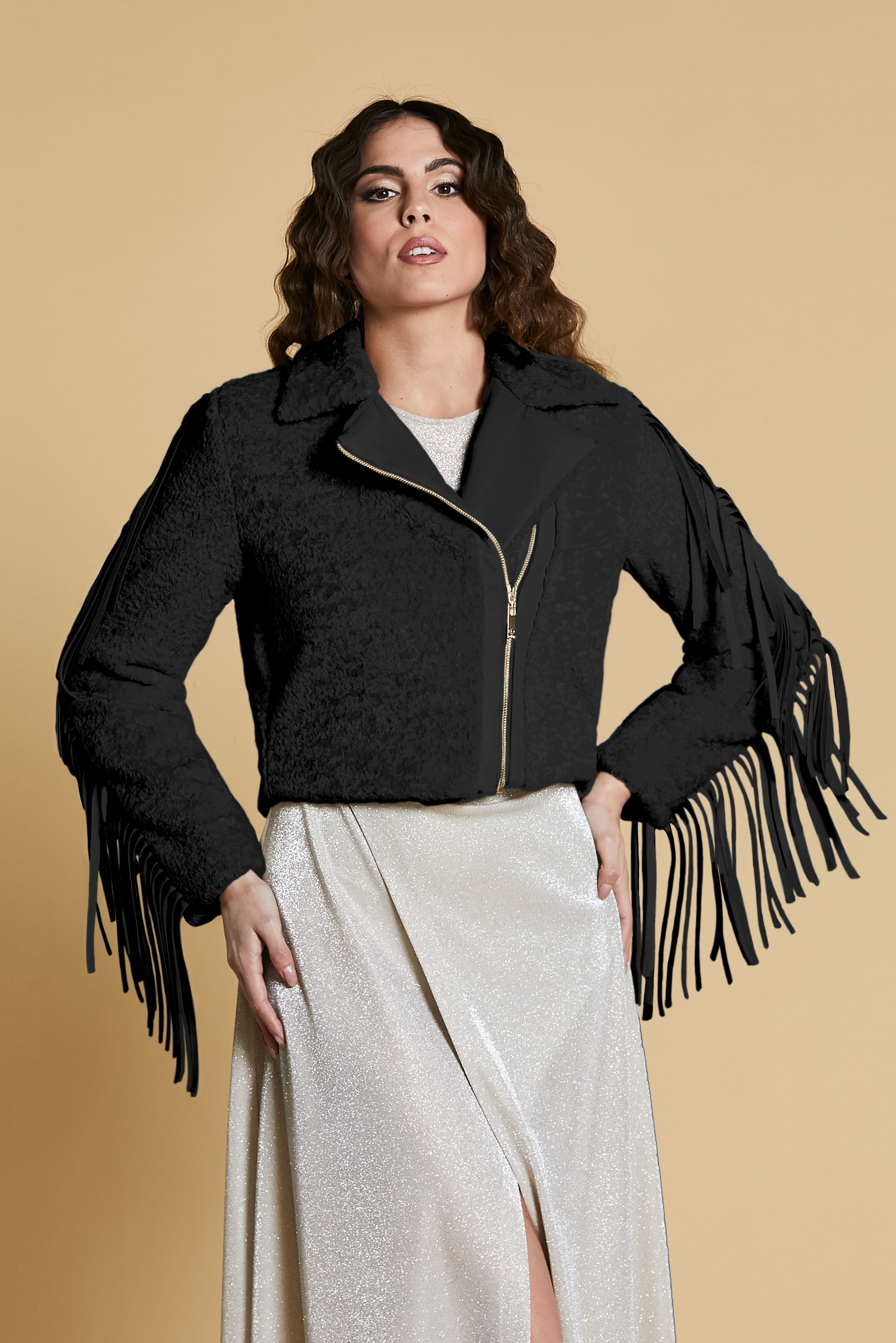 Pelliccia NESU eco corta manica lunga chiodo con inserti ecopelle più frange