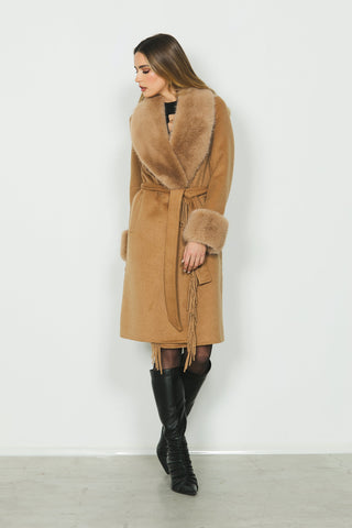 Cappotto GUENDA sfoderato con ecopelliccia staccabile più cintura e frange