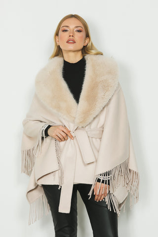 Cappotto DENISE corto manica a 3/4 kimono con collo ecopelliccia staccabile più cintura e frange