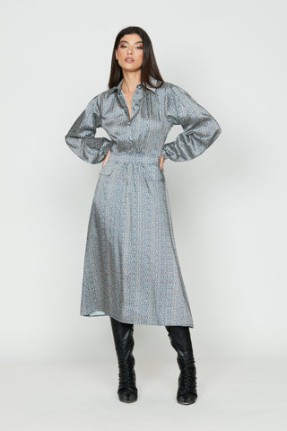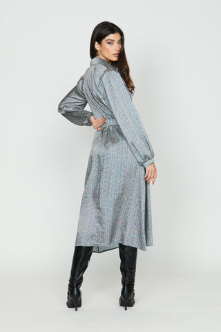 Abito TESSA midi manica lunga scollo camicia c più patte raso più stampa geometrica