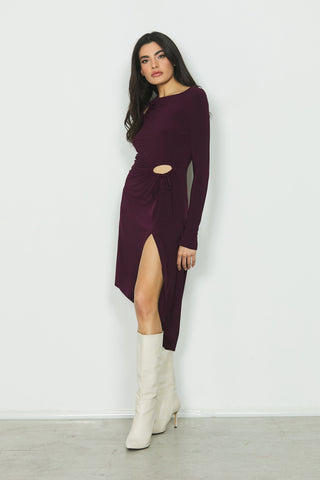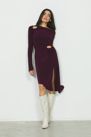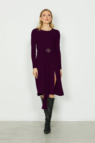 Abito VIOLA midi manica lunga con pieghe più fusciacca con fibbia anelli