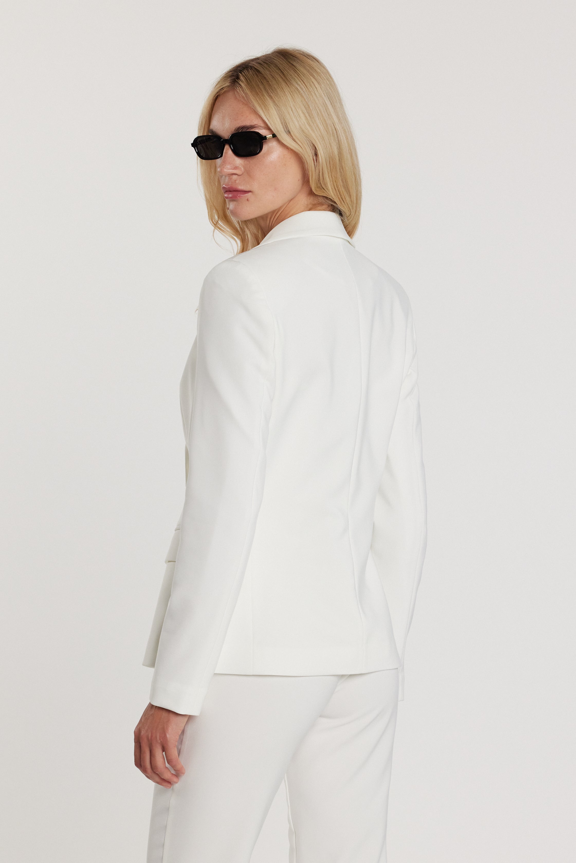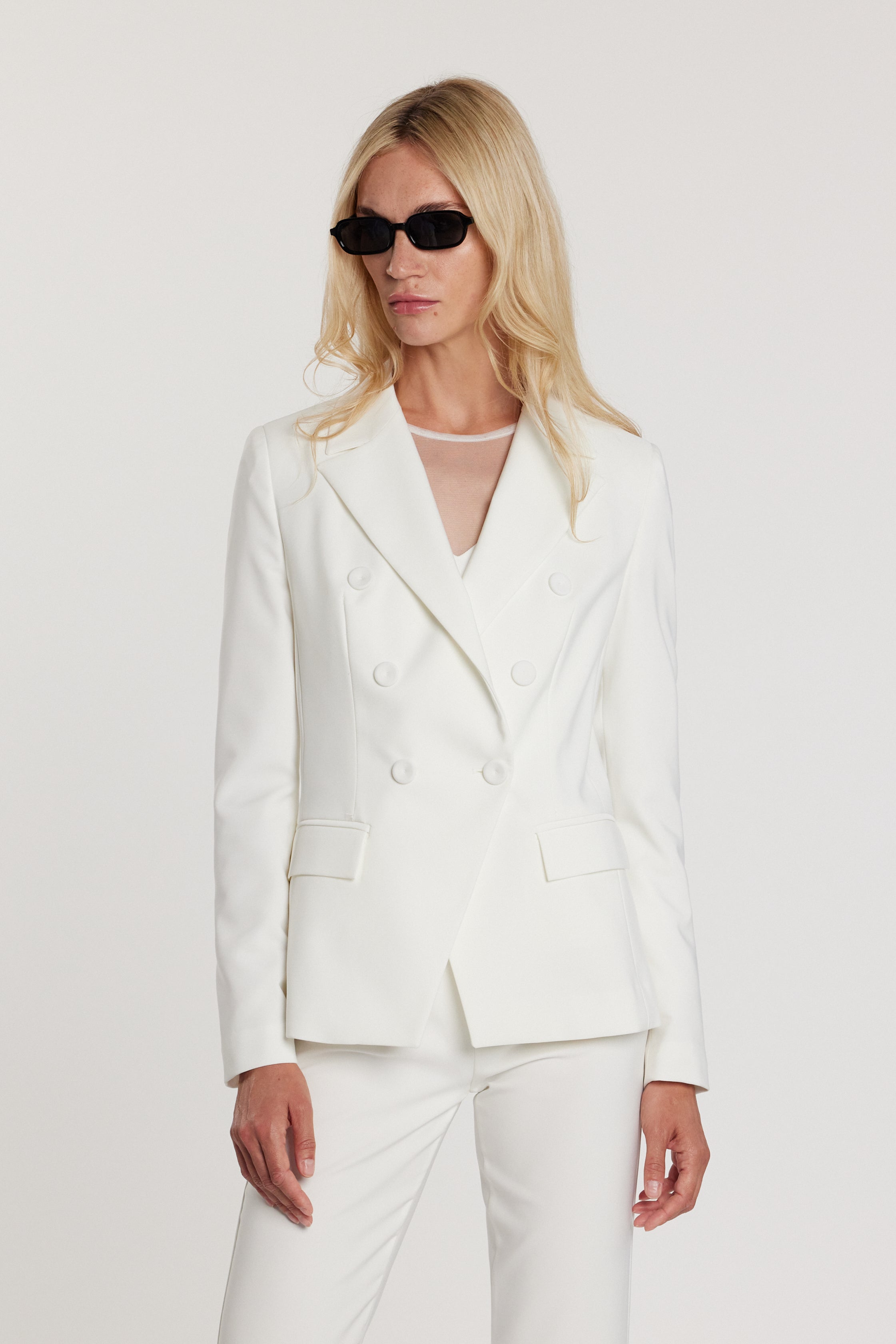 Giacca Belsa maniche lunghe doppio petto con tasche e patte, una giacca dal gusto elegante e strutturato. Il doppio petto enfatizza la silhouette con equilibrio, mentre i dettagli sartoriali rendono il capo ideale per outfit formali, cerimonie o contesti professionali di alto livello.