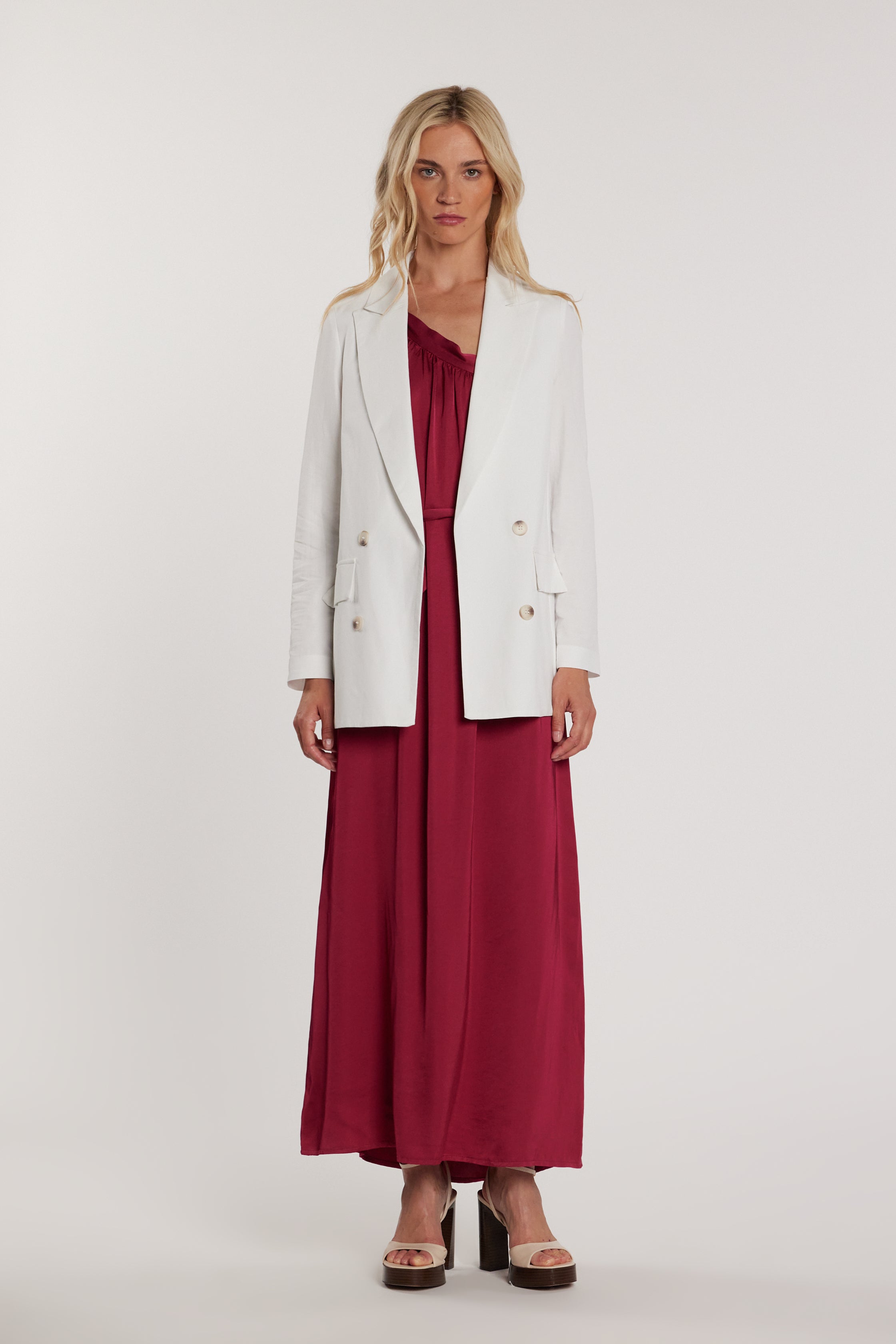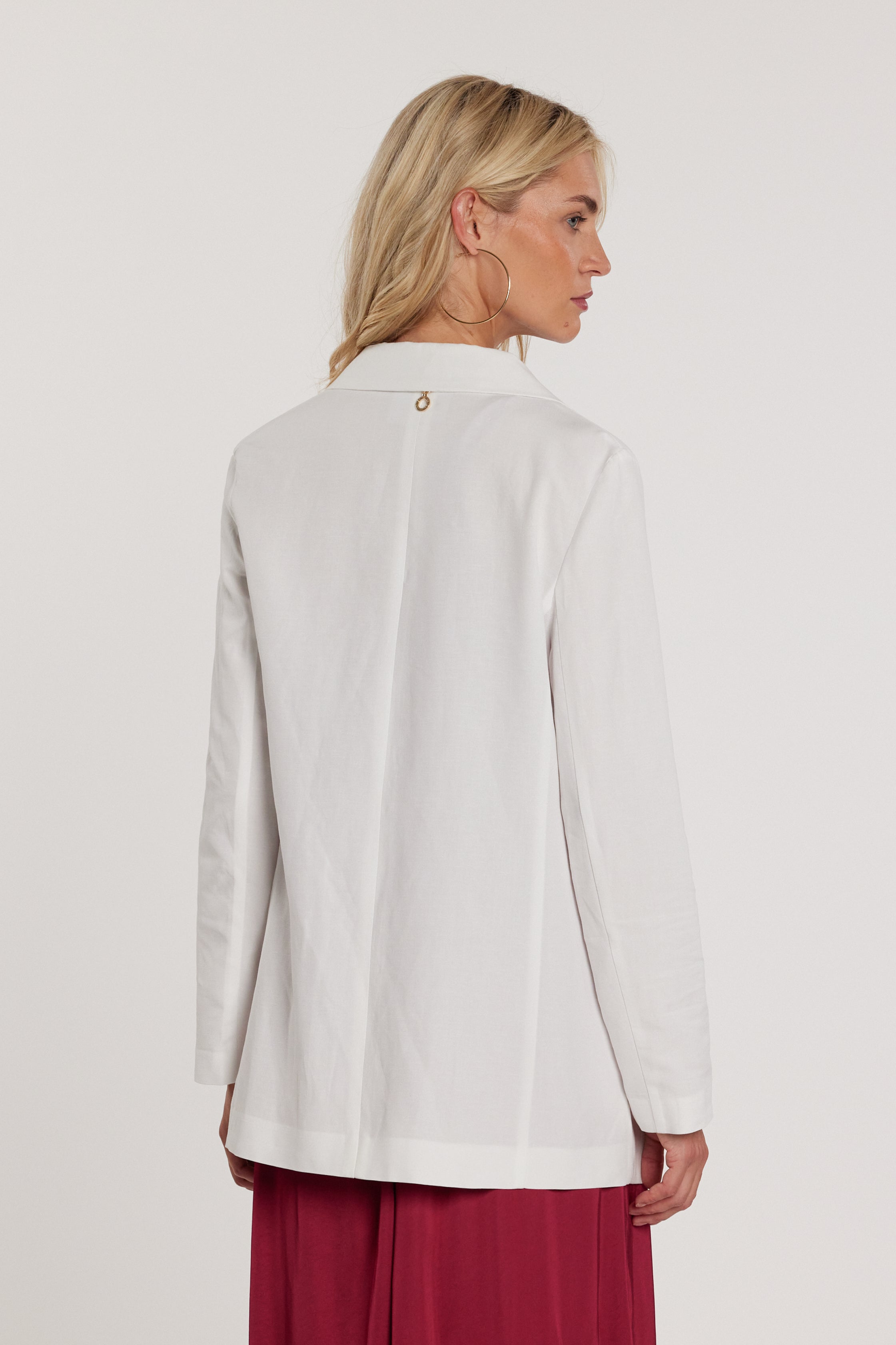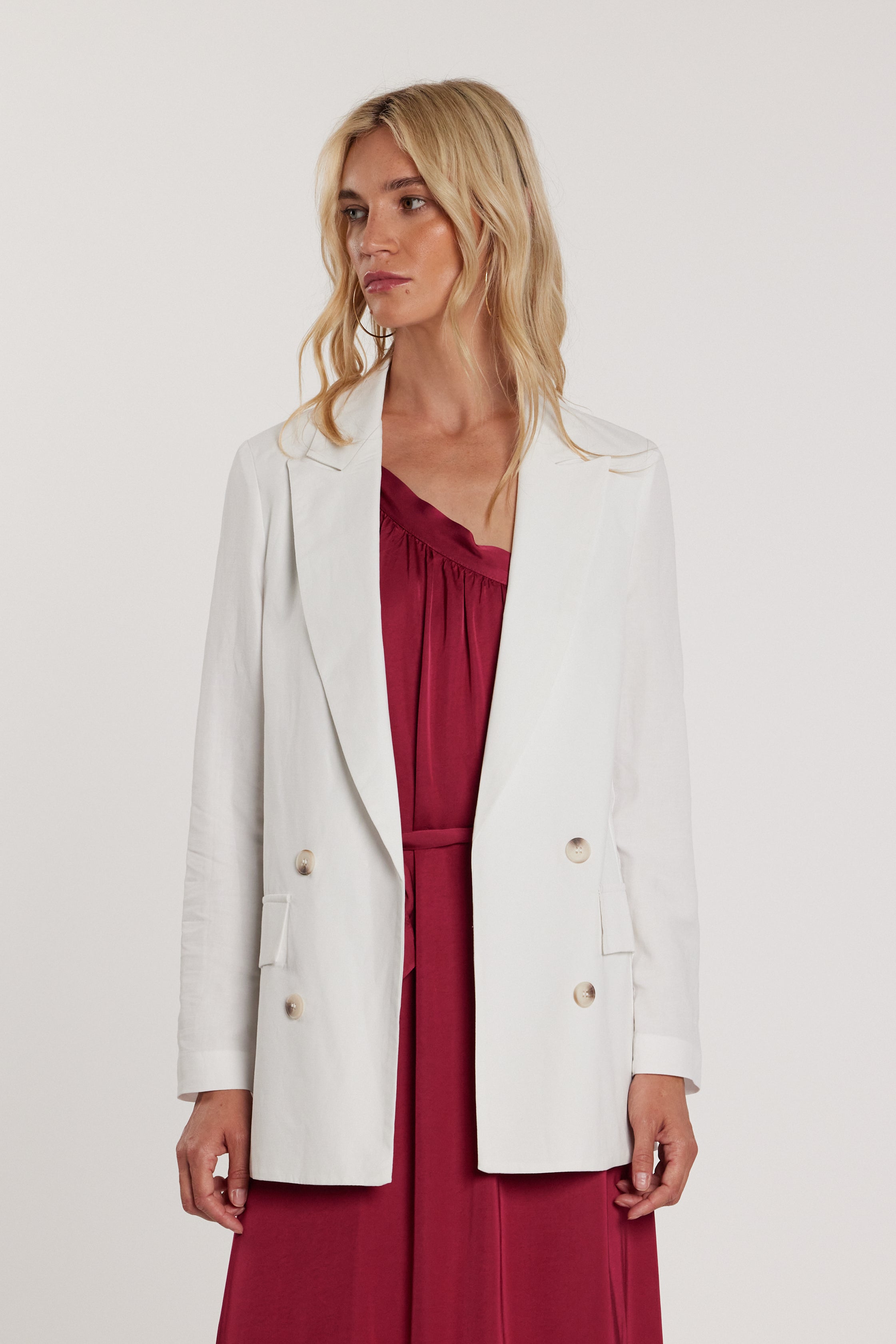Giacca Gabryel maniche lunghe effetto doppio petto sfoderata con patte, un capo leggero e moderno che conserva il fascino della giacca classica. La struttura sfoderata la rende confortevole e versatile, perfetta per outfit raffinati da giorno o sera.
