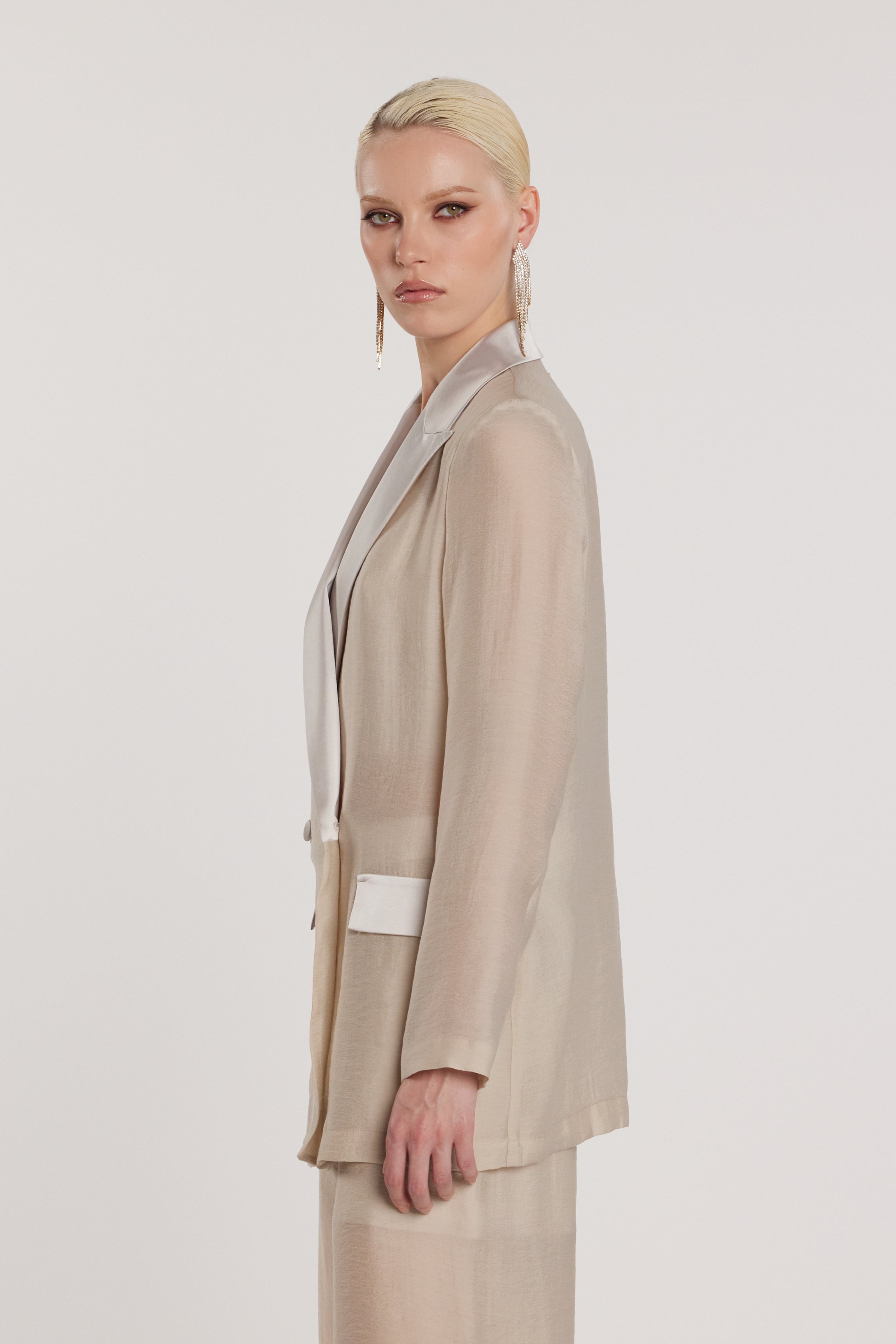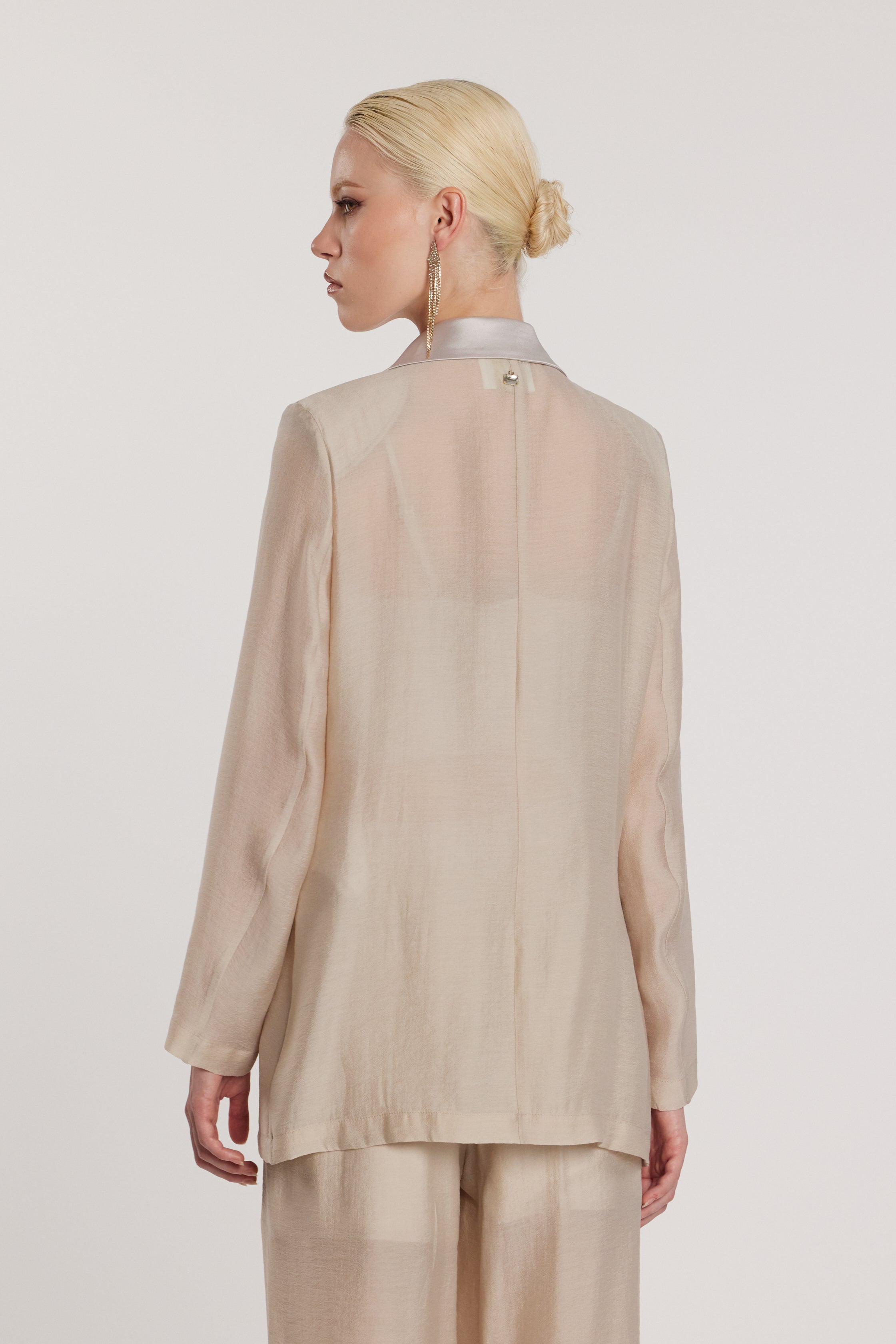 Giacca Galiena a maniche lunghe, elegante e sofisticata, con doppia abbottonatura, revers strutturati e patte in raso sottile. Dettagli raffinati che esaltano lo stile sartoriale, perfetta per look formali o outfit chic da giorno e da sera.