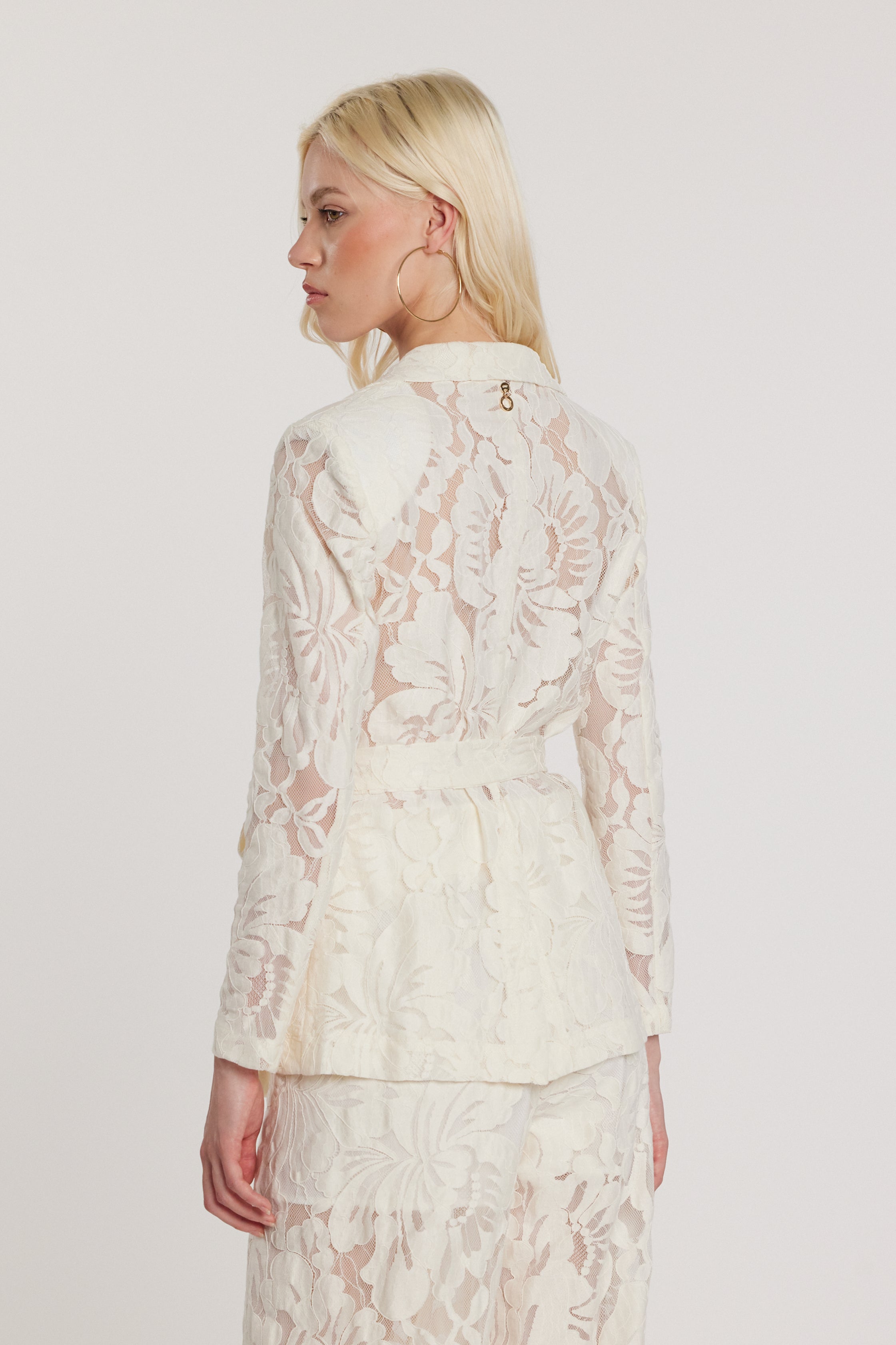 Giacca Rampling maniche lunghe con tasche toppa, cintura e dettagli in pizzo, un modello romantico e sofisticato. Il pizzo aggiunge delicatezza, mentre la cintura valorizza la vita con eleganza, rendendola ideale per look ricercati e femminili.