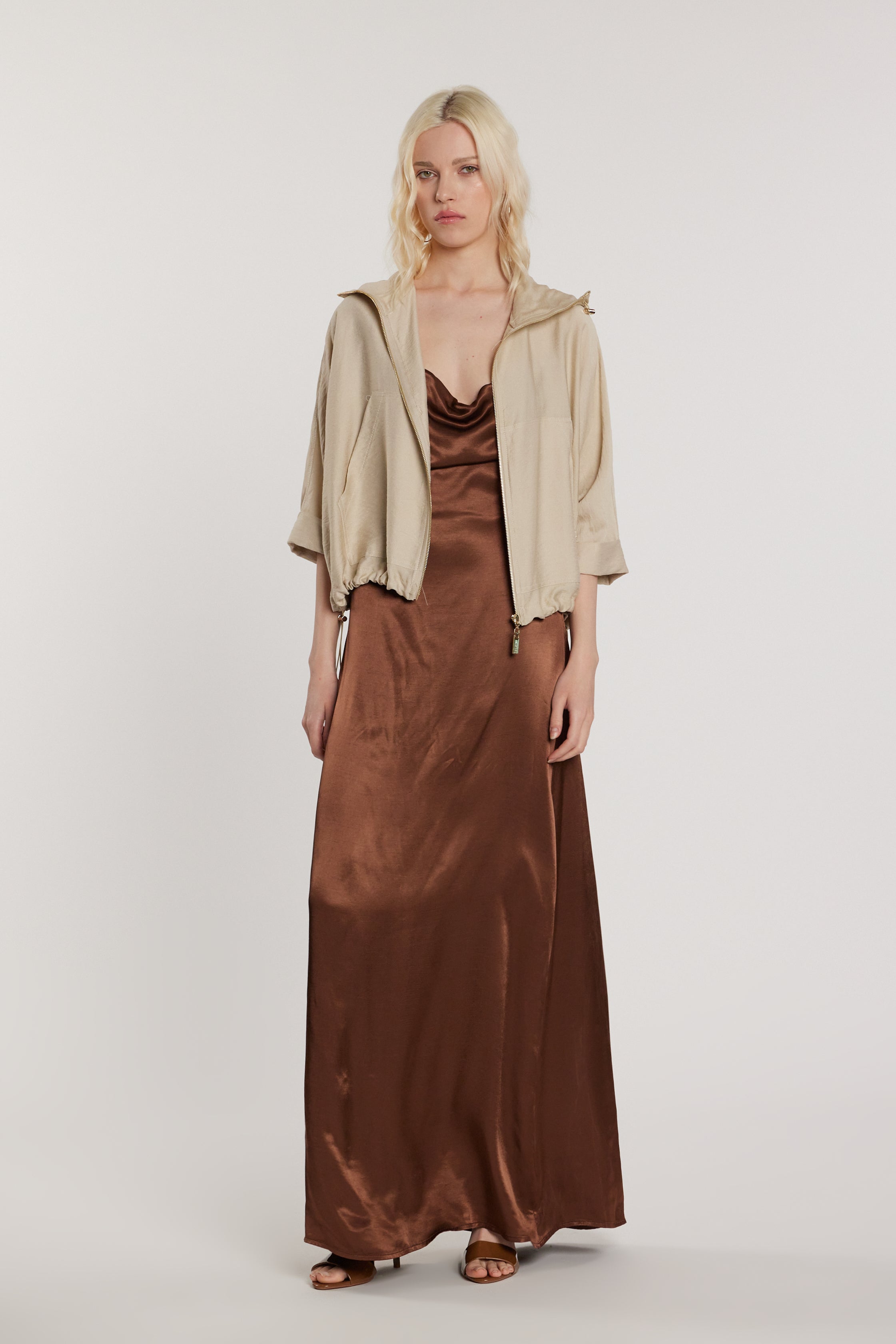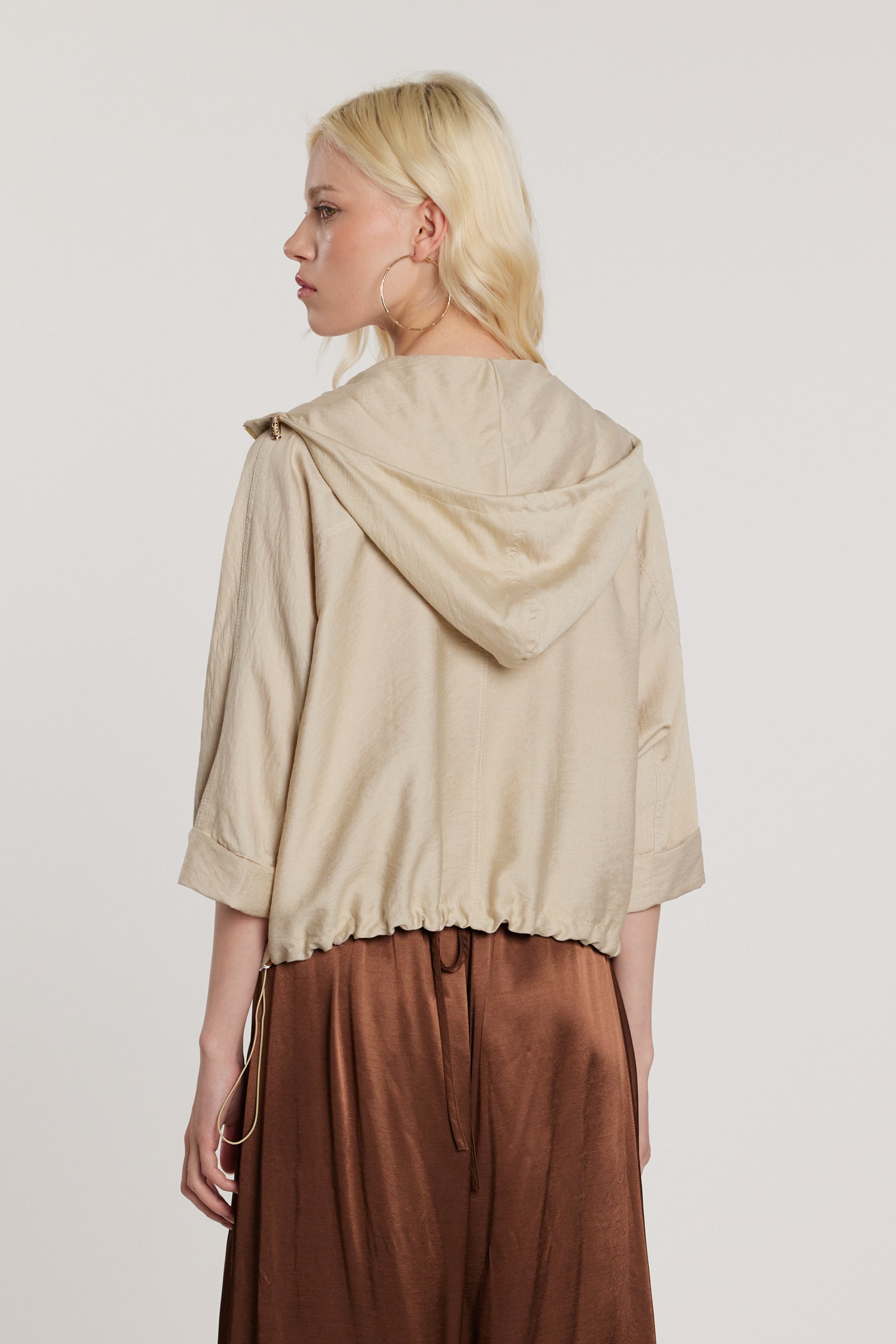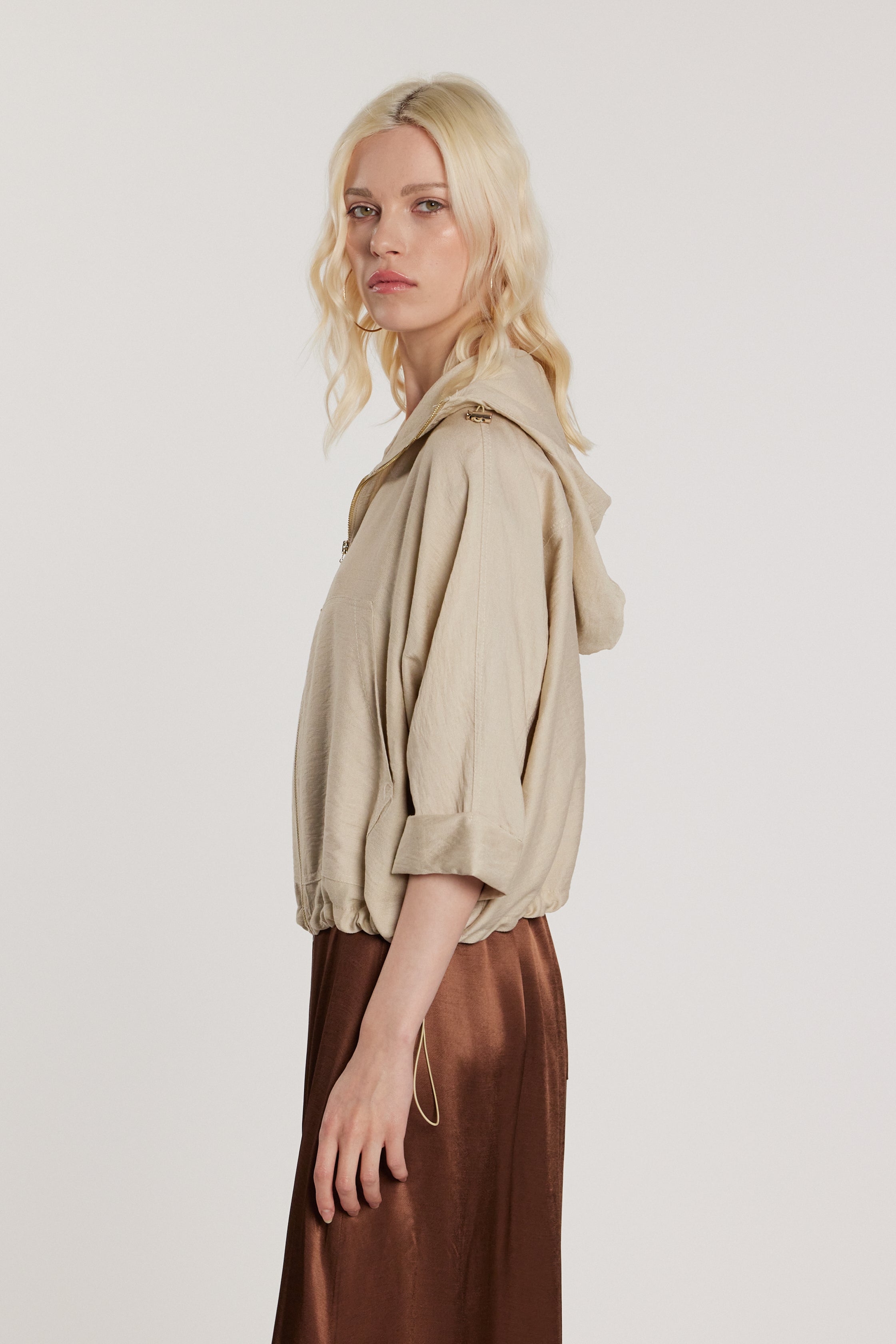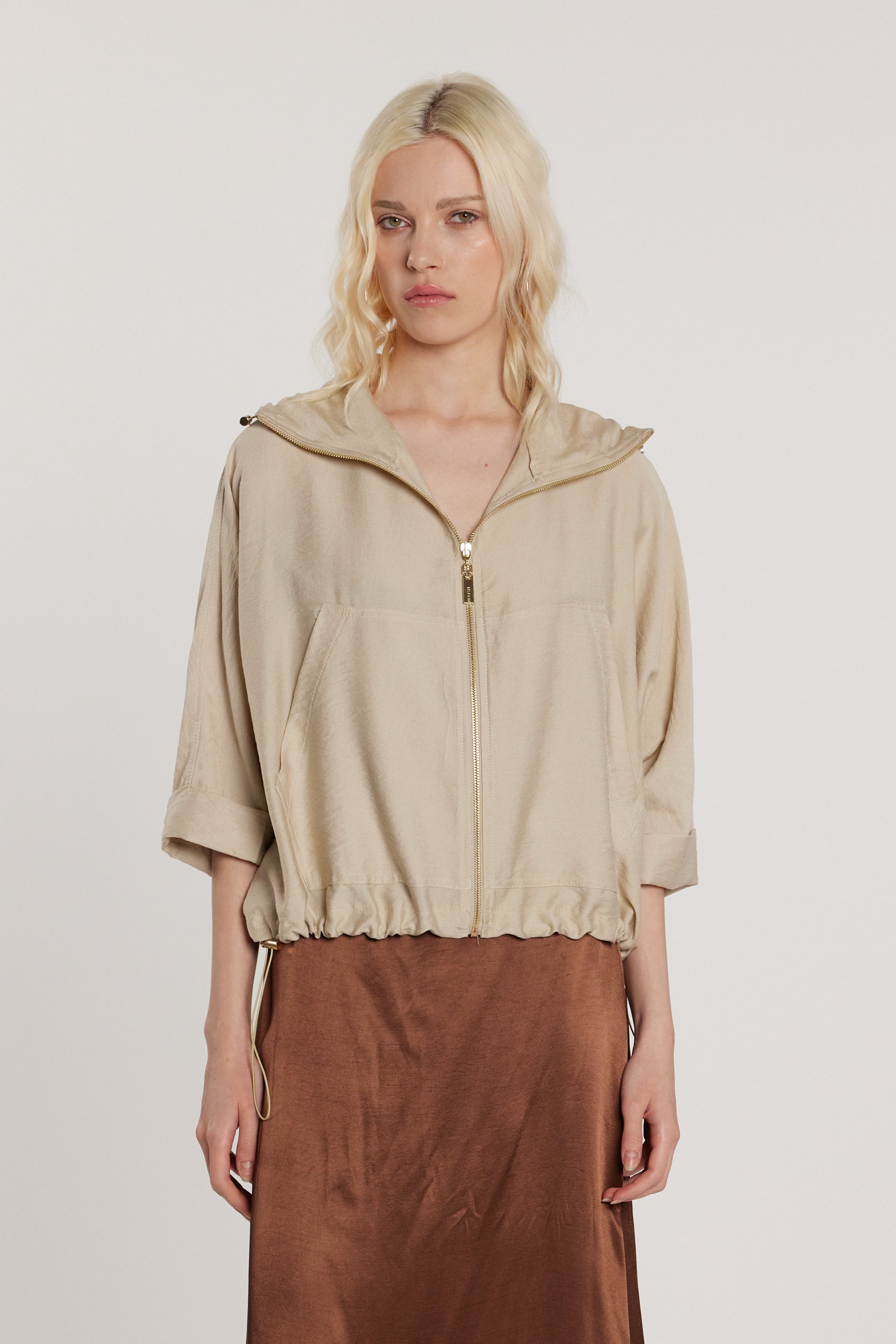 Giubbino Lorysa maniche tre quarti pipistrello con cappuccio, tasche, zip e coulisse, un modello contemporaneo e confortevole. Il volume delle maniche e la coulisse permettono di modulare la vestibilità, creando uno stile dinamico e moderno.