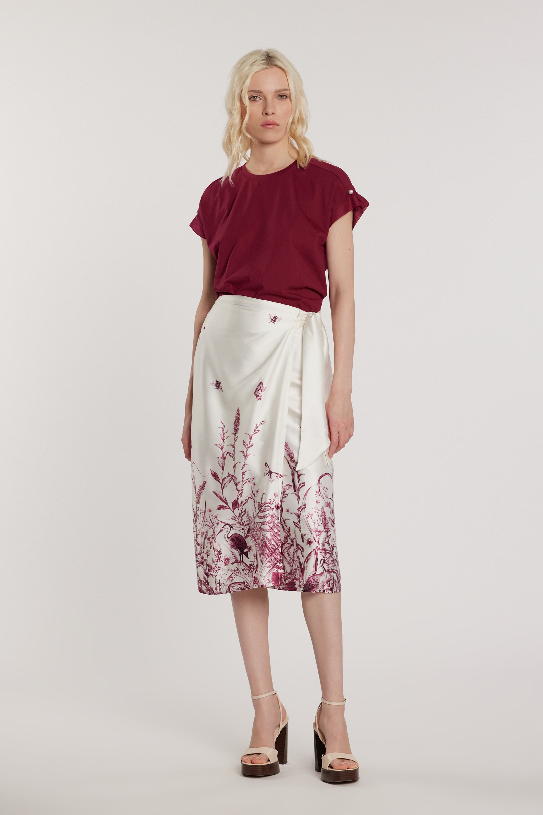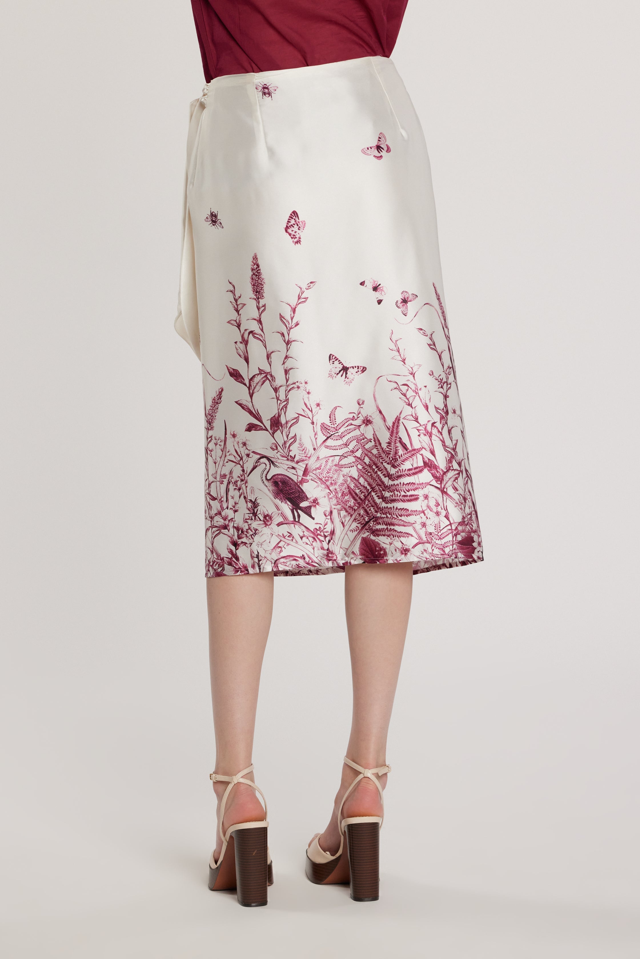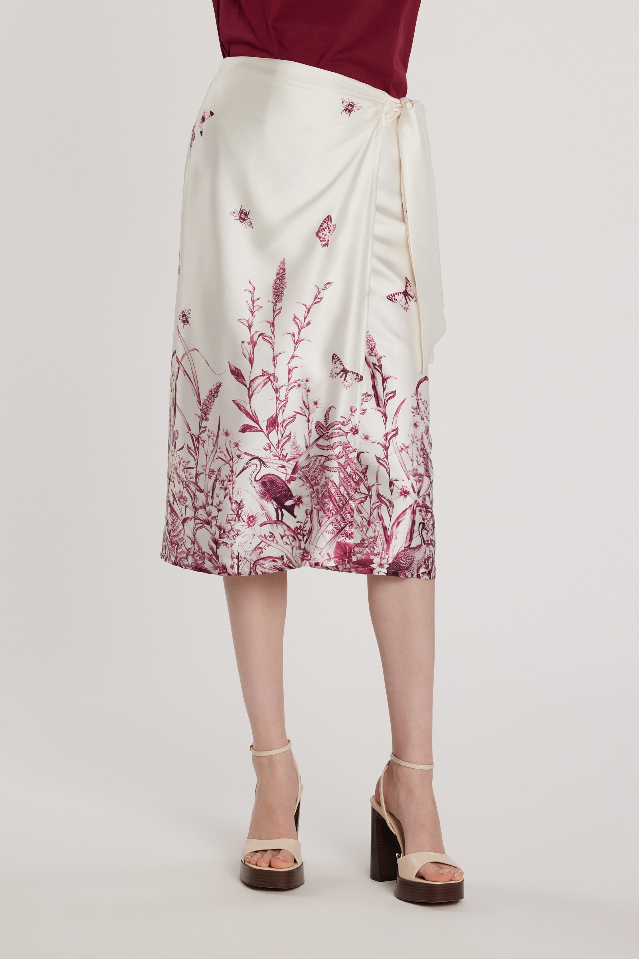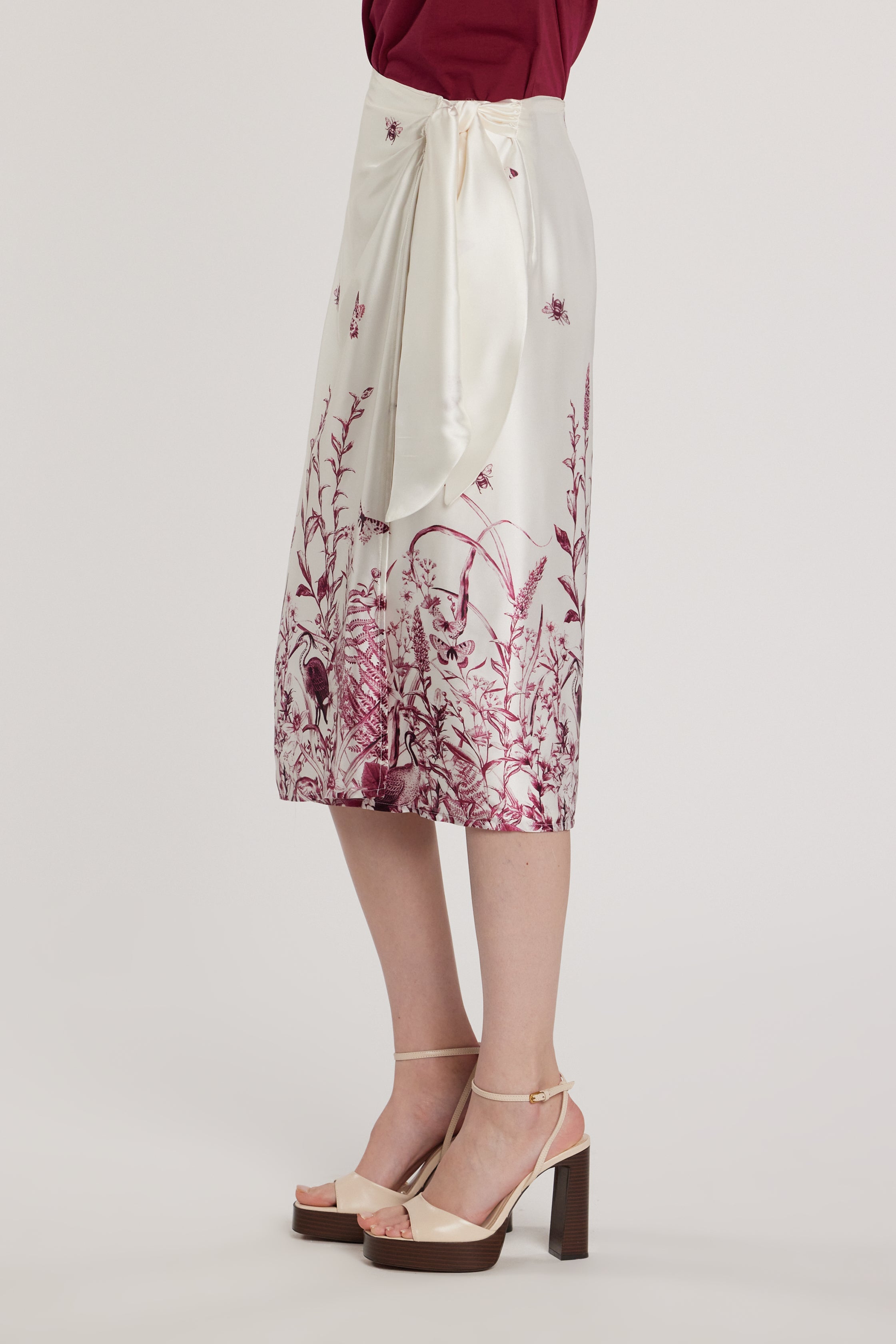 Longuette Magee vita alta con fusciacca e spacco fantasia butterfly, un capo romantico e scenografico. La fusciacca valorizza la vita, mentre lo spacco e la fantasia aggiungono charme couture e movimento elegante.