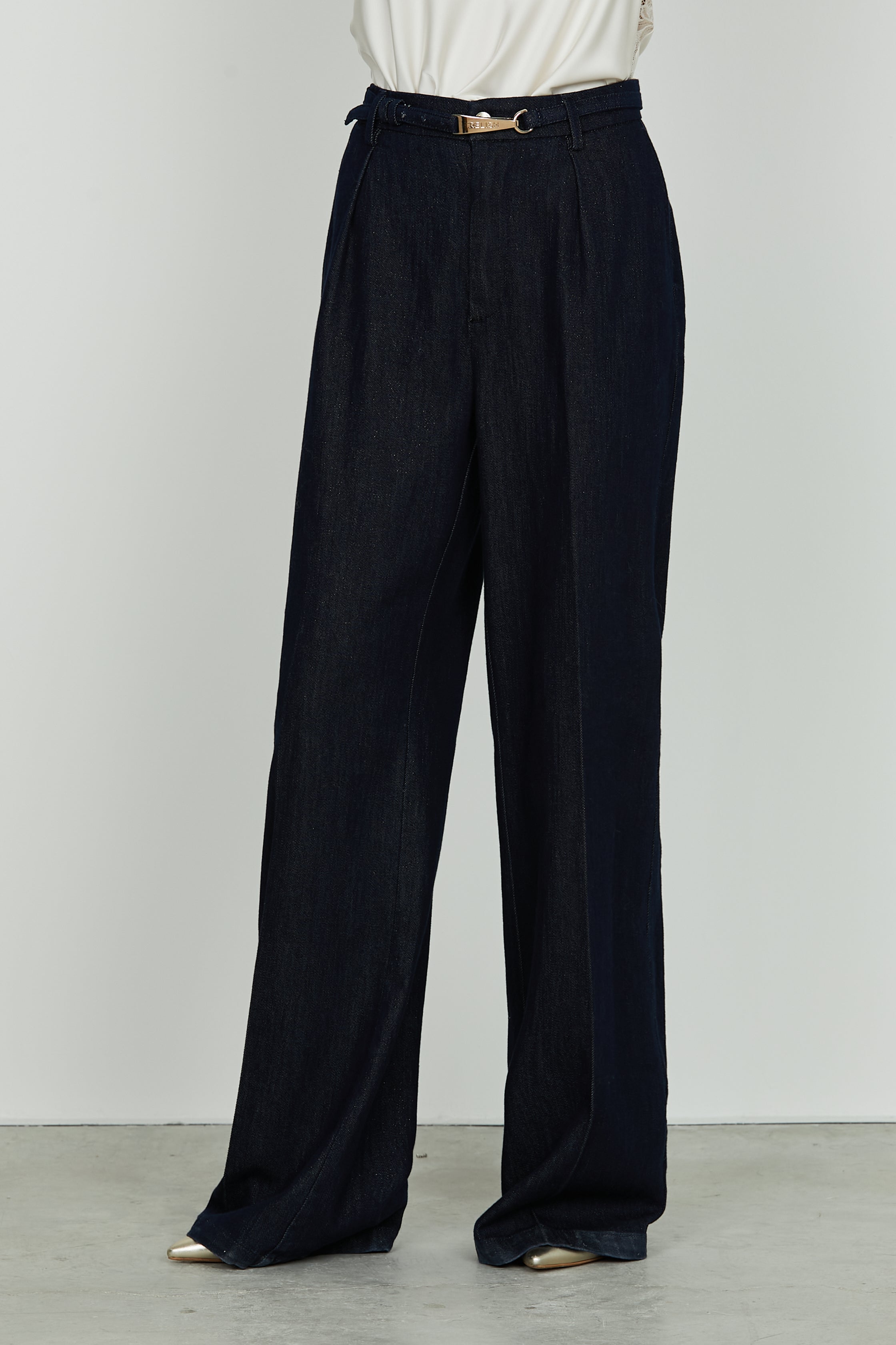 Pantalone "ALAIN_20" a vita alta, dallo stile elegante e contemporaneo. Caratterizzato da tasche alla francese, pinces frontali e cintura coordinata con alamaro, che sottolinea la vita e aggiunge un dettaglio sofisticato. La vestibilità "Wild Fit" garantisce comfort e una linea fluida, valorizzando la figura senza rinunciare alla praticità. Realizzato in una raffinata tonalità di blu scuro, è ideale per look da ufficio o per occasioni formali dal gusto moderno.