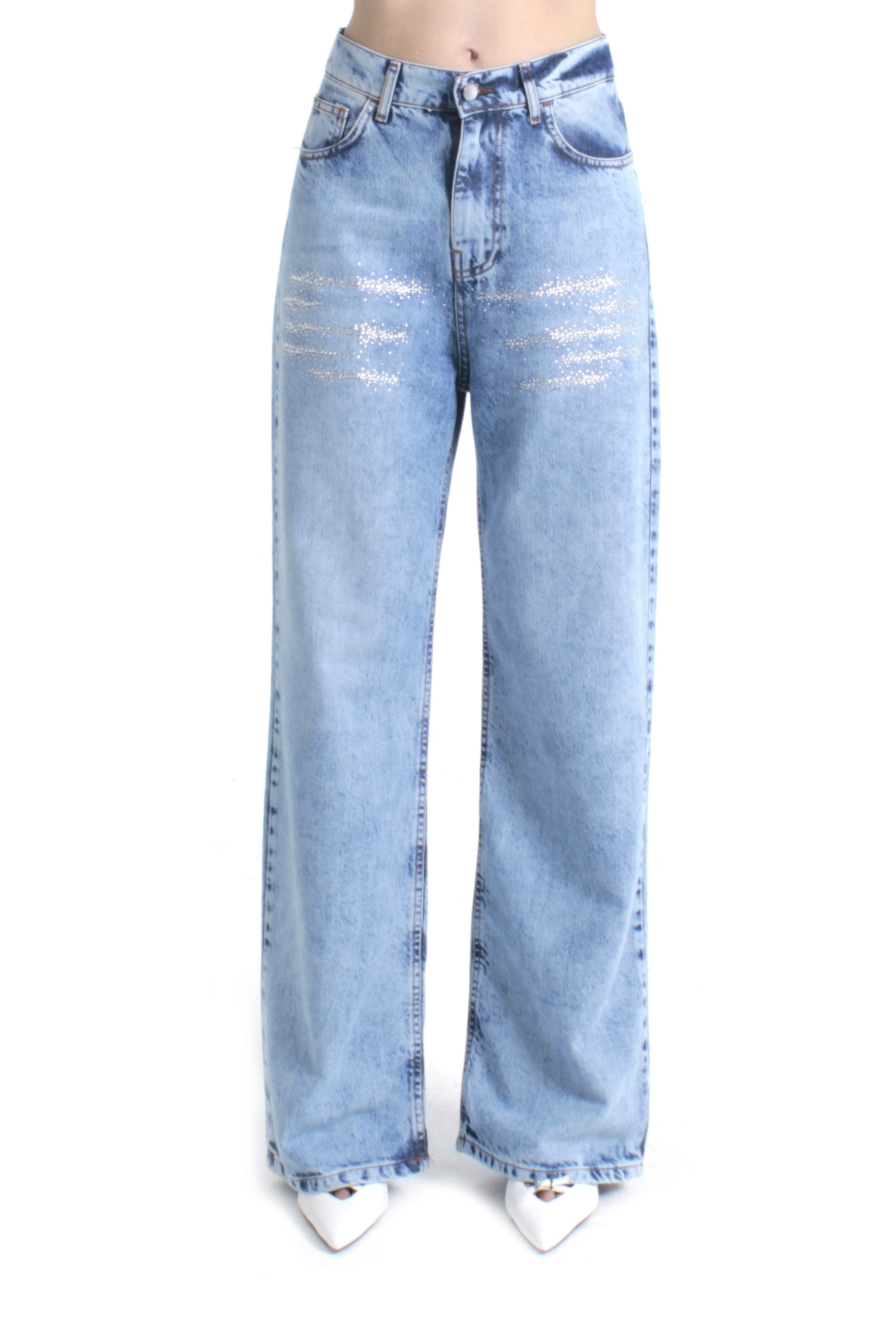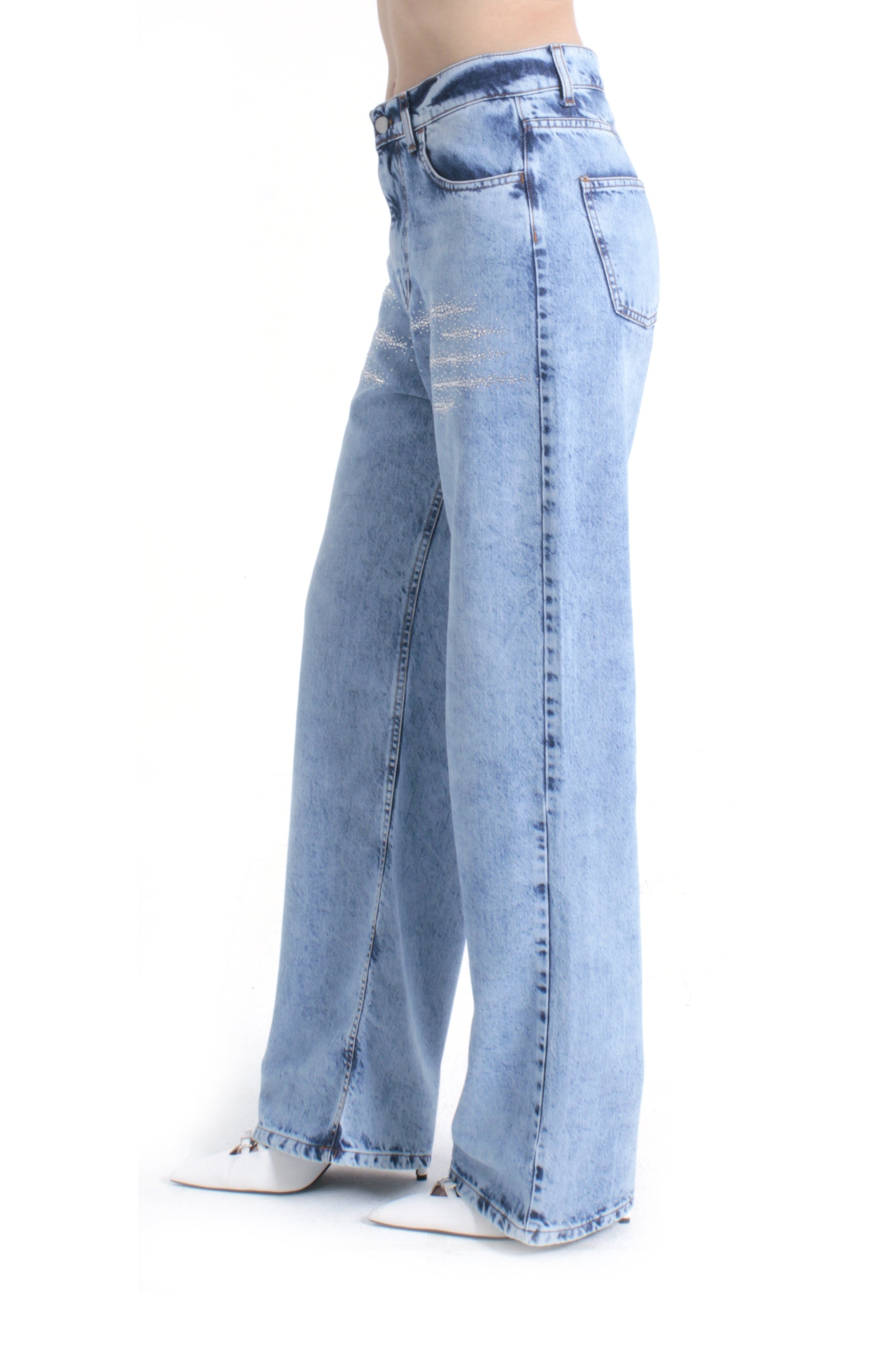Pantalone Giselle_23 vita media cinque tasche con applicazioni strass, loose fit in denim blu, un modello glamour e contemporaneo. Gli strass donano luminosità discreta, mentre il fit morbido garantisce comfort senza rinunciare allo stile, ideale per look urban chic.