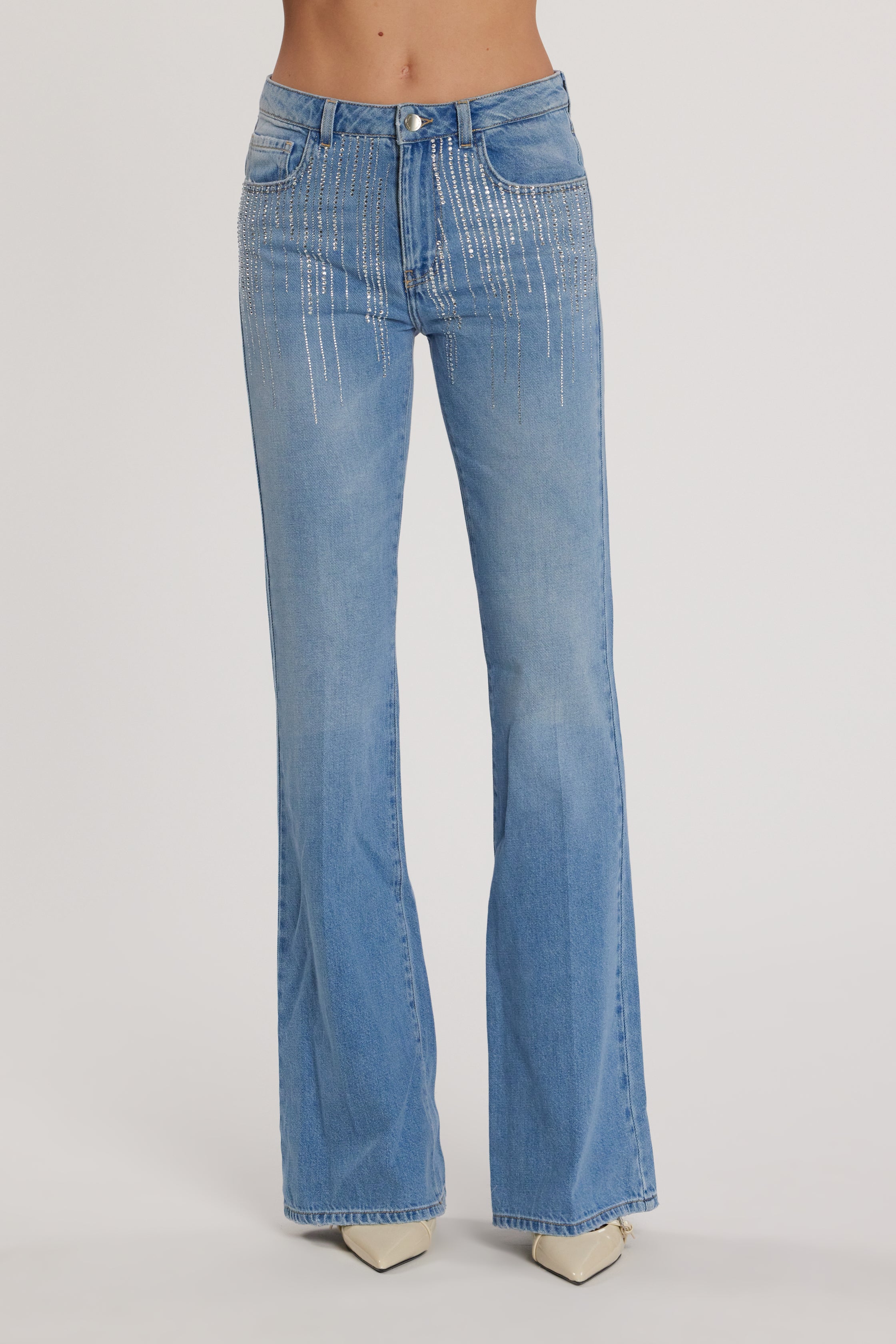 Pantalone SCHIFFER_210 vita media cinque tasche con applicazioni strass flaire fit denim blu