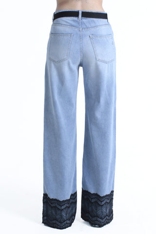 Pantalone ELLELONG_27 vita media con cintura più applicazioni pizzo fondo straight fit denim blu