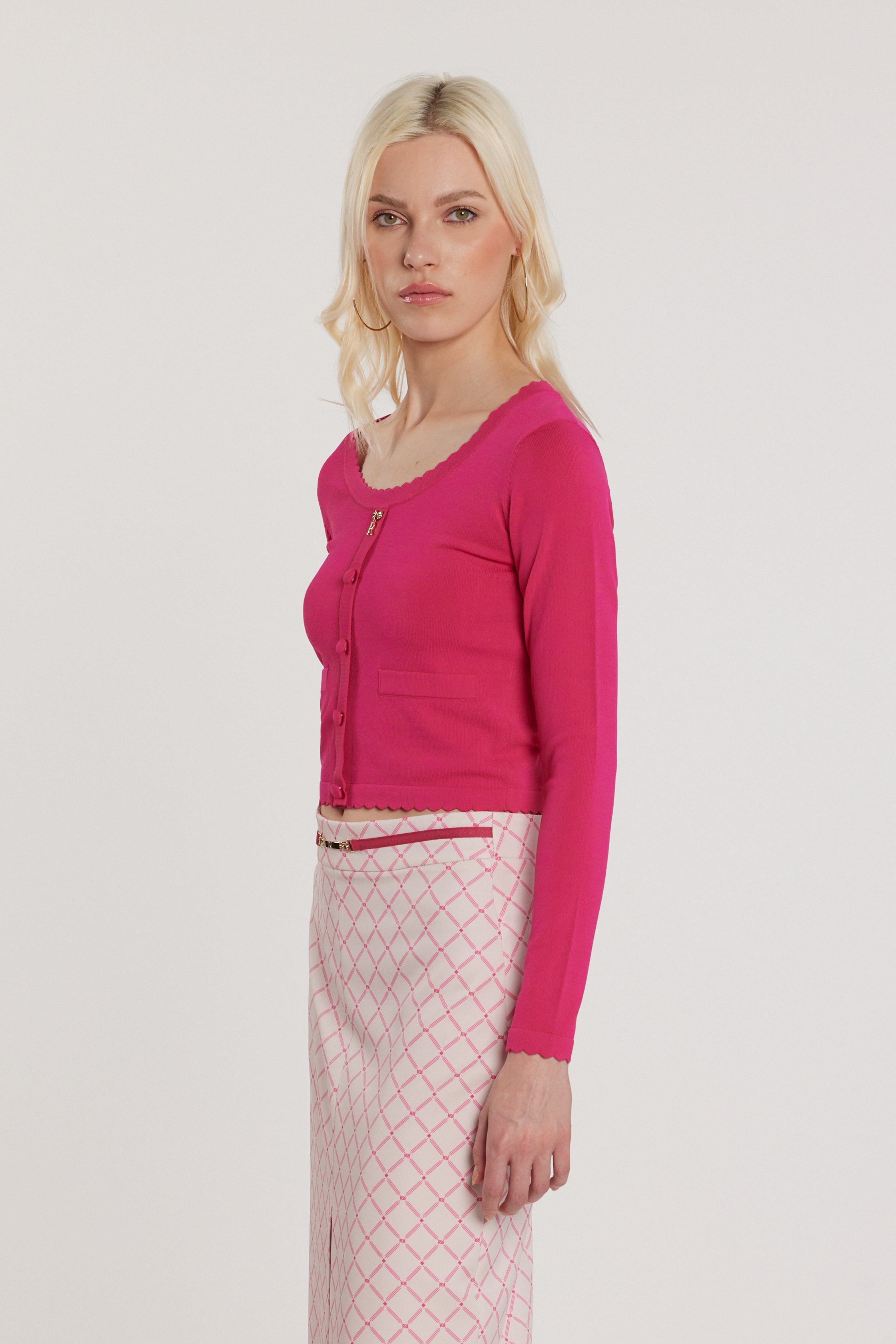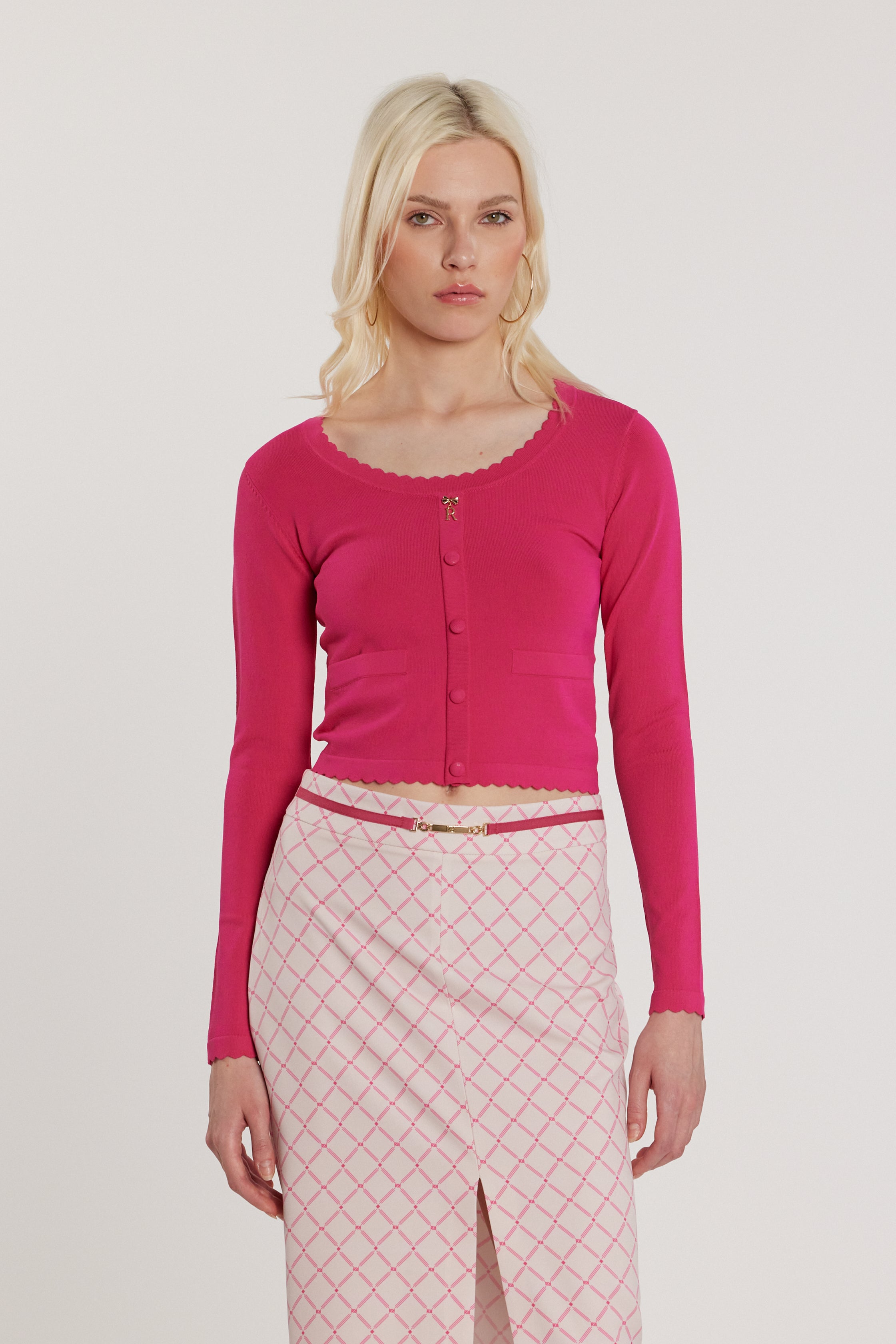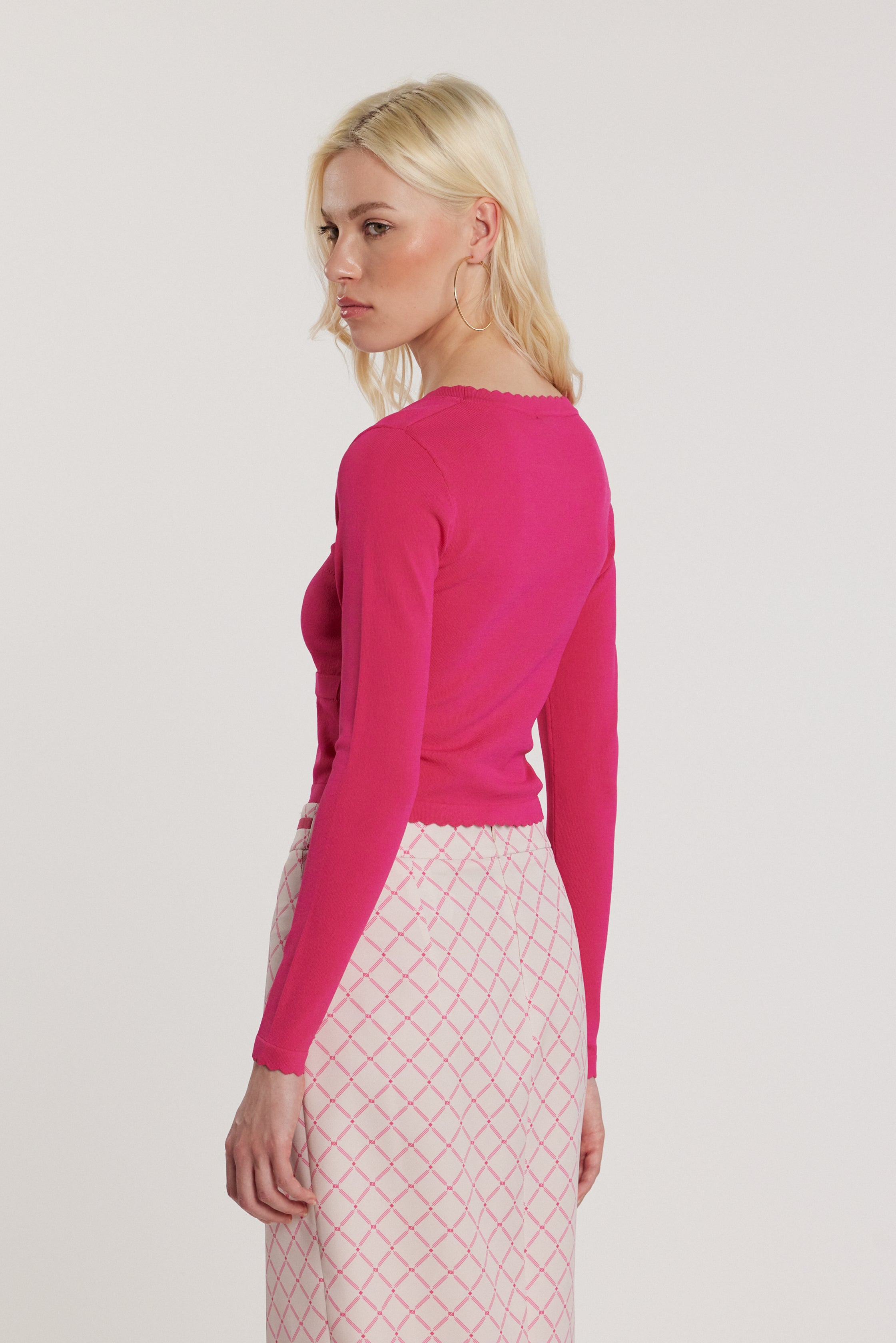 Maglia Adele maniche lunghe con scollo a madonna, finte aperture, bottoni e applicazioni logo con fiocco, un capo romantico e sofisticato. Gli accessori luminosi donano charme couture, mentre la linea avvolgente valorizza la figura con eleganza discreta.