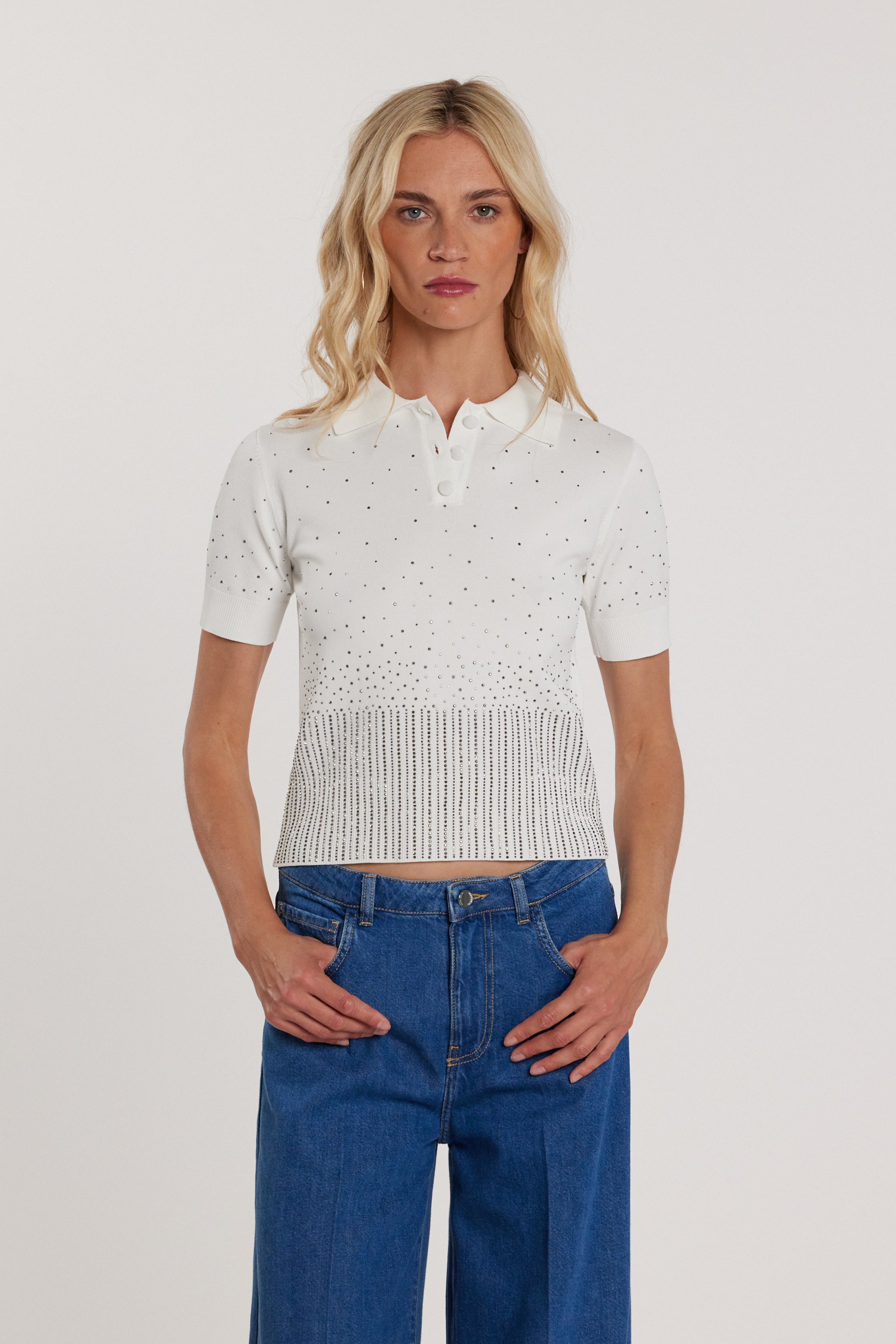 Maglia Keram maniche lunghe a polo con applicazioni di strass, un modello raffinato e contemporaneo. Gli strass donano luminosità, mentre il taglio classico valorizza la figura con femminilità discreta. Perfetta per look da giorno eleganti o serate informali chic.