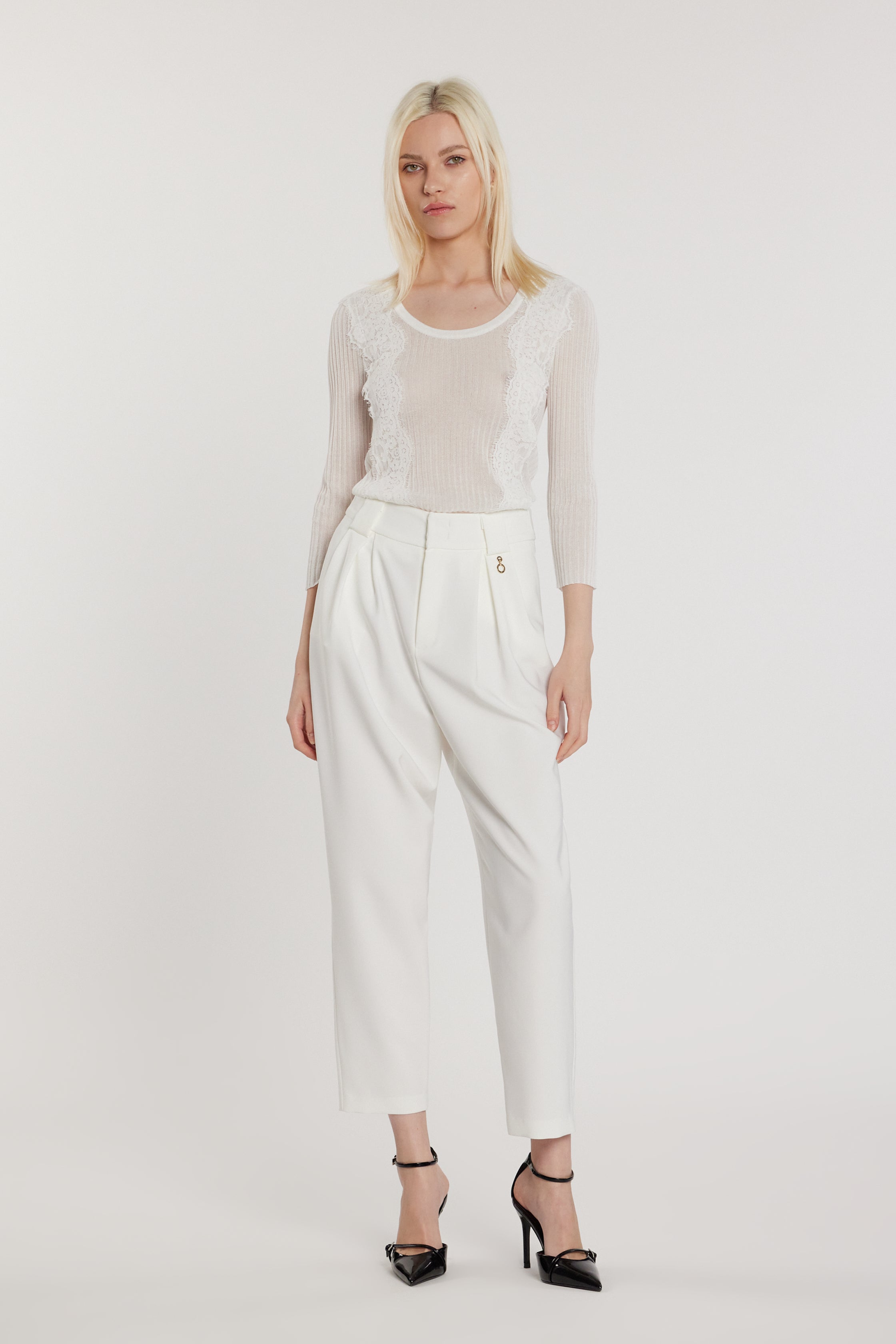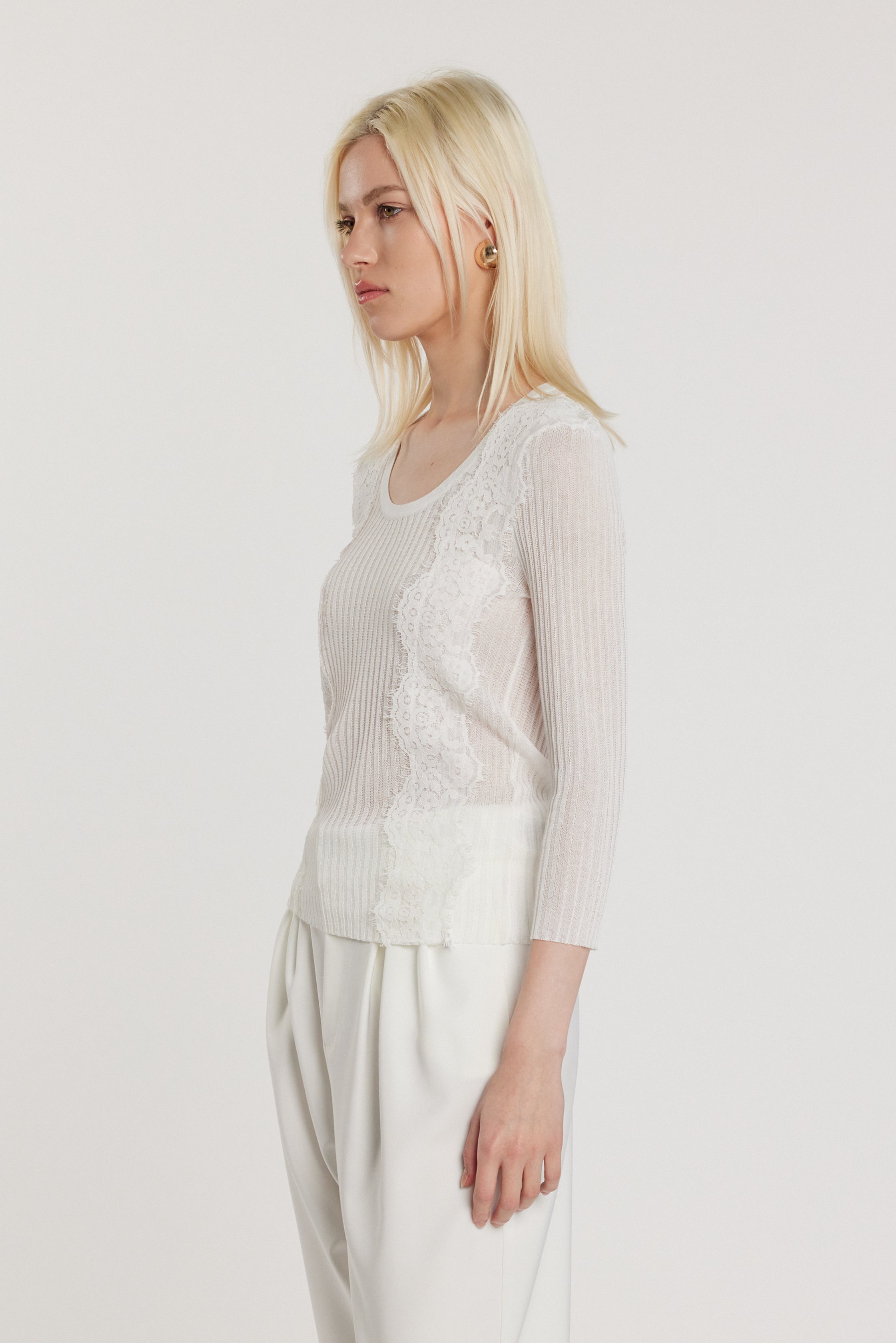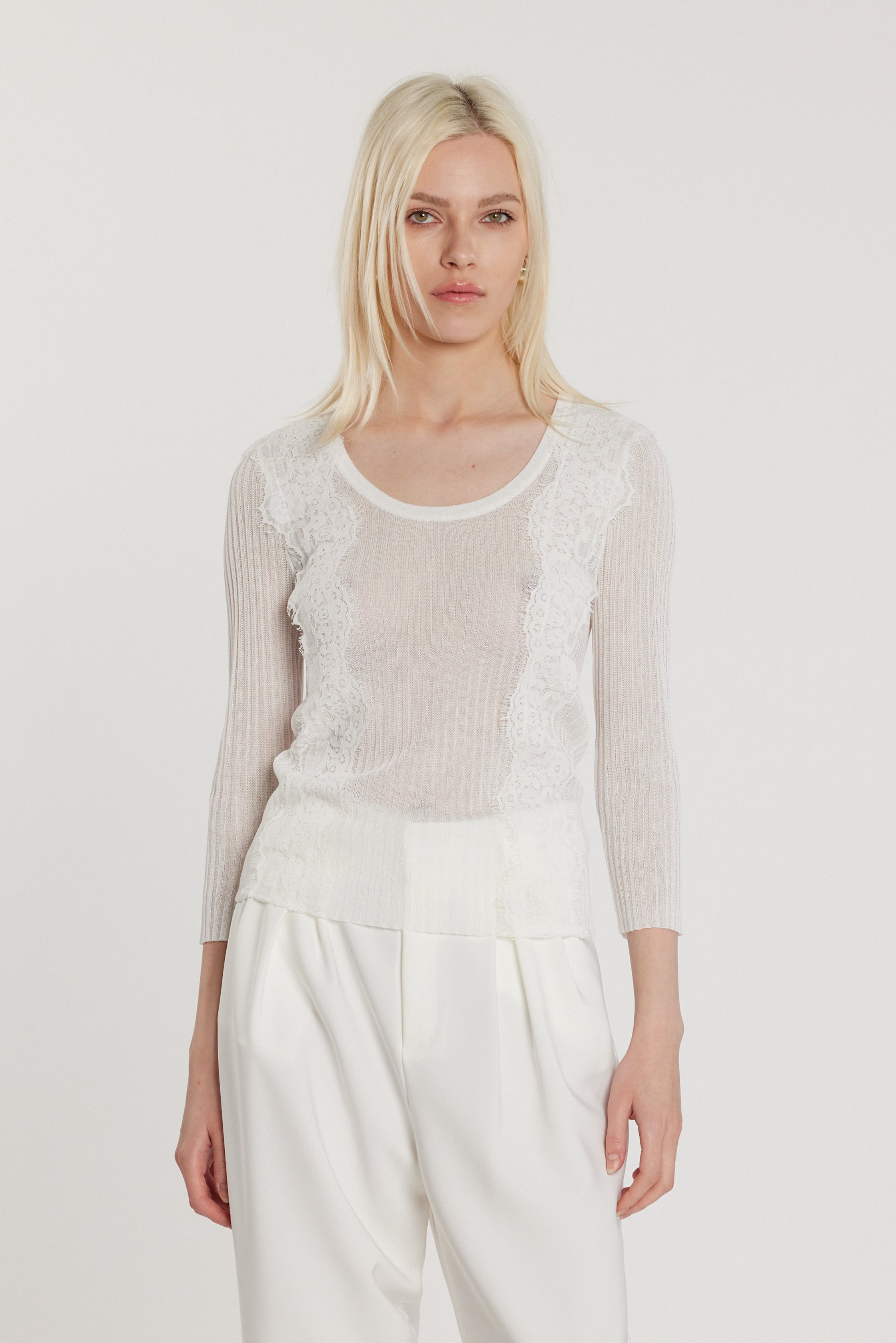 Maglia Novac maniche tre quarti con scollo a madonna e inserti in pizzo su costina, un modello elegante e femminile. Il pizzo e la linea morbida valorizzano la silhouette, ideale per outfit raffinati da giorno o serali.