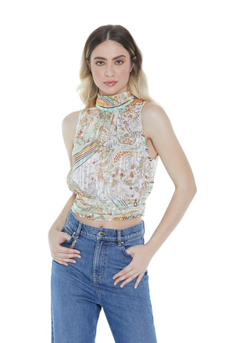 Blusa YUI senza manica con fusciacca più apertura schiena più pieghe fant.foulard più lurex