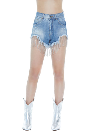 Shorts MAMI vita alta 5 tasche fondo sfrangiato con catene con strass denim