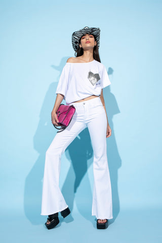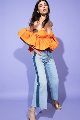 Jeans KOI vita alta zampa fondo sfrangiato denim