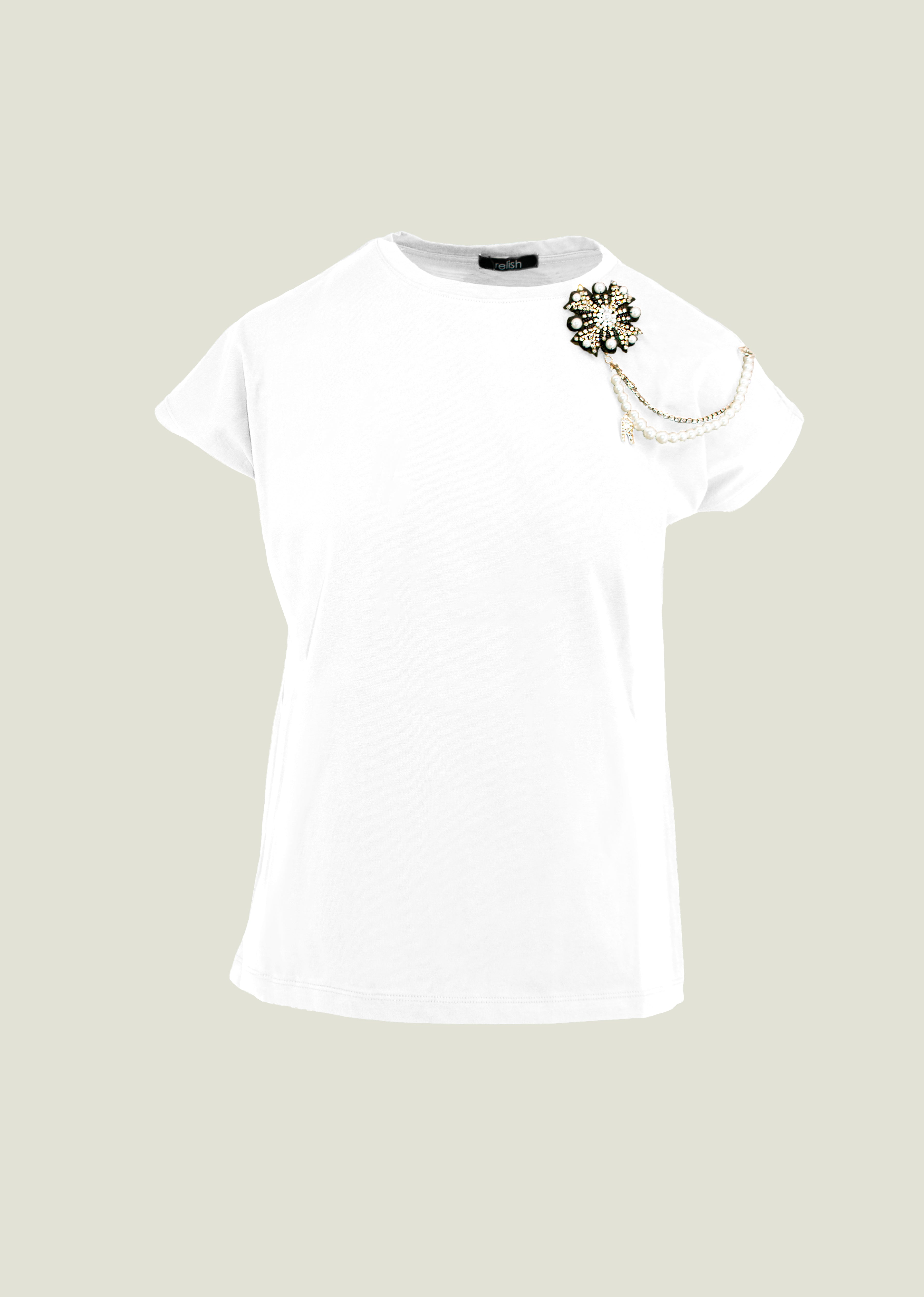 I dettagli sono il fulcro dello stile e nella t-shirt NICETO troviamo protagonista una spilla con collana che decora la spalla.
