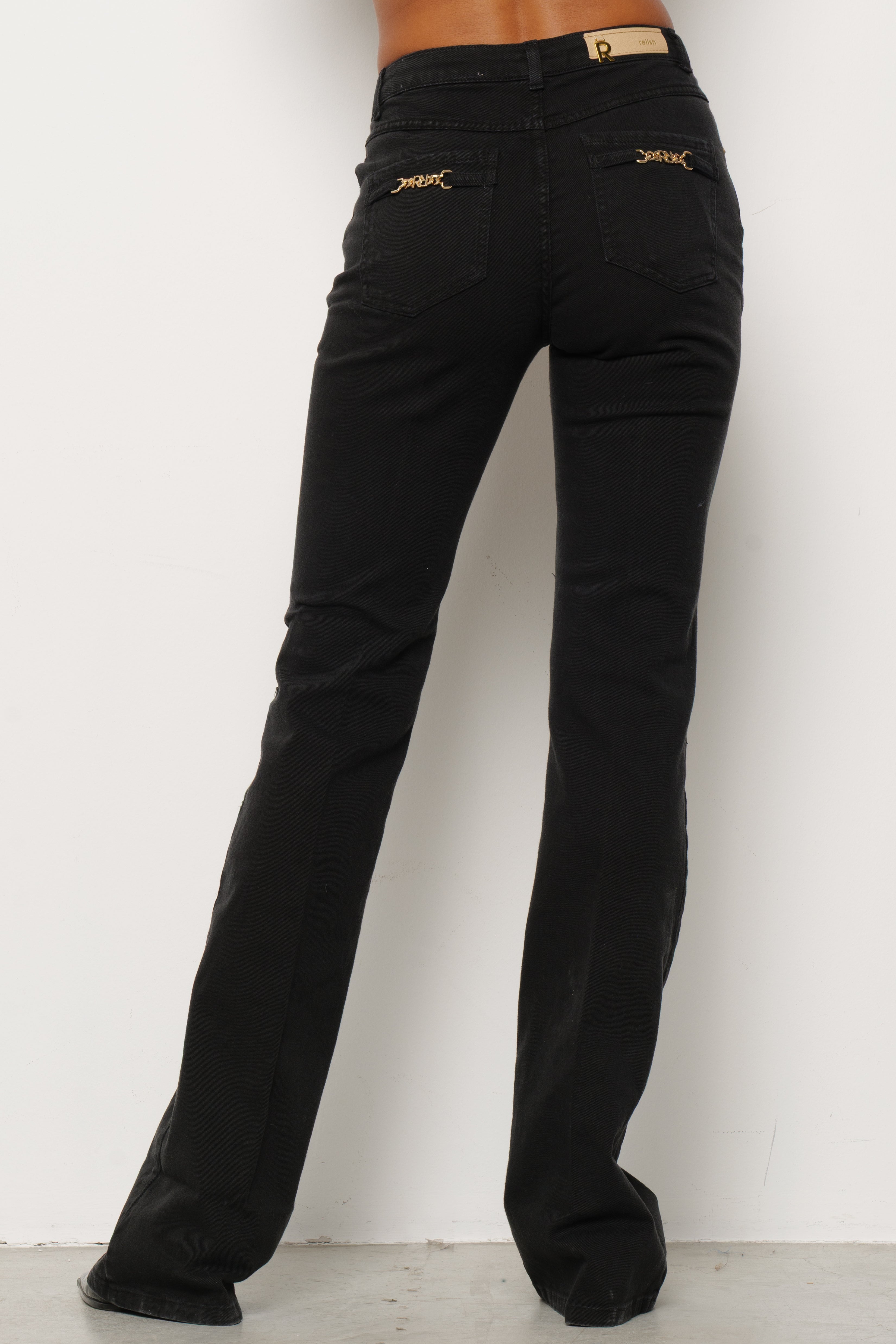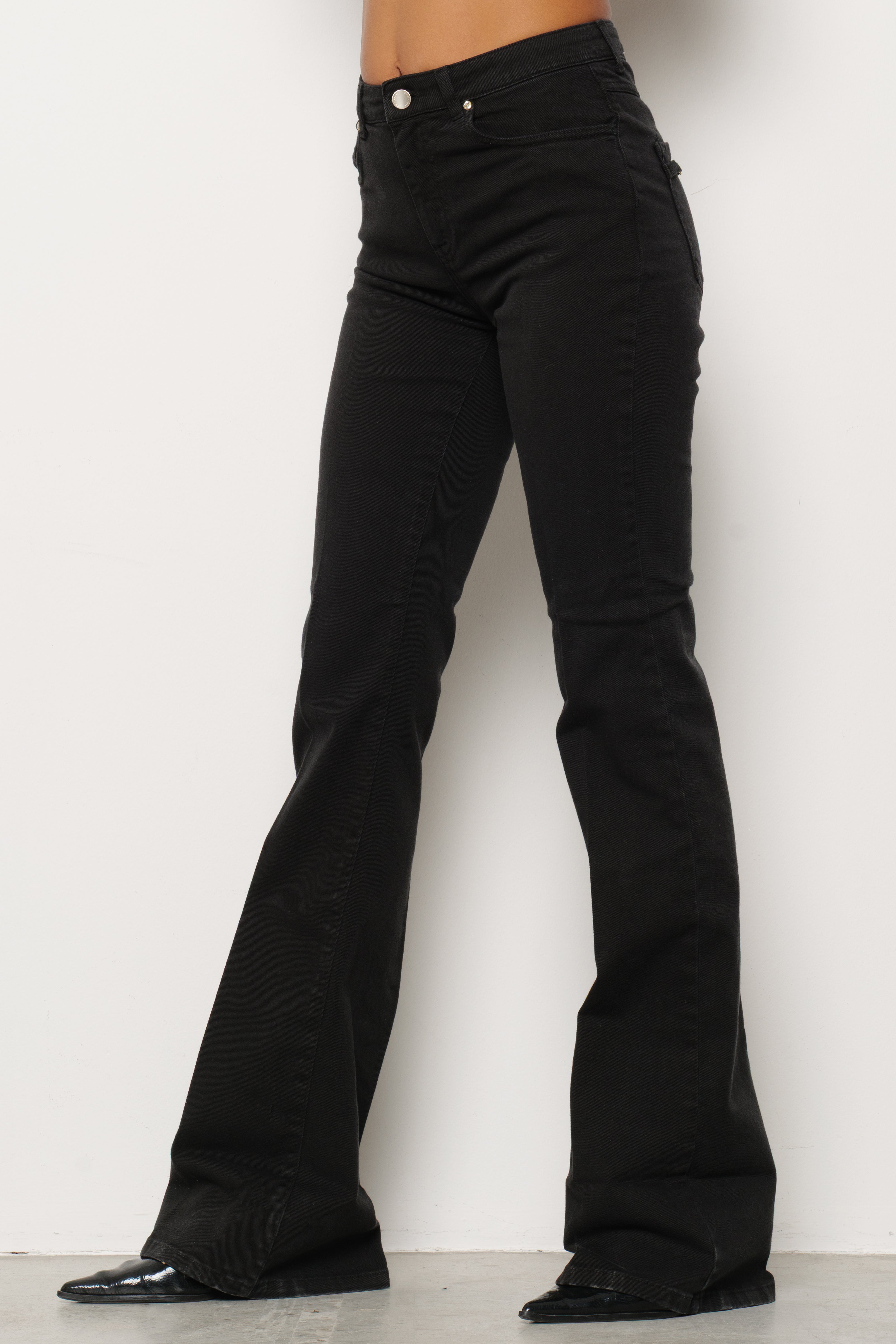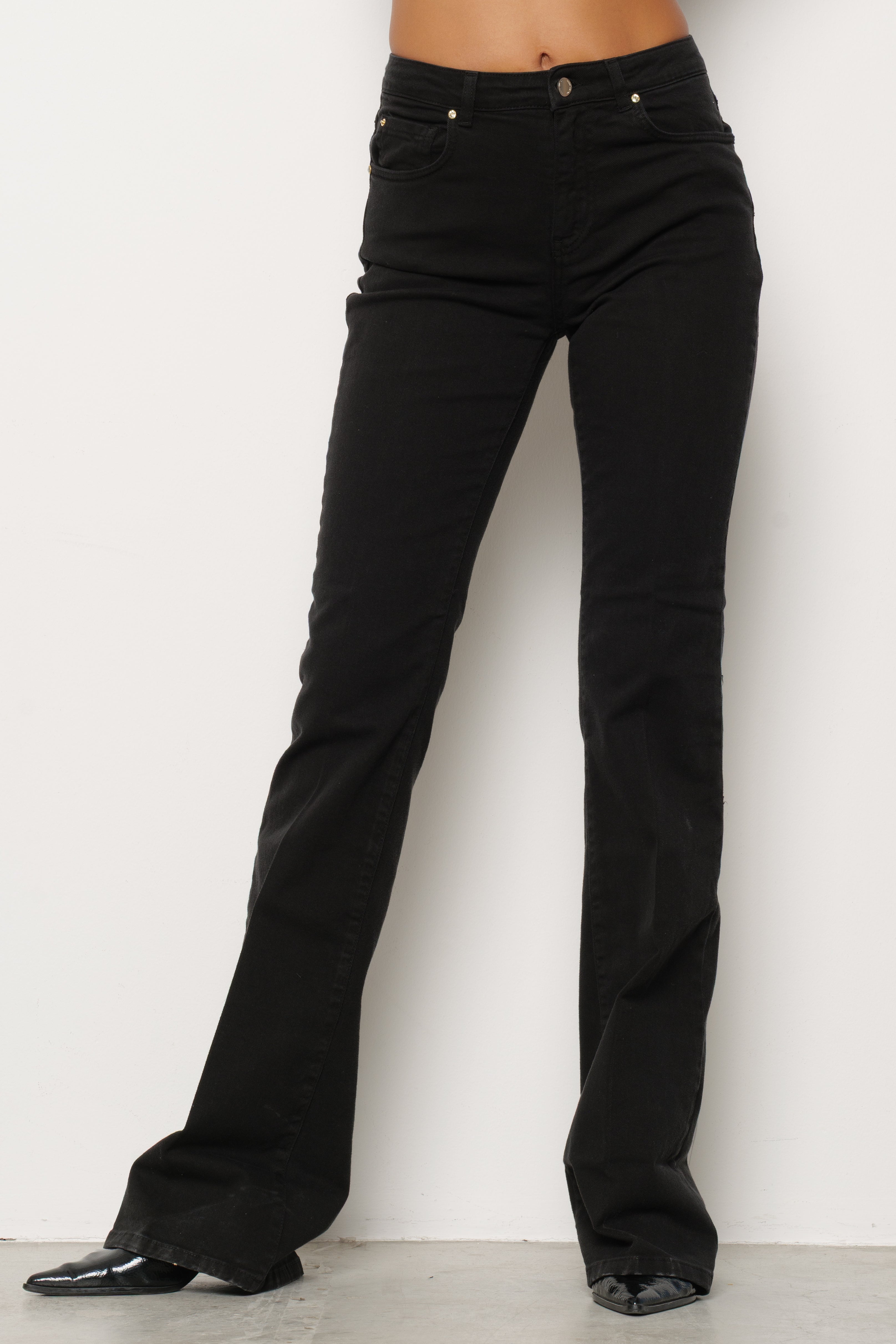 Jeans a vita media con taglio flare, design a 5 tasche, vestibilità comoda e linea slanciata. Perfetti per look casual o più sofisticati.