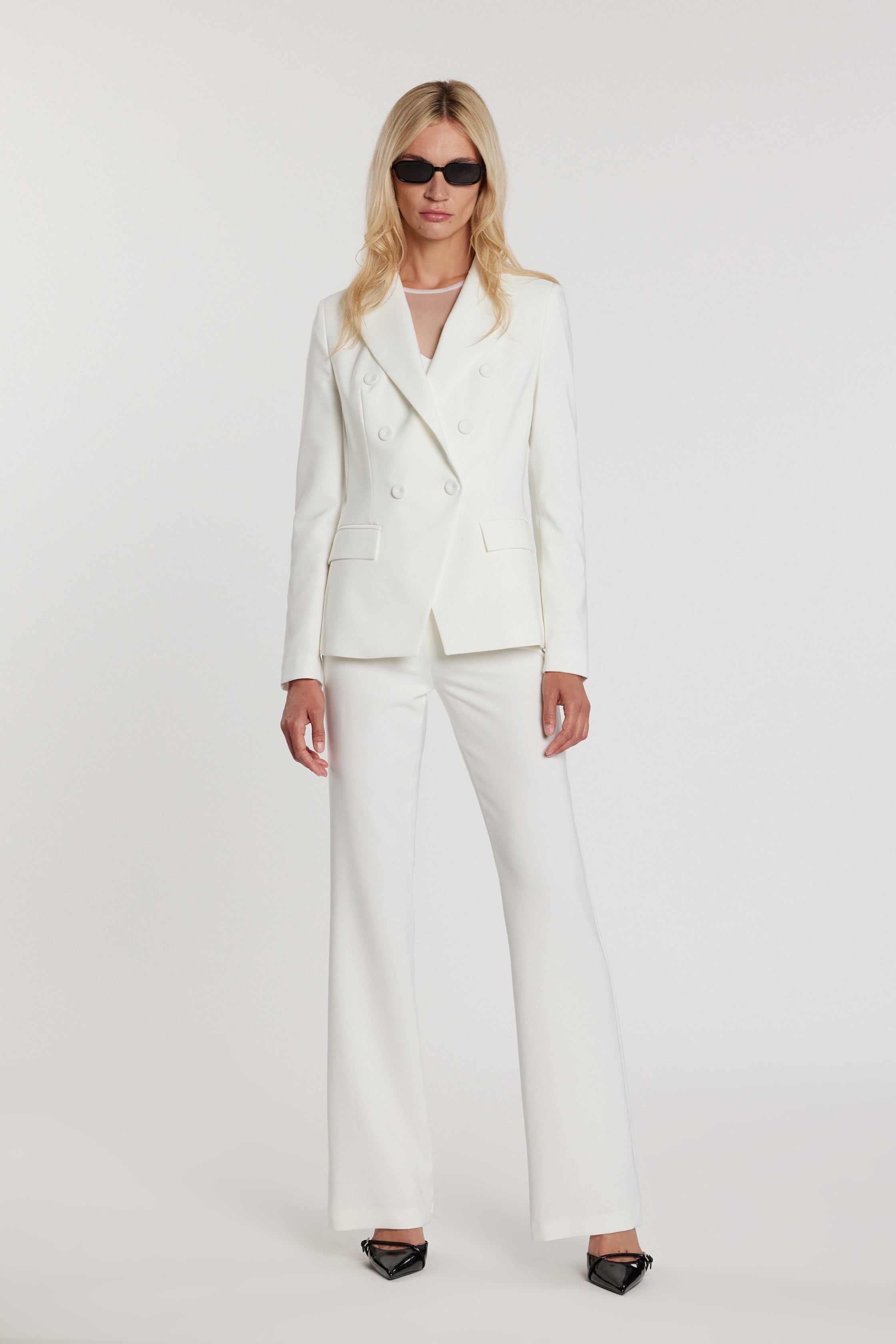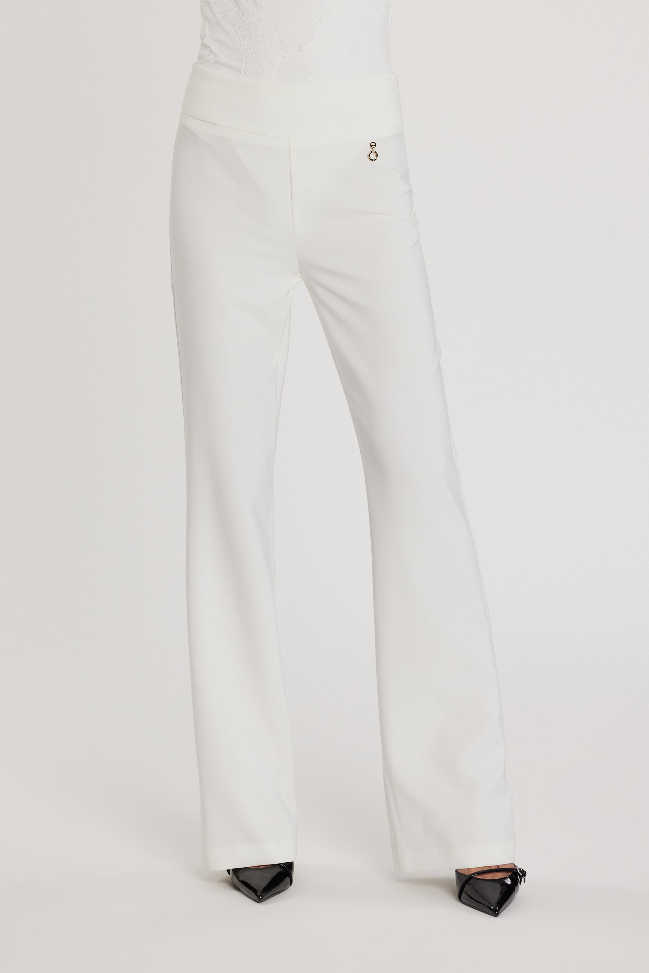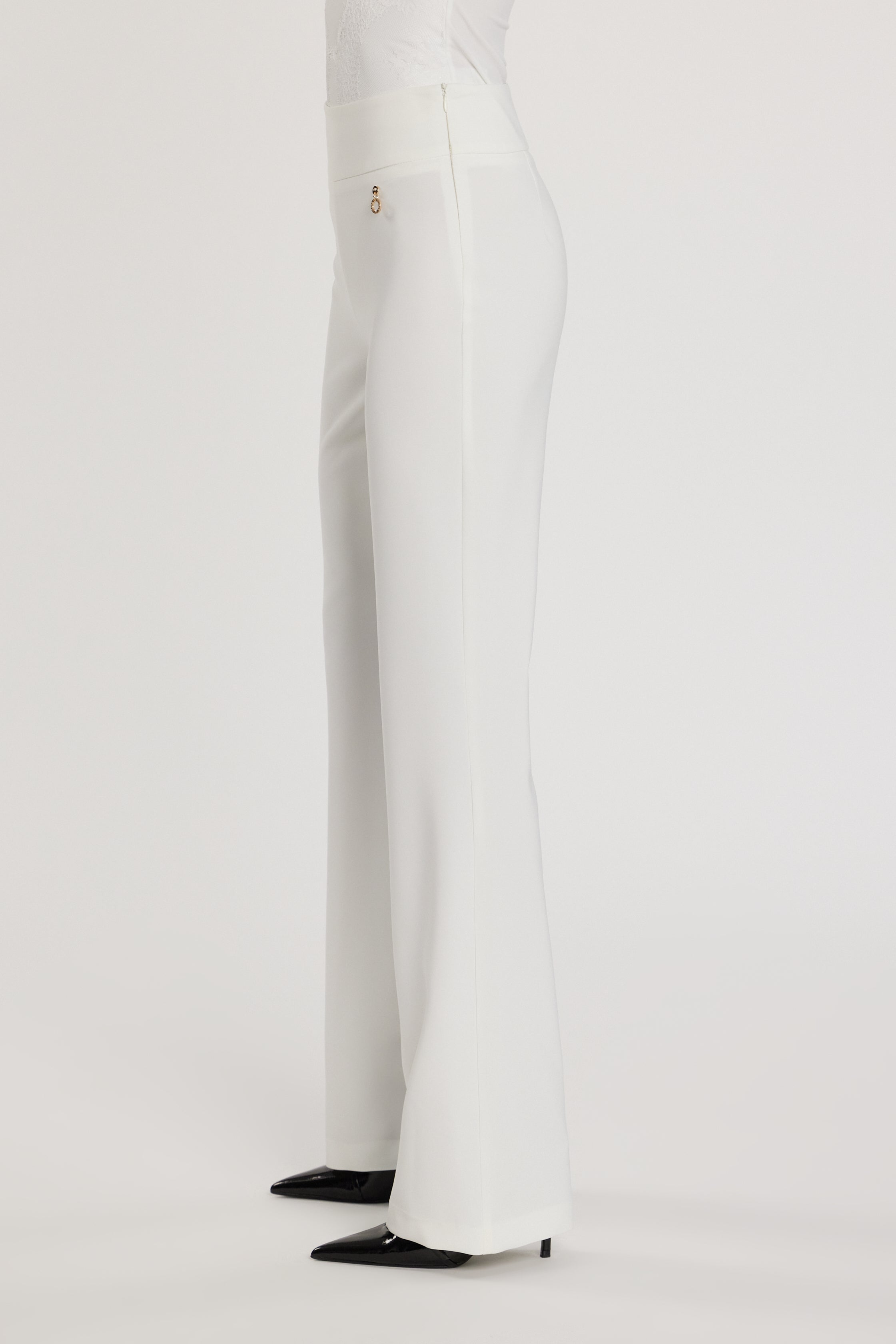 Pantalone Balbina vita alta con bustino alto e gamba a zampa, un modello scenografico che slancia la silhouette. Il bustino valorizza il punto vita, mentre la zampa dona movimento e un’allure retrò chic.