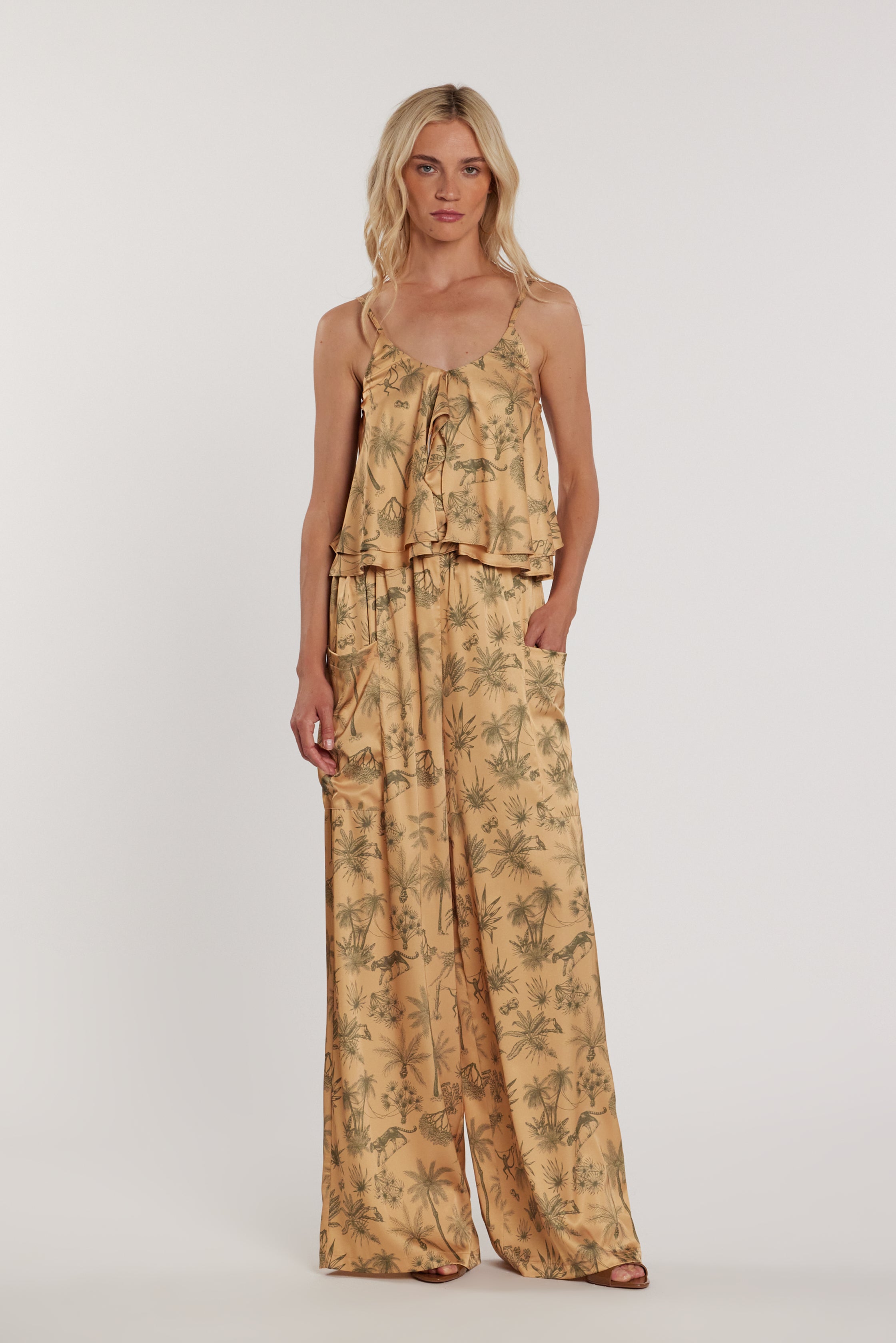 Pantalone Scarlett vita alta palazzo con coulisse e tasconi fantasia tropicale, un modello fresco e dinamico dal carattere deciso. La fantasia vivace e la linea ampia lo rendono perfetto per look estivi glamour e disinvolti.