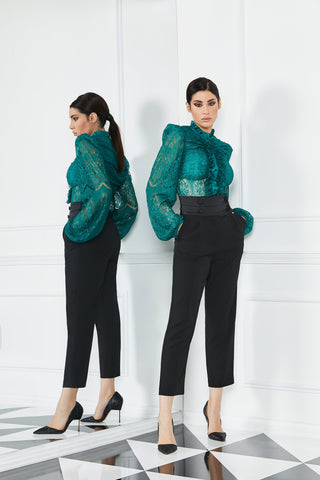 Panta CLAUDE vita alta zampa con tagli più bottoni più pattine profili raso